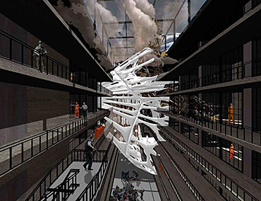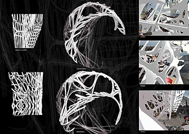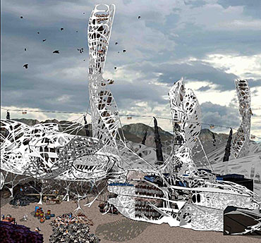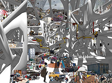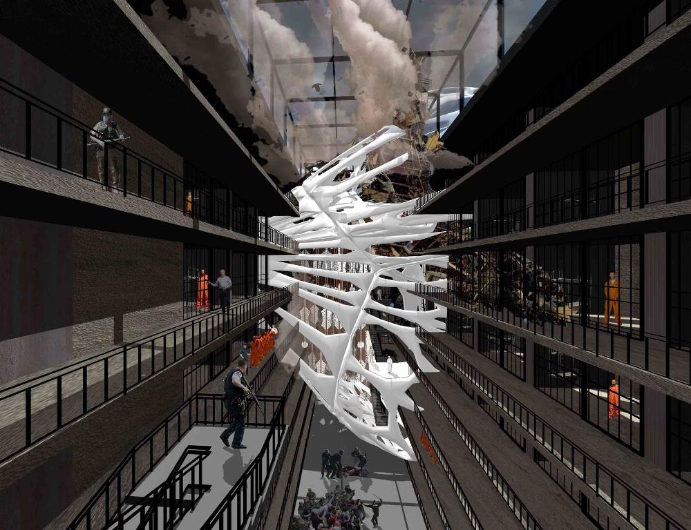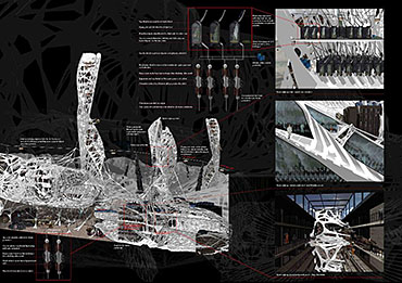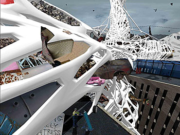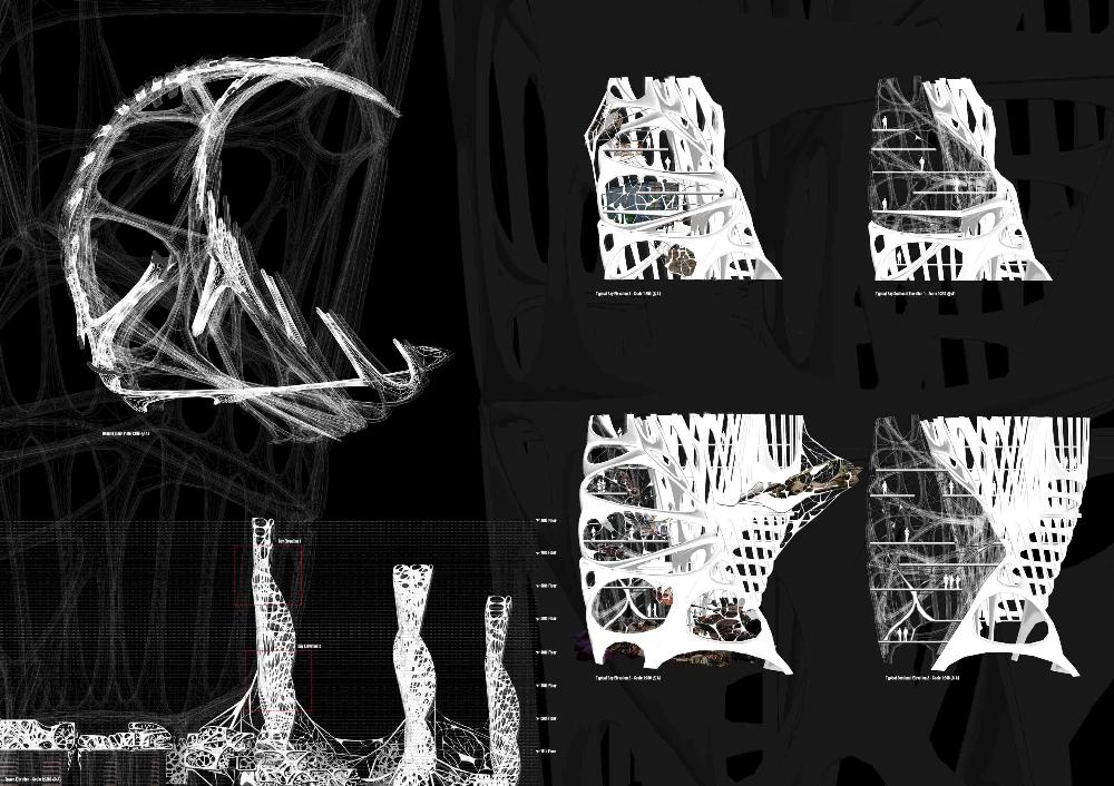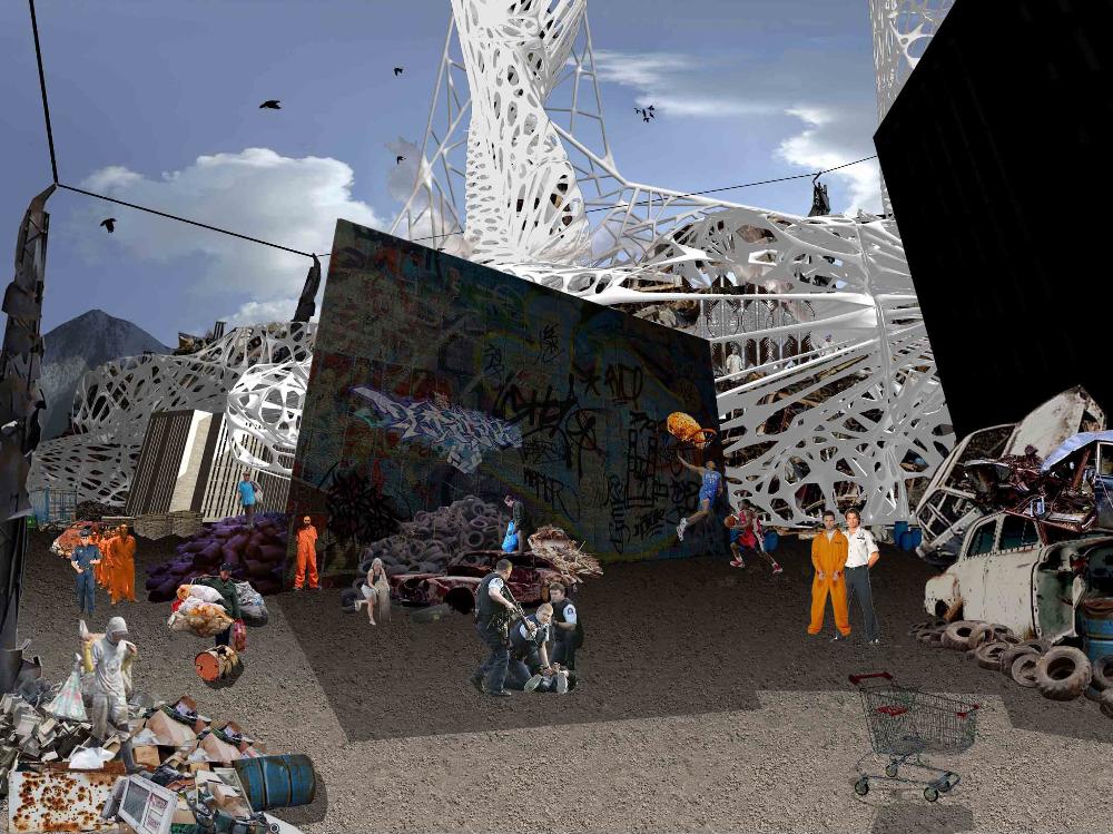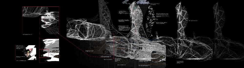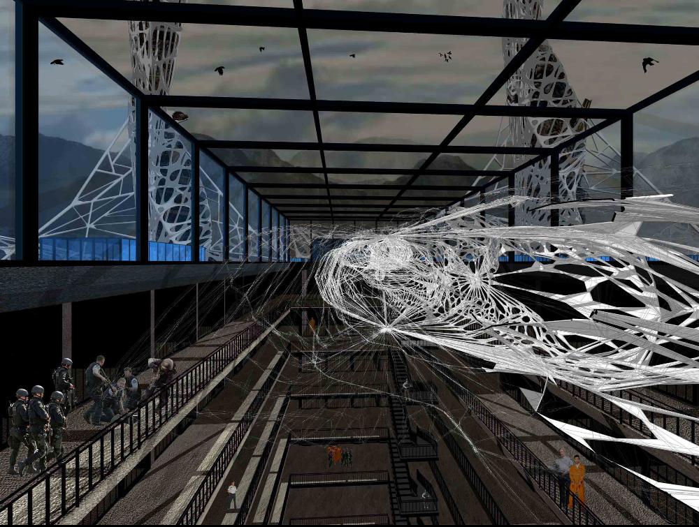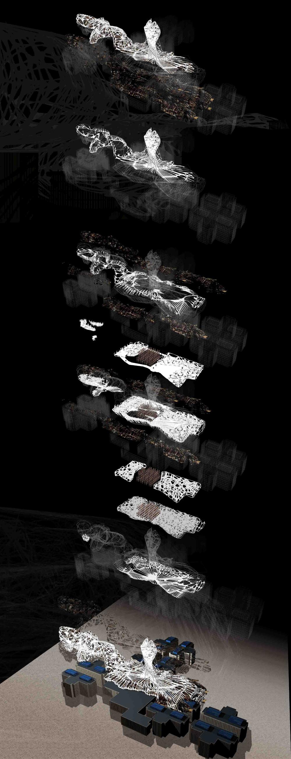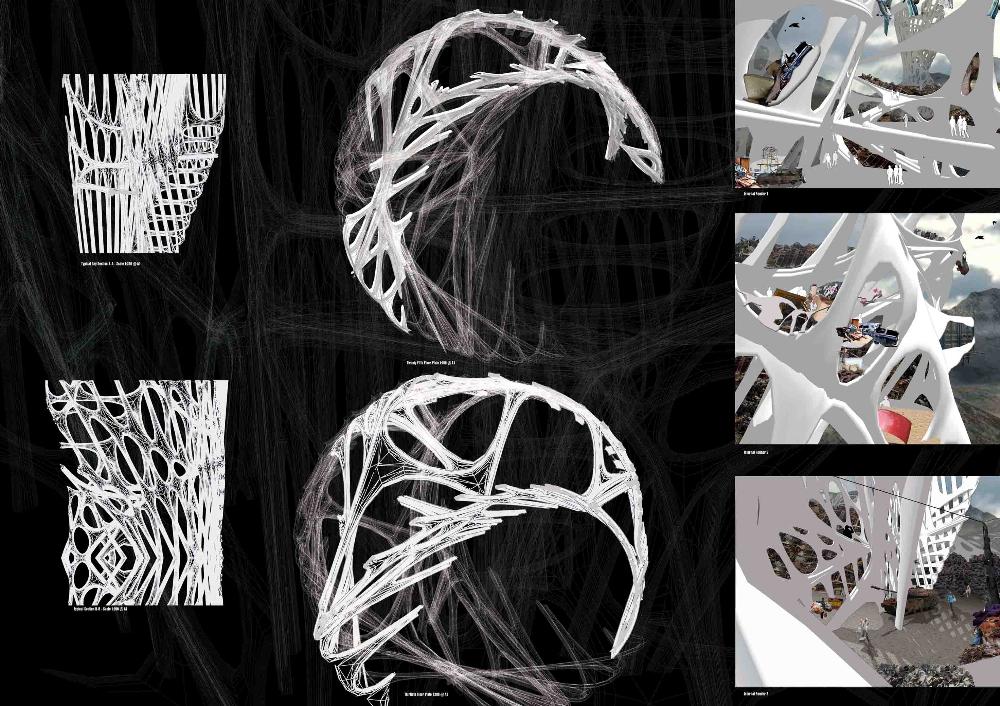 Mexas V1.01: Opium Factory Part 2 Project 2010 Jamie Rodgers Birmingham City University | UK A future scenario set in 2030 that explores the notion of borders and territories with specific reference to the American/Mexico border. It investigates the idea of consumerism and the exploitation of the Mexicans by the Americans since they colonized the area with regards to socioeconomic, political and environmental issues. Initial research comprised of studying the border utilising different media types in order to derive at a response. This included an historic overview coupled with an investigation into both micro and macro events at the border. Careful overlaying of this information with related text (Holloway, J - Take the world without taking power) identified themes of consumerism, exploitation, power, struggle and utopian visions such as the 'American Dream'.These themes were implemented within this thesis project through various panoramic scenarios incorporating several factual characters. Investigation into the environmental impact of the Americans at the border opened up research into the voronoi geometry and the 'emergent architectural concept'.Deriving at a deviant future scenario where a Mexican subculture is formed on the derelict land adjacent to California city prison. The subculture is established and sustained from an architectural device procured from found and discarded objects at the border. These found objects become the stimulus to the subculture where drugs are also declassified. The latter acts as pull factor to the Americans drawing in tourists to take advantage of the deviant culture and its relaxed governance.The deviant culture utilises John Holloway’s principle that 'a utopian vision cannot exist when consumerism reigns'. Consequently, the subculture dismantles consumer products with the sum of its parts becoming the desired entities (emergent concept theory). These parts become the found objects and entities which inform the architecture and its associated spaces. The device manifests into the architectural form which is derived from the emergent architectural concept and organic voronoi geometry. The cladding infill panels to the building envelop and the walls to the internal spaces are defined by found objects fusing with the architectural form. Thus creating an economy and architectural language that is symbolic of the notion that ‘one’s mans waste is another man’s gold’. In an age of globalization characterized by the dizzying technologies of the First World, and the social disintegration of the Third, is the concept of utopia still meaningful?The project started with a critique of the existing USA and Mexico boarder exploring on a micro and macro scale the existing social, economic and philosophical conditions which exists and how this overlap and interact.This analysis developed a series of conceptual generators to be tested in the project. The main project creates a master plan for the area which is based around the development of three communities each with their own specific set ofCharacters and terms of reference generated from the initial analysis, - deviant, subversive and Utopian. Jamie’s project then focused on the deviant community which generated a site specific brief for an opium factory and living settlement. Its characters would occupy this and begin to develop the architecture. The main architectural framework was developed through an indigenous species of fly. Through a detailed analysis on the wing pattern on a micro and macro scale this created a series of design generators which were overlaid on the three sites and modified to the specific site conditions to create a dynamic architectural response.The success of the project is through its rigour and careful editing of the project through the concept and design development process. Through the intelligent selection of resource material this gave the project a strong theoretical position with which Jamie developed a rich, textured and layered project.It should be noted that Jamie is a part time student, balancing work at MAKE 4 days per week with one day attendance at University. Because of this his achievements are all the more remarkable. Tutor(s) Matt LucasMr Kevin W Singh