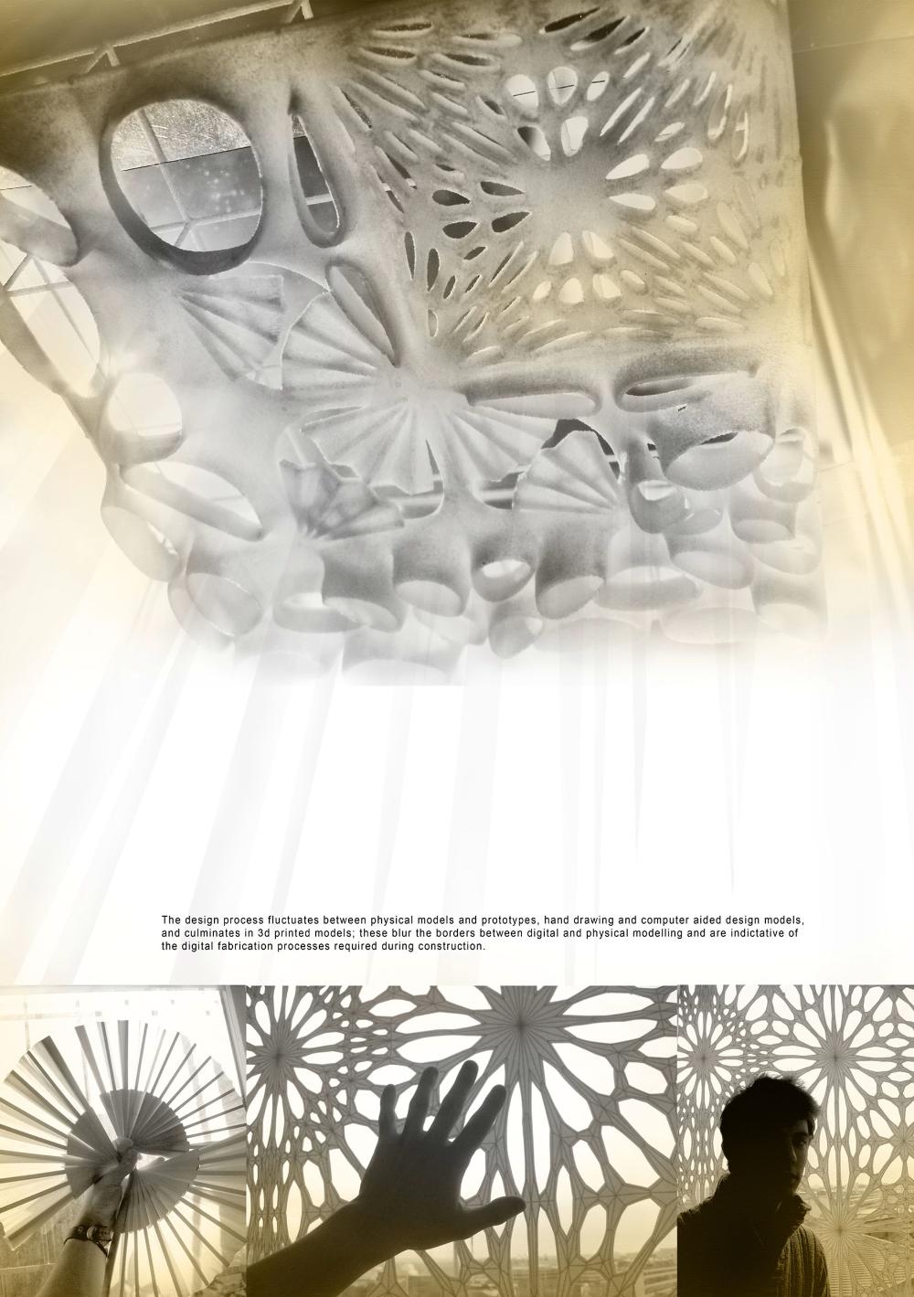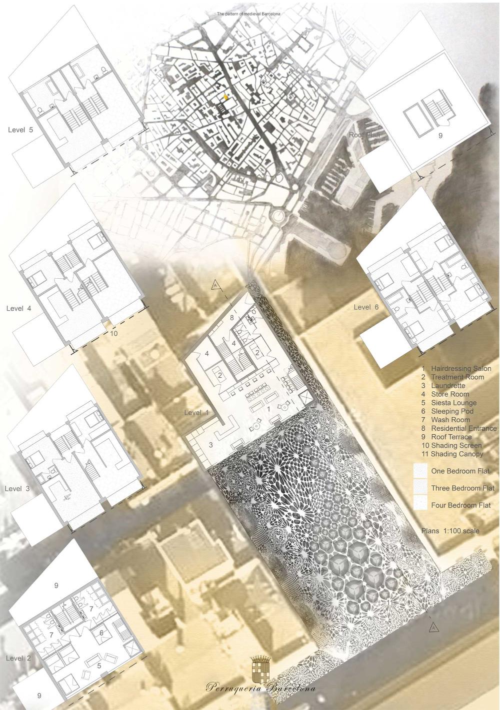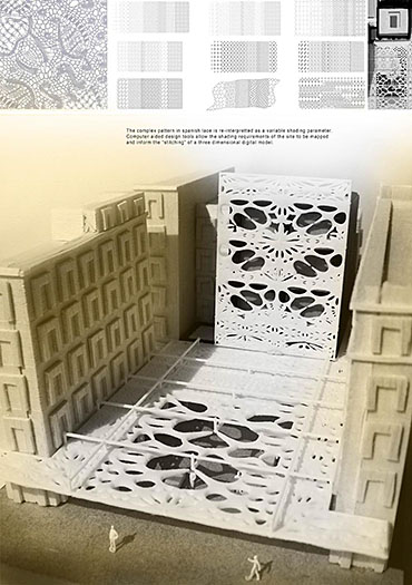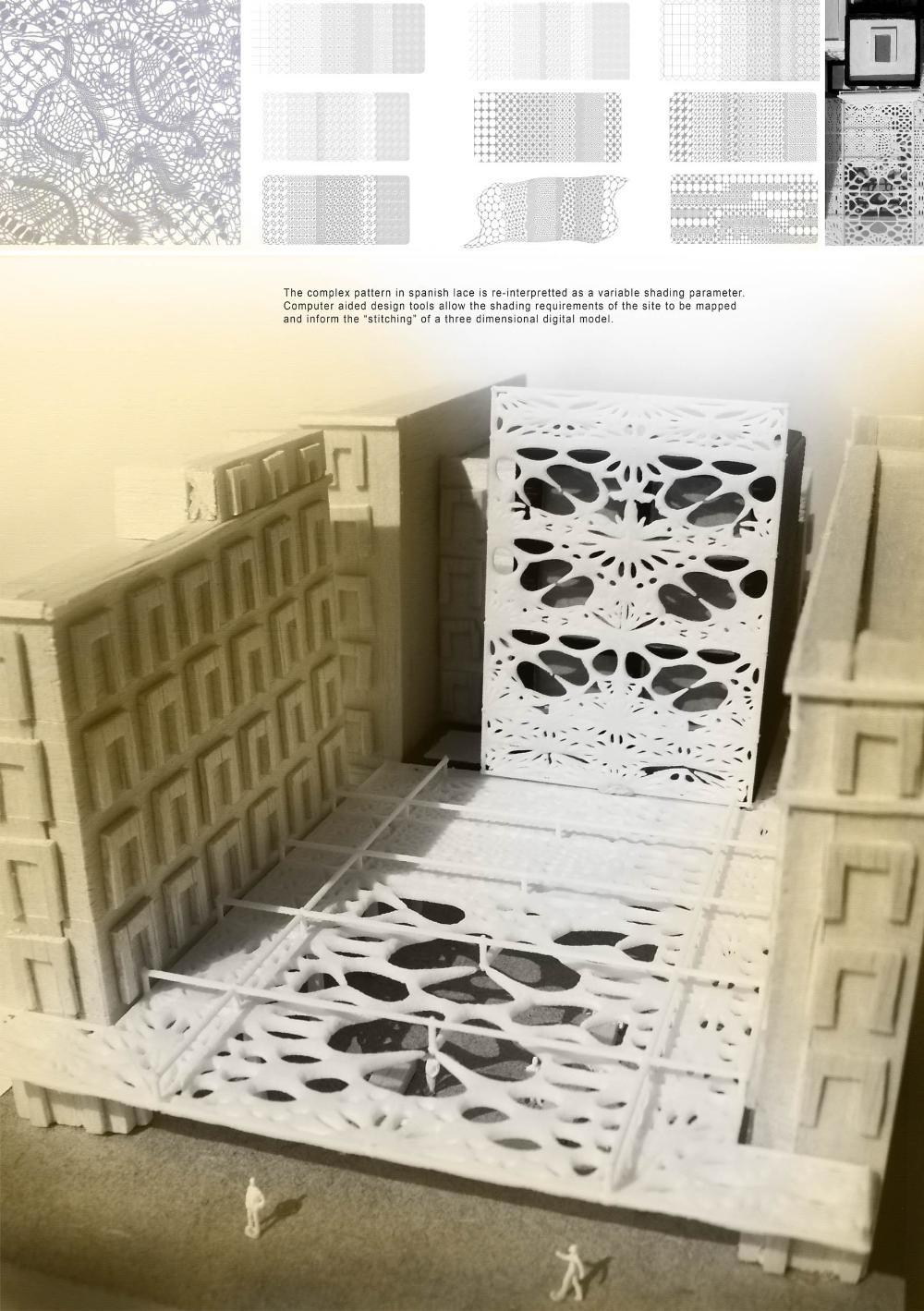 Perruqueria Barcelona Part 1 Project 2010 Steven Mccloy Leeds Beckett University | UK The project is a development of a small square adjacent to the Mercat de la Boqueria in Barcelona's gothic quarter- providing services to the square and adjacent market that has started to overflow with fruit and vegetable stalls. Included is a perruqueria (hairdresser's), a florist and a small laundrette. The day starts early for people working in the market, as a result it is traditional to take a two or three hour siesta break; currently there is no space offered for the market workers and many travel home, sleep on park benches or skip siesta altogether. The proposal offers a siesta lounge- including quiet pods, book sharing and washing facilities. The building contains three flats of different sizes to accommodate a cross section of the community; these feature interesting split floor levels that create high ceilings in main living spaces. Balconies make reference to local vernacular, and a decorative screen shades the building from the Mediterranean sun. The screen cascades down the facade and folds to form a canopy over the square, with the intension of creating a shower of light that delights the viewer. The canopy design is influenced by Spanish lace and fans, it is made of a wire lattice draped with a weather proof fabric, there are also responsive fan-like sunshades that can be opened or closed directly by the stallholders in the market. The project celebrates the everyday roles and rituals of Barcelona women, the perruqueria improves the community self-esteem and this is reflected in the strong identity of the architecture. Perhaps there is room for design to draw upon women's history and allow skills to be transferred into the built environment. I delved into the time consuming techniques and iterative process of stitching lace patterns and tried to translate them into CAD software, with the intention of scaling-up textile art into crafted architectural ornament. The rapid prototyped models help communicate the delicacies of the proposed ornament and are indictive of the digital fabrication processes required to accurately realise the project. This year the unit was pre-occupied with exploring the every day in an urban environment. A series of adjustments were proposed after close observation of the ‘as found’. This was understood as a cross cultural exercise with the original observations being undertaken in Leeds before moving on to similar observations in Barcelona. Steven identified ideas of shade and shelter which could be modified to the need of a particular cultural and climatic situation, shelter in England and shade in Barcelona.Within the extraordinary and frenetic pace of Mercat de la Boqueria in Barcelona we studied the everyday life of the stall holder and neighbouring residents over 24 hours. Steven identified a small sub square to the north and on the periphery of the main market. He felt that this square offered many new opportunities for urban invigoration. Steven’s preoccupation with the ornament helped determine the design process which fluctuated between physical models and prototypes, hand drawing and computer aided design models, and culminated in 3D printed models; these blurred the boundaries between digital and physical modelling and are indicative of the digital fabrication processes required during construction. The models captured the essence of Steven’s design intentions, to remodel and up date the square, not only conveying the sense of the light and space of the whole but also the materiality and tactility of the part. The geometric modelling also reflected the intention of revitalising the environment and the dynamic forms were developed to enhance this intention. It was possible to imagine the (re) inhabitation of this area of the market and to delight in the sensation.Sarah MillsDennis Burr Tutor(s) Ms Sarah MillsMr Steven Morant