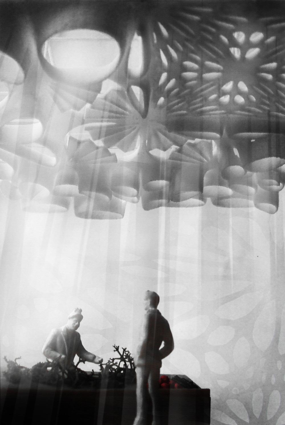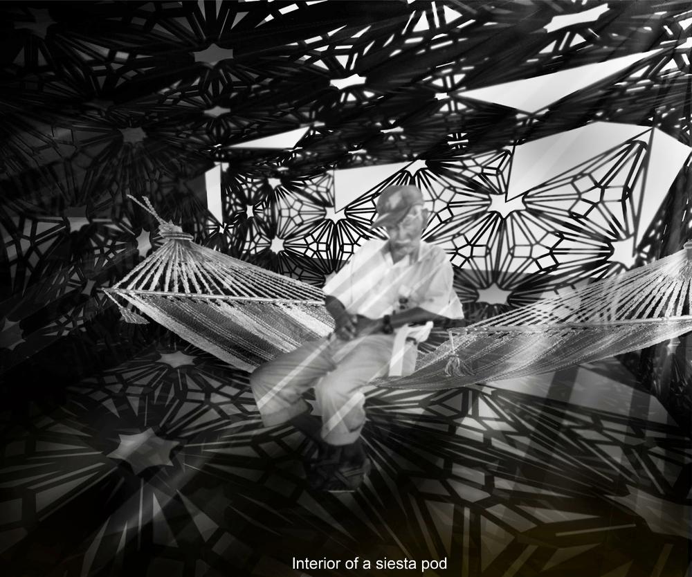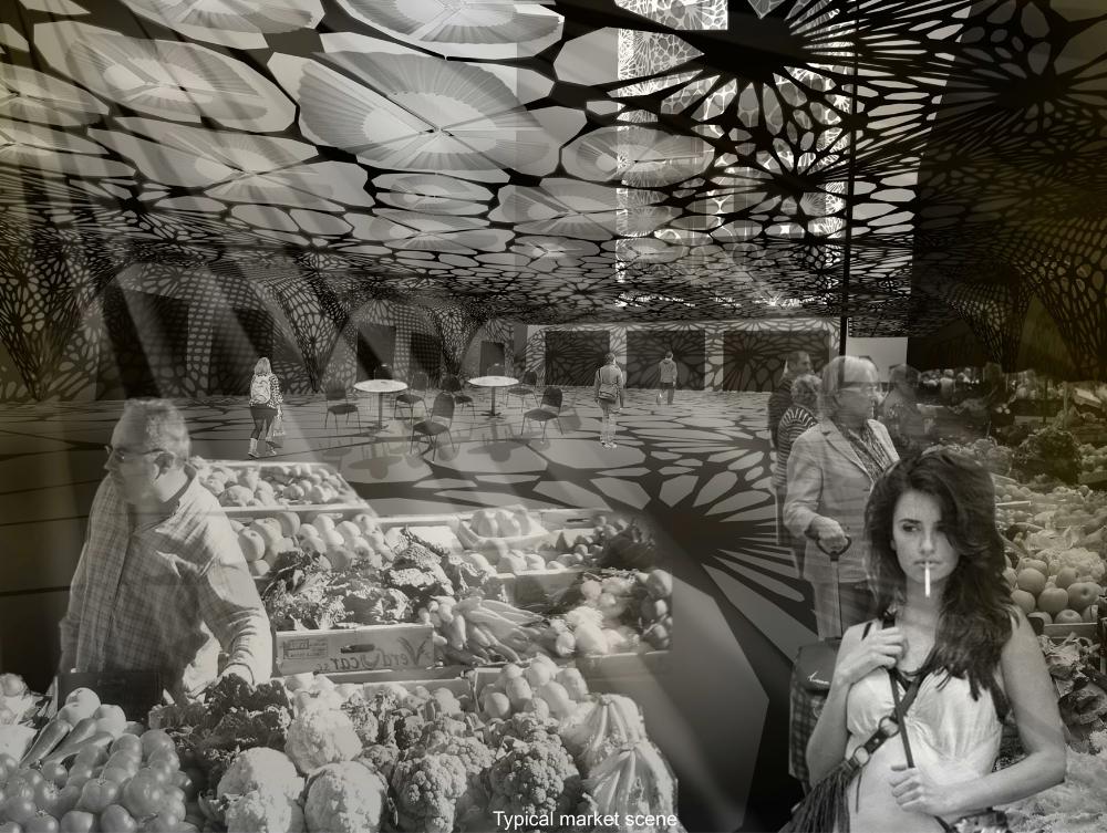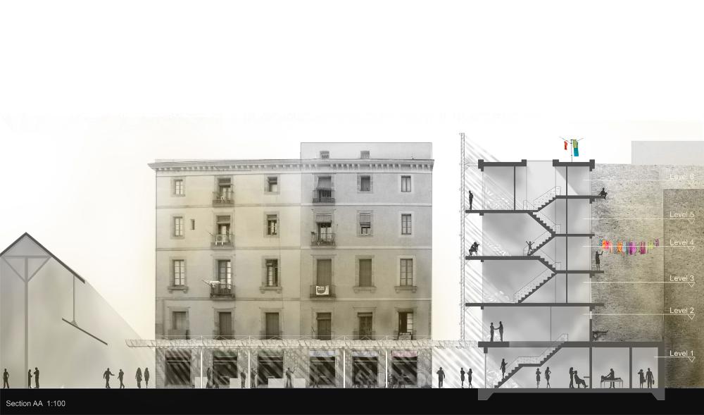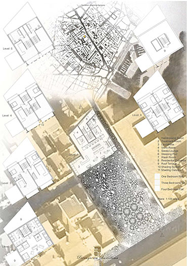 Perruqueria Barcelona Part 1 Project 2010 Steven Mccloy Leeds Beckett University | UK The project is a development of a small square adjacent to the Mercat de la Boqueria in Barcelona's gothic quarter- providing services to the square and adjacent market that has started to overflow with fruit and vegetable stalls. Included is a perruqueria (hairdresser's), a florist and a small laundrette. The day starts early for people working in the market, as a result it is traditional to take a two or three hour siesta break; currently there is no space offered for the market workers and many travel home, sleep on park benches or skip siesta altogether. The proposal offers a siesta lounge- including quiet pods, book sharing and washing facilities. The building contains three flats of different sizes to accommodate a cross section of the community; these feature interesting split floor levels that create high ceilings in main living spaces. Balconies make reference to local vernacular, and a decorative screen shades the building from the Mediterranean sun. The screen cascades down the facade and folds to form a canopy over the square, with the intension of creating a shower of light that delights the viewer. The canopy design is influenced by Spanish lace and fans, it is made of a wire lattice draped with a weather proof fabric, there are also responsive fan-like sunshades that can be opened or closed directly by the stallholders in the market. The project celebrates the everyday roles and rituals of Barcelona women, the perruqueria improves the community self-esteem and this is reflected in the strong identity of the architecture. Perhaps there is room for design to draw upon women's history and allow skills to be transferred into the built environment. I delved into the time consuming techniques and iterative process of stitching lace patterns and tried to translate them into CAD software, with the intention of scaling-up textile art into crafted architectural ornament. The rapid prototyped models help communicate the delicacies of the proposed ornament and are indictive of the digital fabrication processes required to accurately realise the project. This year the unit was pre-occupied with exploring the every day in an urban environment. A series of adjustments were proposed after close observation of the ‘as found’. This was understood as a cross cultural exercise with the original observations being undertaken in Leeds before moving on to similar observations in Barcelona. Steven identified ideas of shade and shelter which could be modified to the need of a particular cultural and climatic situation, shelter in England and shade in Barcelona.Within the extraordinary and frenetic pace of Mercat de la Boqueria in Barcelona we studied the everyday life of the stall holder and neighbouring residents over 24 hours. Steven identified a small sub square to the north and on the periphery of the main market. He felt that this square offered many new opportunities for urban invigoration. Steven’s preoccupation with the ornament helped determine the design process which fluctuated between physical models and prototypes, hand drawing and computer aided design models, and culminated in 3D printed models; these blurred the boundaries between digital and physical modelling and are indicative of the digital fabrication processes required during construction. The models captured the essence of Steven’s design intentions, to remodel and up date the square, not only conveying the sense of the light and space of the whole but also the materiality and tactility of the part. The geometric modelling also reflected the intention of revitalising the environment and the dynamic forms were developed to enhance this intention. It was possible to imagine the (re) inhabitation of this area of the market and to delight in the sensation.Sarah MillsDennis Burr Tutor(s) Ms Sarah MillsMr Steven Morant