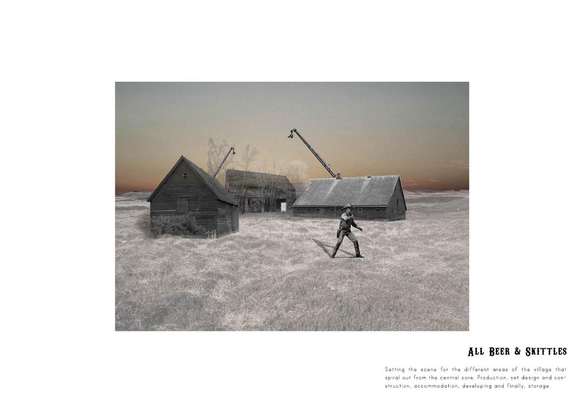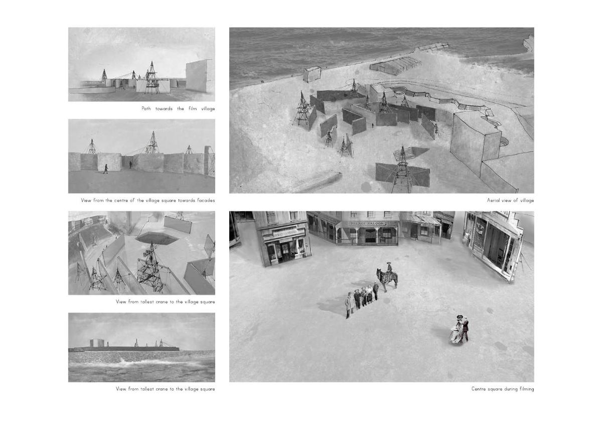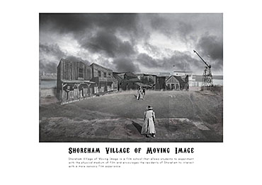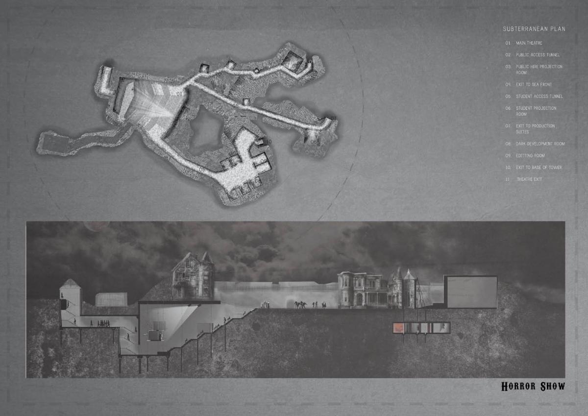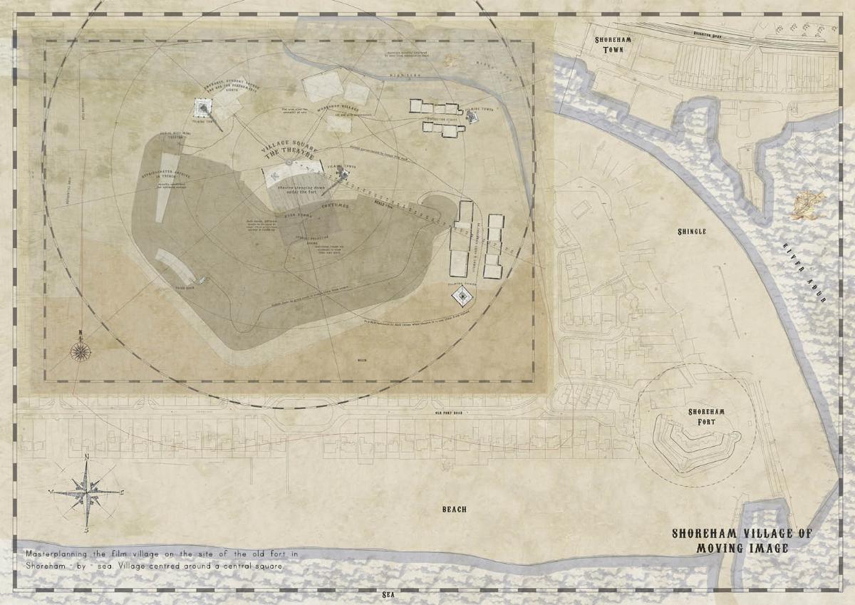 Shoreham Village of Moving Image Part 1 Project 2012 Holly Jean Crosbie University of Brighton | UK The film village, located on the site of Shoreham Fort, was once home to Sunny South Film Company in 1914. The village retains the nature of the fort with the main infrastructure hidden below the surface with only the tops of the towers visible from the sea.Modern storage of film archives involves copying films on to digital formats as film becomes brittle and decays over time, however it is also copied on to new cellulose film as digital mediums can be just as temperamental, proving the ongoing need for the original medium. The tangible nature of the cellulose film allows students to learn about the value of time; every second of film takes up a physical space, which is limited by the length of the film reel. Film becomes precious, and so a careful consideration of what is to be filmed is needed. Inspired by the edited reality of film sets and how they create the illusion of a complete world, the film school recreates the notion of a village. Surrounding a central square, (the theatre), the functional workings of the film school spider web out both above and below ground in a labyrinth of tunnels and cranes. Burrowing underground creates natural darkness for film processing and projection, at the same time aiding refrigeration for storage.The infrastructure of the site allows for the flexibility of different sets to be created for different films through the use of facades. These facades can be positioned around the central core creating the illusion of a complete world. The facades divide the on and off screen worlds. The front of the facade acts as the stage and behind is the functioning film school. Historically facades were used to suggest what might be on the other side; here it is used to disguise it.As the films are created on site and then screened in the subterranean theatre, the visiting audience is immersed in the film and become part of the surroundings creating a complete cinematic experience. Tutor(s) Kate Cheyne Carl Turner