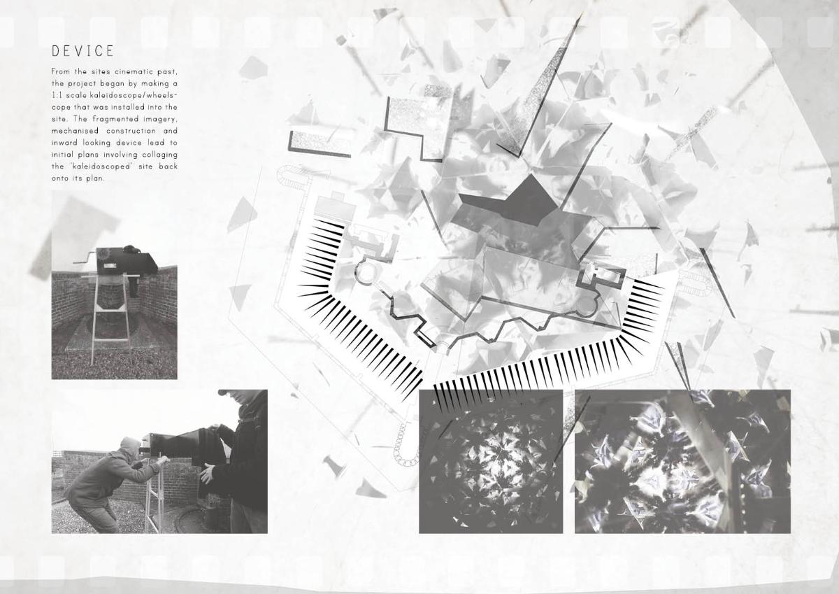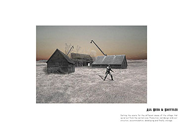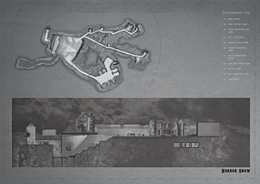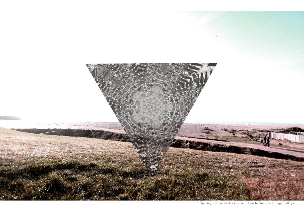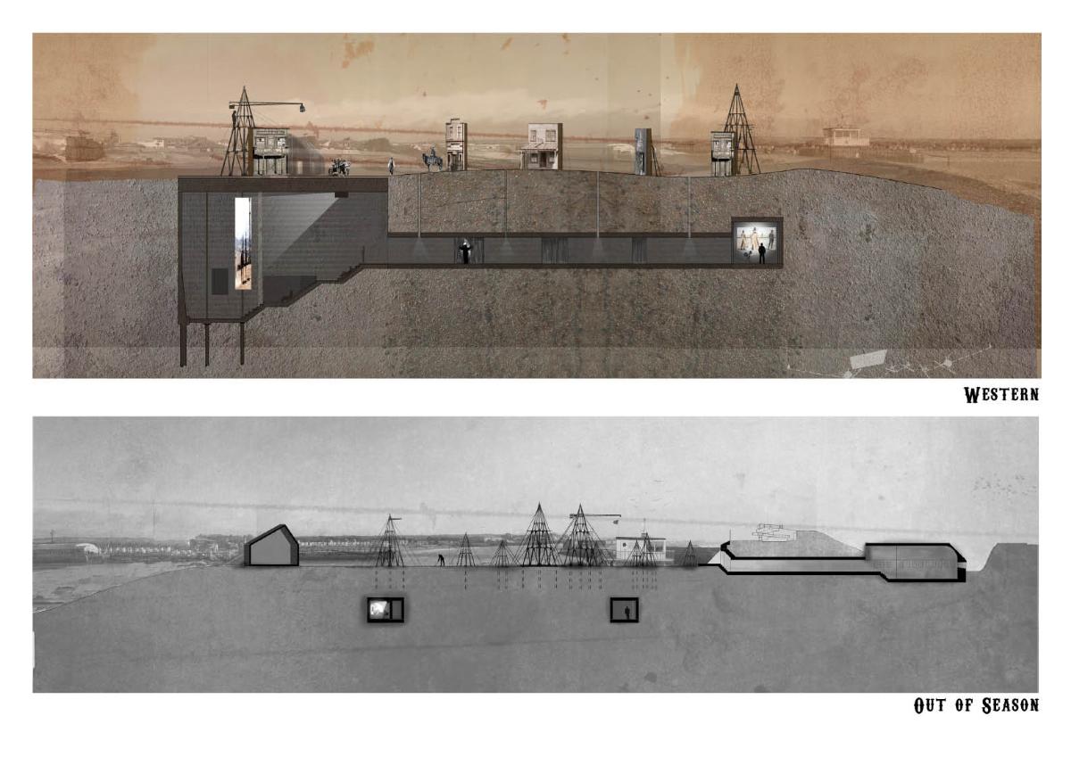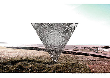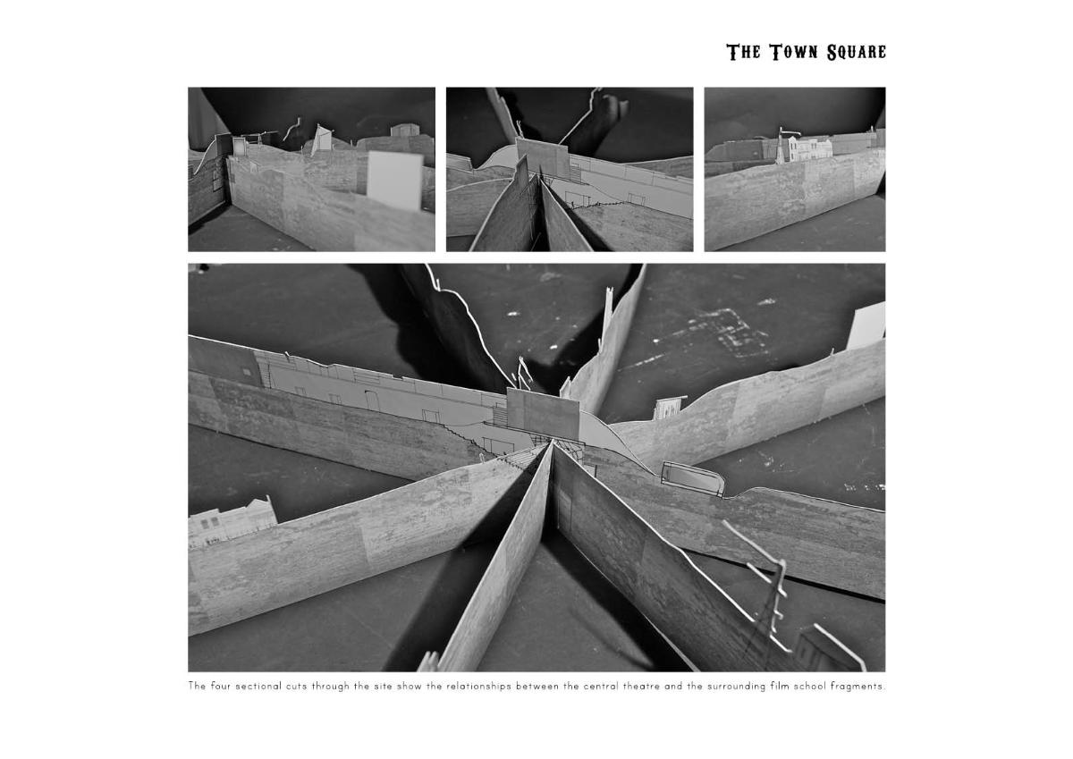 Shoreham Village of Moving Image Part 1 Project 2012 Holly Jean Crosbie University of Brighton | UK The film village, located on the site of Shoreham Fort, was once home to Sunny South Film Company in 1914. The village retains the nature of the fort with the main infrastructure hidden below the surface with only the tops of the towers visible from the sea.Modern storage of film archives involves copying films on to digital formats as film becomes brittle and decays over time, however it is also copied on to new cellulose film as digital mediums can be just as temperamental, proving the ongoing need for the original medium. The tangible nature of the cellulose film allows students to learn about the value of time; every second of film takes up a physical space, which is limited by the length of the film reel. Film becomes precious, and so a careful consideration of what is to be filmed is needed. Inspired by the edited reality of film sets and how they create the illusion of a complete world, the film school recreates the notion of a village. Surrounding a central square, (the theatre), the functional workings of the film school spider web out both above and below ground in a labyrinth of tunnels and cranes. Burrowing underground creates natural darkness for film processing and projection, at the same time aiding refrigeration for storage.The infrastructure of the site allows for the flexibility of different sets to be created for different films through the use of facades. These facades can be positioned around the central core creating the illusion of a complete world. The facades divide the on and off screen worlds. The front of the facade acts as the stage and behind is the functioning film school. Historically facades were used to suggest what might be on the other side; here it is used to disguise it.As the films are created on site and then screened in the subterranean theatre, the visiting audience is immersed in the film and become part of the surroundings creating a complete cinematic experience. Tutor(s) Kate Cheyne Carl Turner