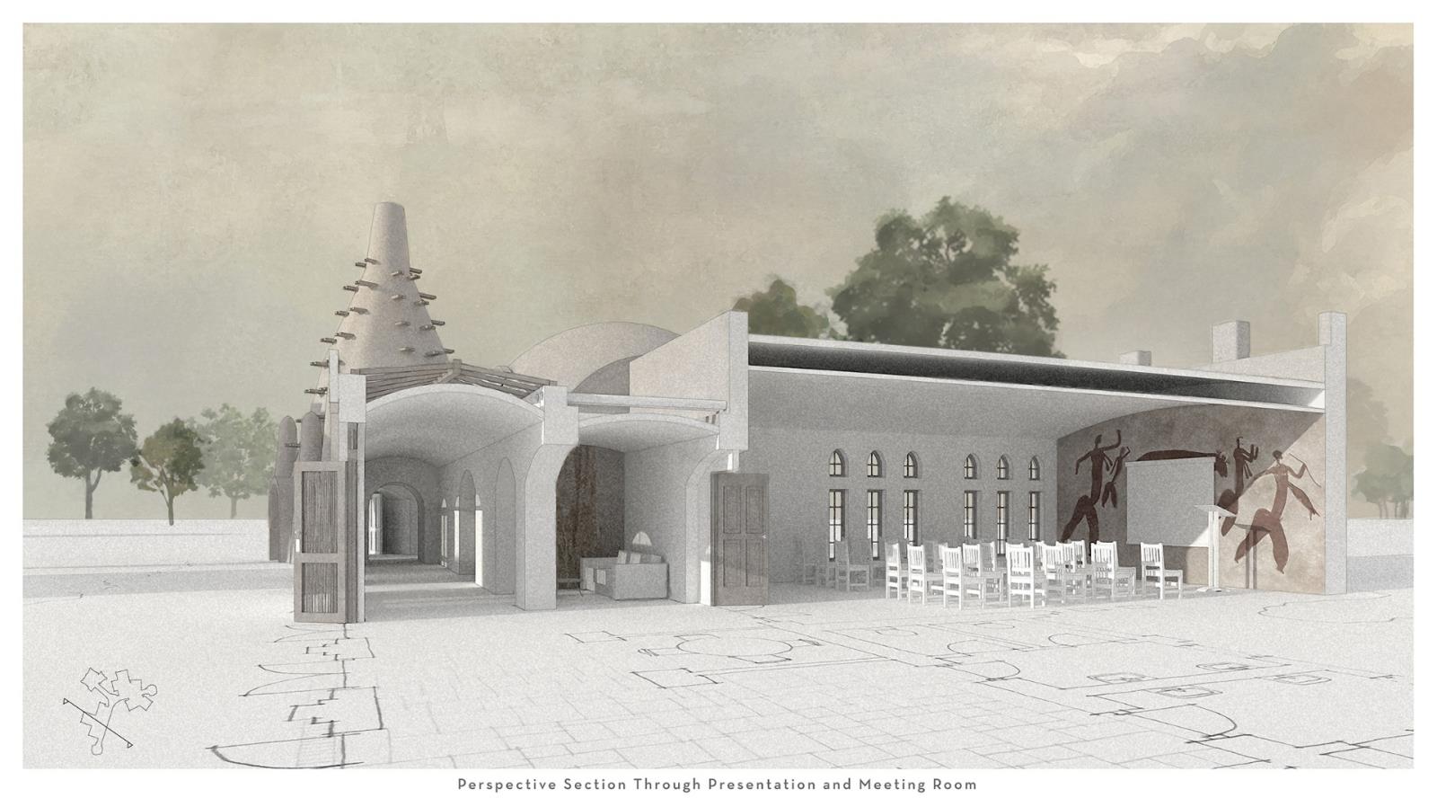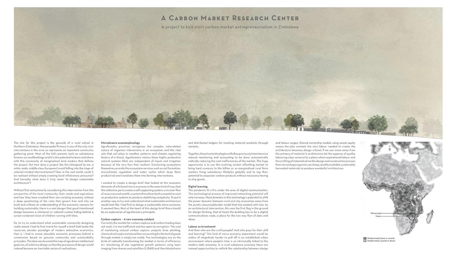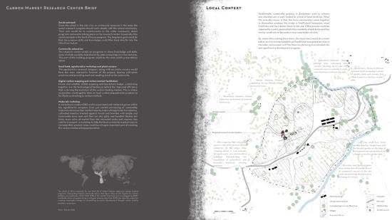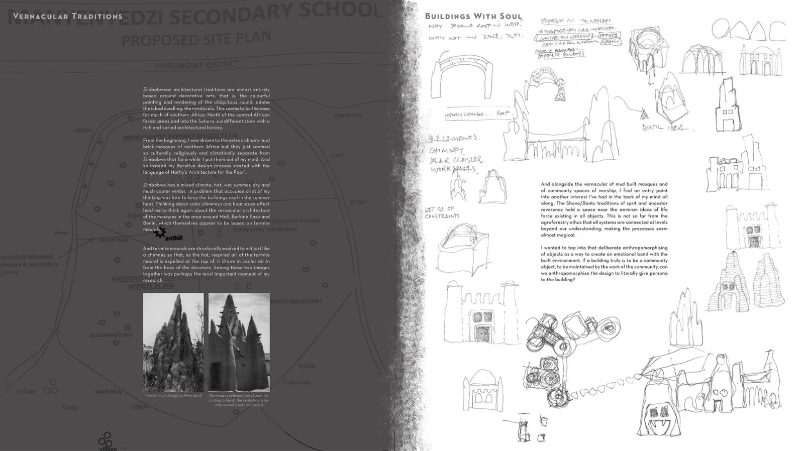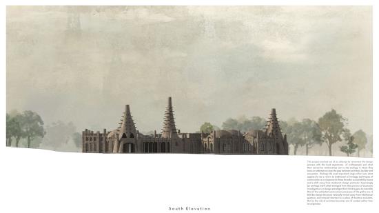 The work does not claim to be a social economic treatise but it does aim to set up a reasoned scenario in order to hold a discussion about the implications of such questions on the design process. Sited in rural Zimbabwe using mostly compressed mud bricks plus a notional 25kw solar power kiln, what emerges is a design process embedded in heritage construction practices that relies on skilled labour to produce an architecture evolved from traditions.