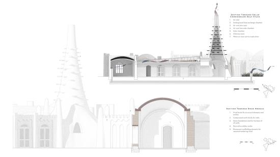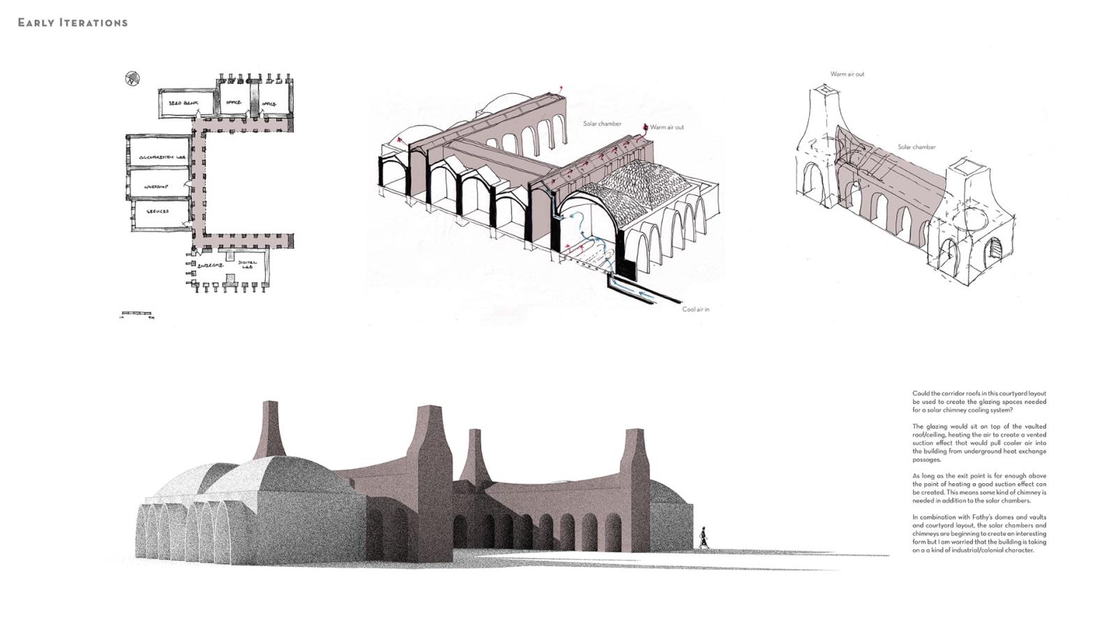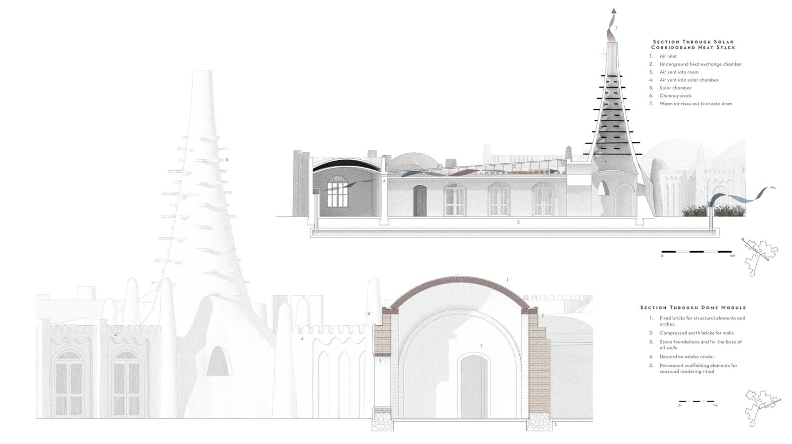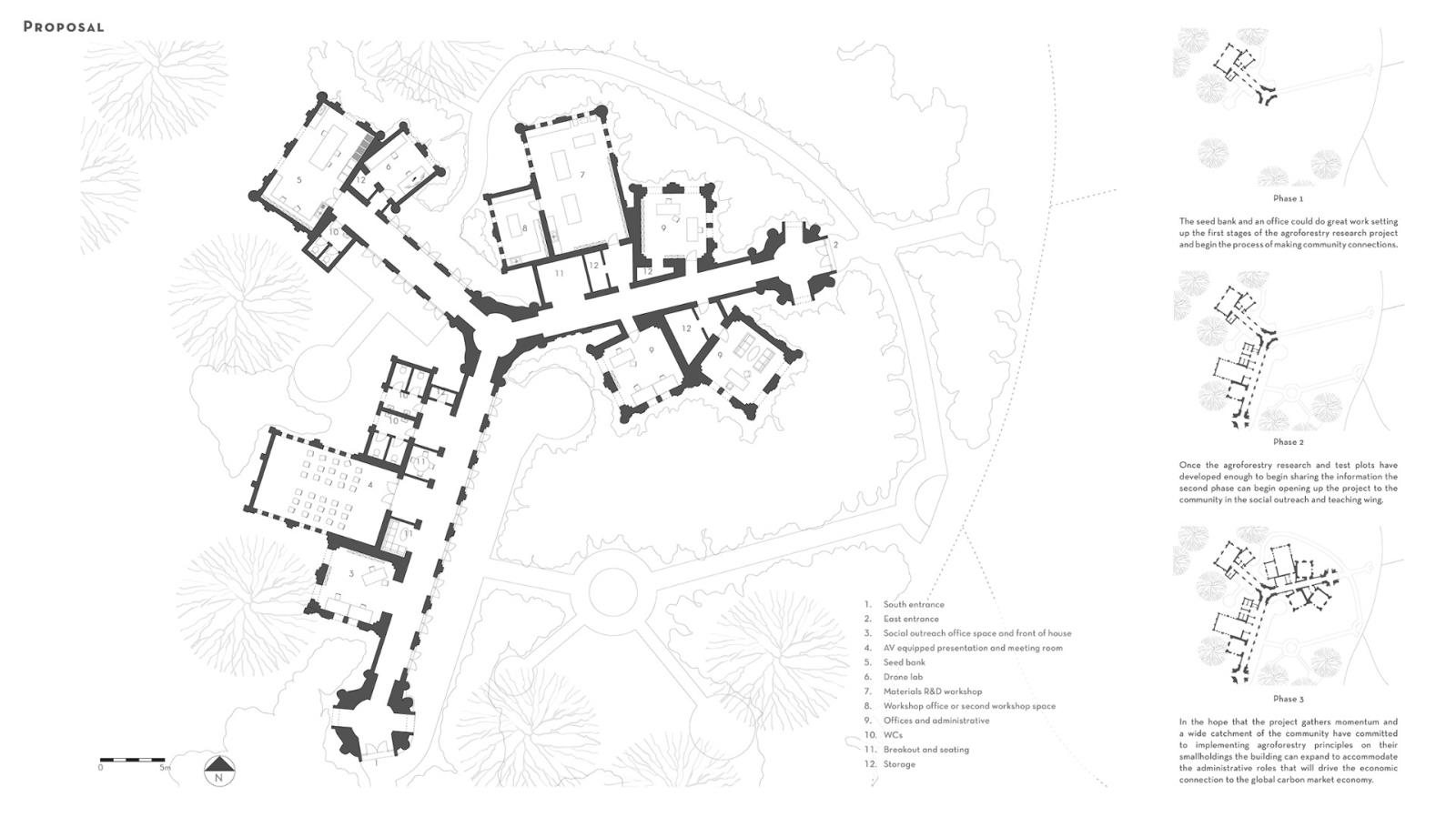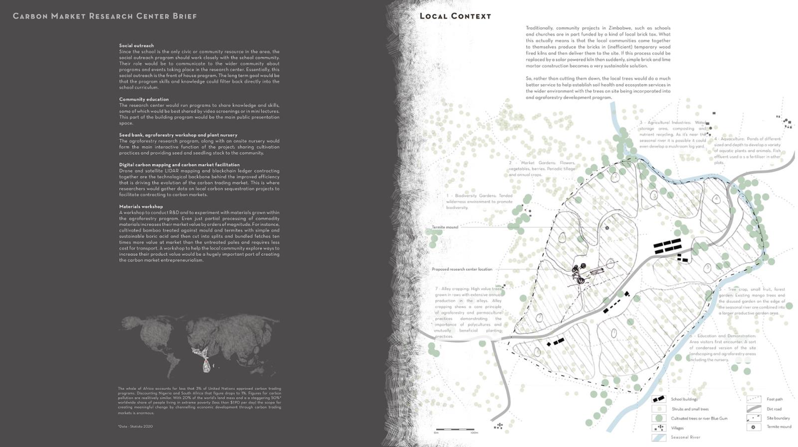 The work does not claim to be a social economic treatise but it does aim to set up a reasoned scenario in order to hold a discussion about the implications of such questions on the design process. Sited in rural Zimbabwe using mostly compressed mud bricks plus a notional 25kw solar power kiln, what emerges is a design process embedded in heritage construction practices that relies on skilled labour to produce an architecture evolved from traditions.
