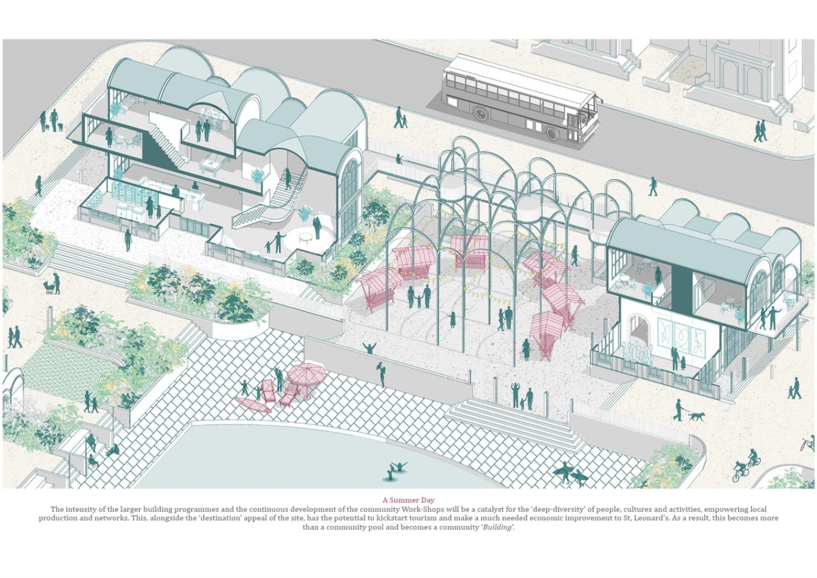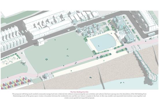 Community ‘Building’ explores the development of public spaces by designing ‘with’, instead of ‘for’, the community, for the long-term. The proposal is a gentle but efficient refurbishment and landscaping of The Old Bathing Pool Site in St. Leonard’s, which contained a historic Olympic sized pool that was enjoyed by many before it was demolished in the 80s. Today, the site is earmarked for a widely disliked development after being left unkept and underfunded for decades.