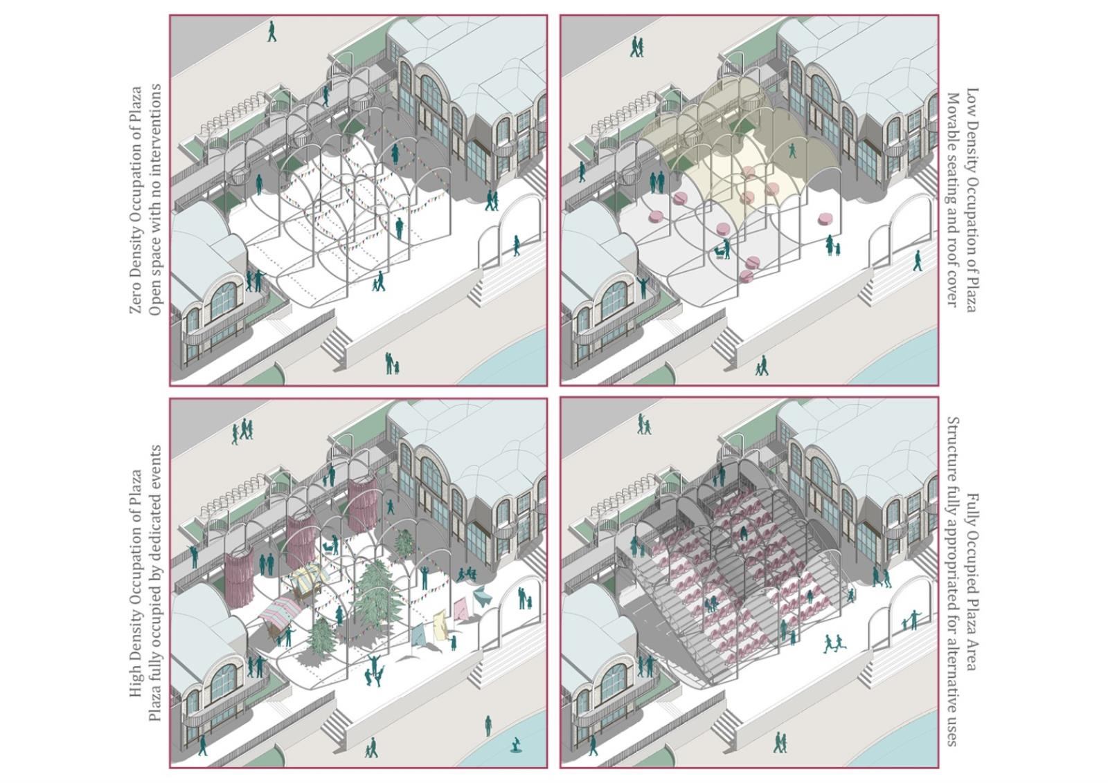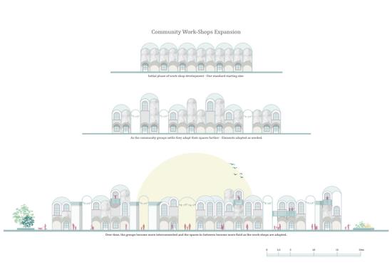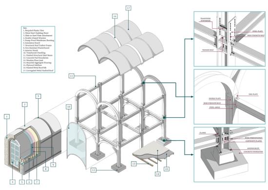 Meanwhile, the construction strategy creates the illusion of an established building by appropriating an adaptable warehouse structure with elements inspired by the local architecture. This is coupled with the sustainability strategy to recycle local waste into building materials, which can be continuously upcycled and re-used as the structure changes over time.