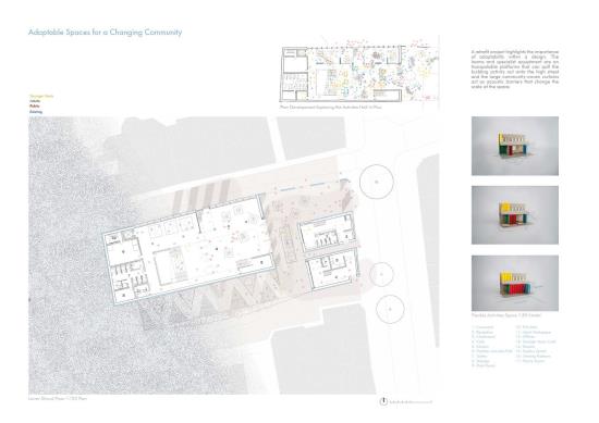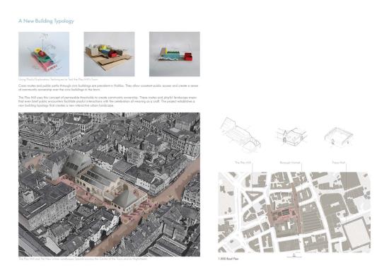 The Play Mill Part 1 Project 2022 Ellie Ruth Hardie University of Sheffield | UK "Intergenerational crafts enable cultural traditions and values to be shared between generations, which helps build a sense of personal and community identity while encouraging tolerance."Working sensitively with the shell and frame of an existing building, the Play Mill establishes a vision for a future intergenerational 'playcare' facility. Set in the heart of Halifax, and picking up on the existing street patterns and covered arcades, the project set about creating a new urban landscape for creative play. The Play Mill is not confined by the existing building walls and proposes a wider strategy for the transformation of the Halifax high street from a retail-based environment to a creative play forum. The project celebrates the woven history of Calderdale’s mills and the town’s identity – exploring the intersection between weave and play as a method of connecting the generations. The design explores a series of fabric layers, carefully composing and framing the building programme, which peels back to reveal a carefully integrated range of accessible spaces. The building form is refined by a reflective process, using carbon analysis and inventive material choices to create a transformative and expansive architecture. The architectural language is sensitive, yet celebrates its physical and social setting. Tutor(s) Leo Care