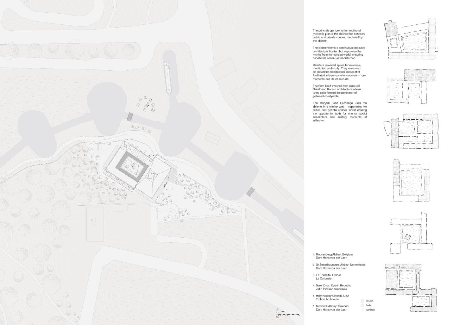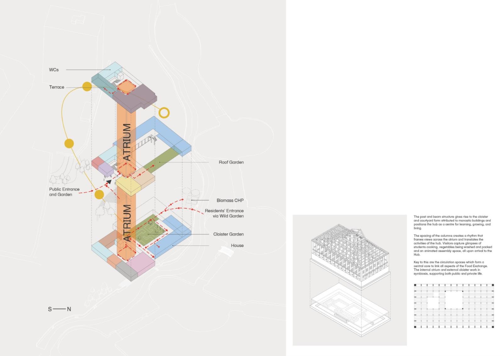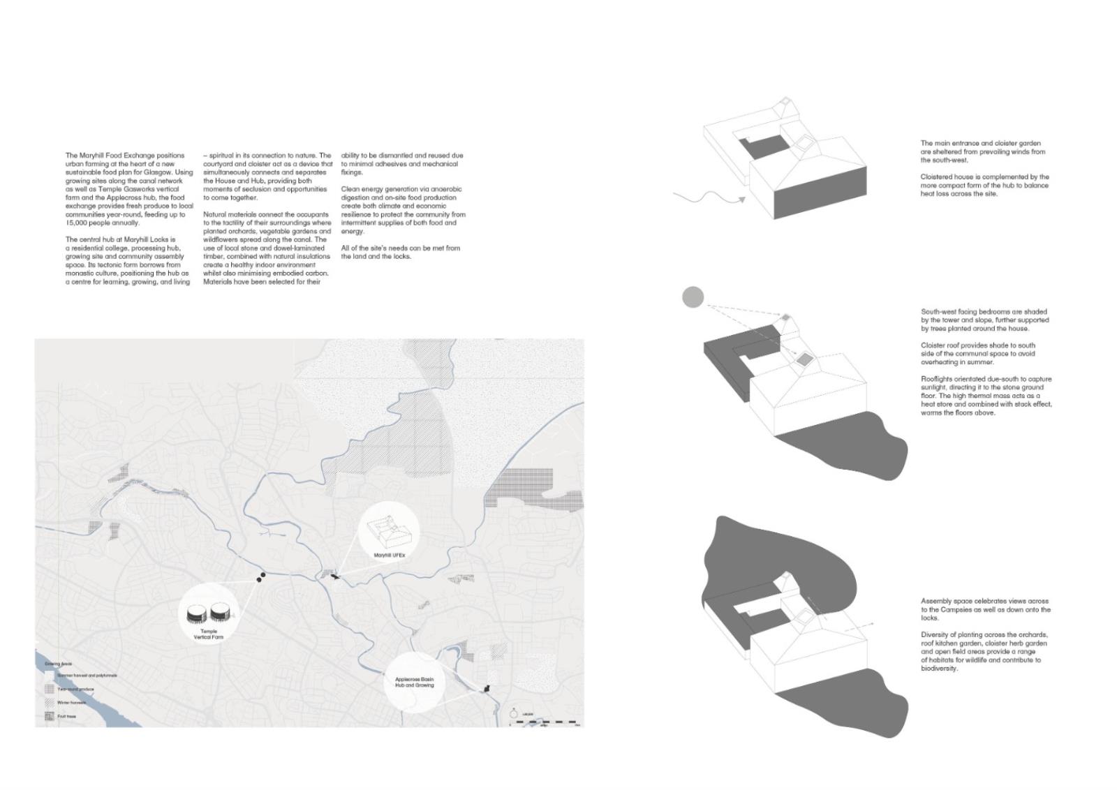 Growing a Monastery to Feed a City: Maryhill Food Exchange Part 1 Project 2022 Philippa Cook Mackintosh School of Architecture | UK The Maryhill Food Exchange positions urban farming at the heart of a new sustainable food plan for Glasgow – providing a residential college, processing hub, growing site and community assembly space.Its tectonic form borrows from monastic culture, positioning the hub as a centre for learning, growing, and living – spiritual in its connection to nature. The courtyard and cloister act as a device, simultaneously connecting and separating the residential and public areas and providing both moments of seclusion and opportunities to come together.Natural materials connect the occupants to the tactility of their surroundings where planted orchards, vegetable gardens and wildflowers spread along the canal. The use of local stone, timber and natural insulations create a healthy indoor environment and demountable materials such as Brettstapel extend material lifecycles and reduce whole lifecycle carbon.By cultivating sites along the canal network, the food exchange provides fresh produce to local communities year-round; this, alongside clean energy generation via anaerobic provides both climate and economic resilience to protect the community from intermittent supplies of food and energy as the climate crisis intensifies.All the site’s needs can be met from the land and the locks. Tutor(s) Tilo Einert