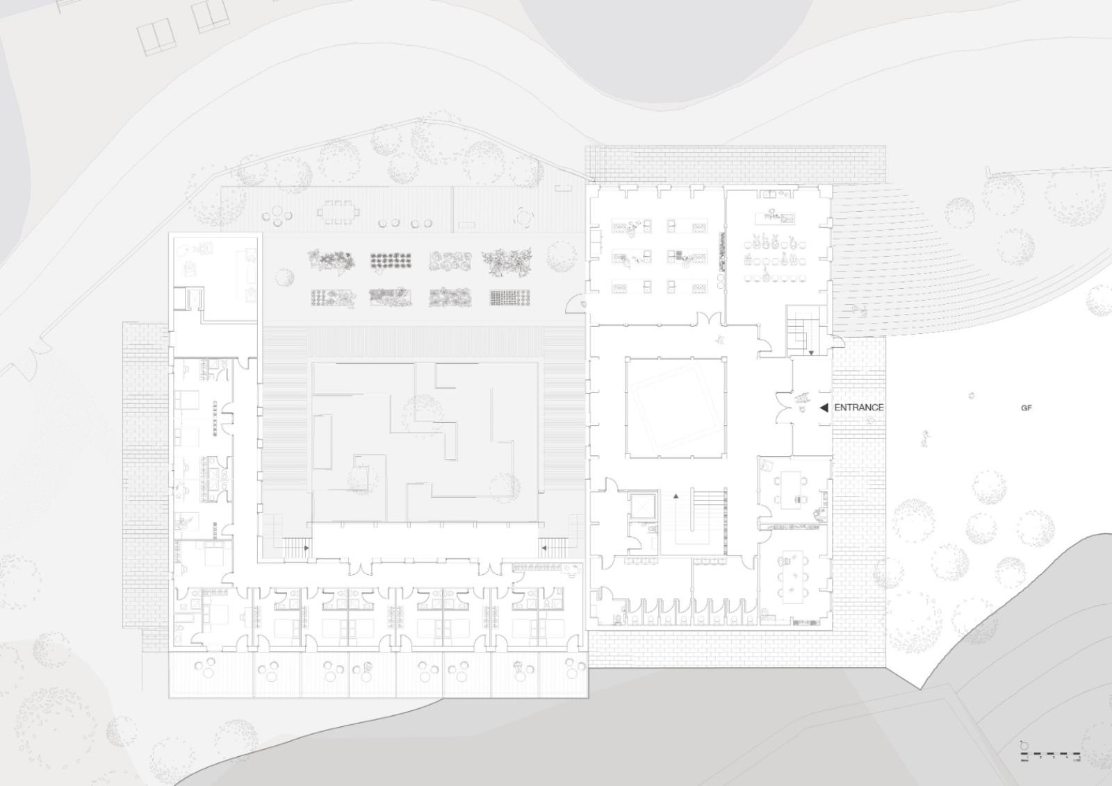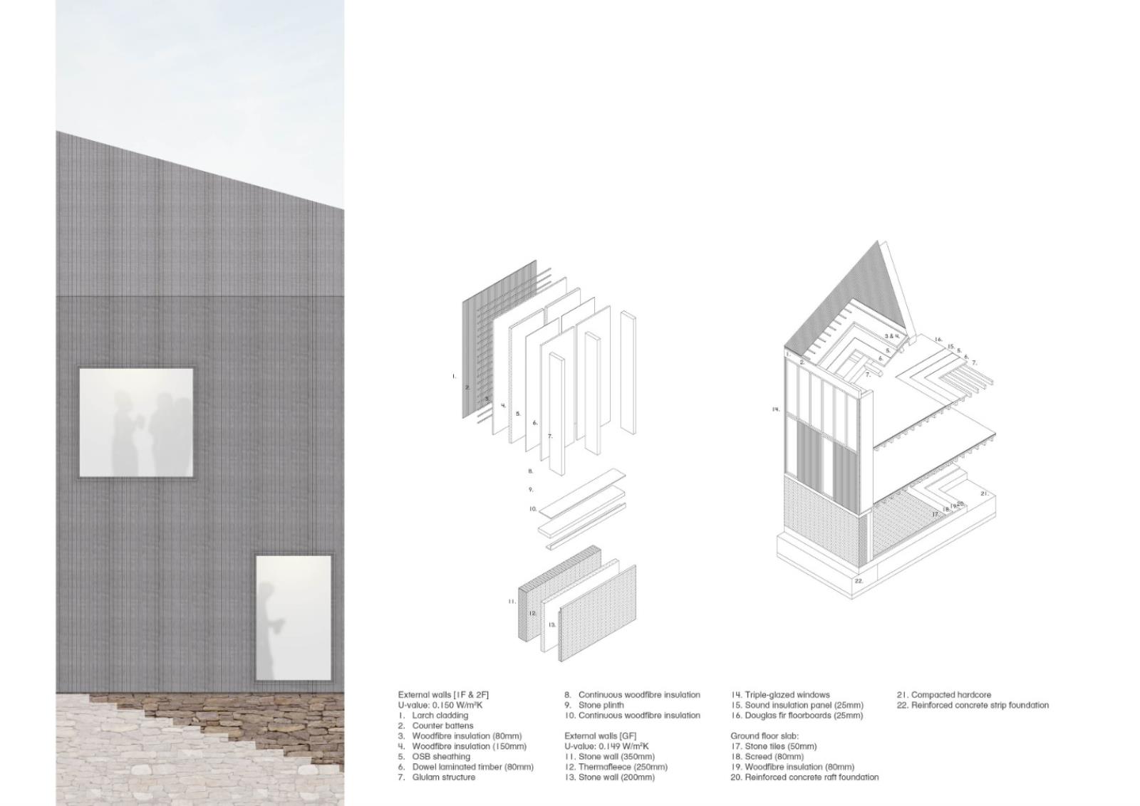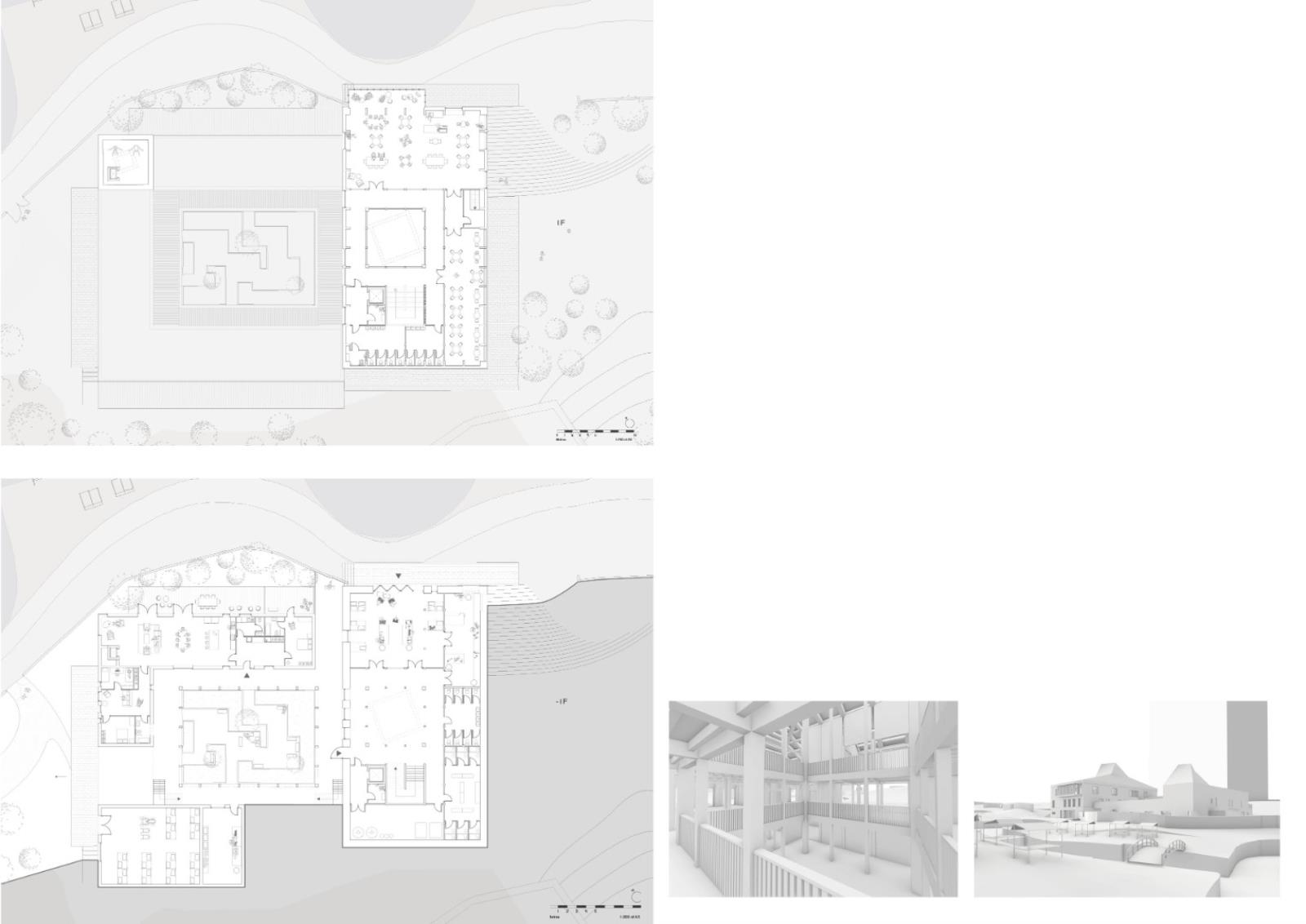 Growing a Monastery to Feed a City: Maryhill Food Exchange Part 1 Project 2022 Philippa Cook Mackintosh School of Architecture | UK The Maryhill Food Exchange positions urban farming at the heart of a new sustainable food plan for Glasgow – providing a residential college, processing hub, growing site and community assembly space.Its tectonic form borrows from monastic culture, positioning the hub as a centre for learning, growing, and living – spiritual in its connection to nature. The courtyard and cloister act as a device, simultaneously connecting and separating the residential and public areas and providing both moments of seclusion and opportunities to come together.Natural materials connect the occupants to the tactility of their surroundings where planted orchards, vegetable gardens and wildflowers spread along the canal. The use of local stone, timber and natural insulations create a healthy indoor environment and demountable materials such as Brettstapel extend material lifecycles and reduce whole lifecycle carbon.By cultivating sites along the canal network, the food exchange provides fresh produce to local communities year-round; this, alongside clean energy generation via anaerobic provides both climate and economic resilience to protect the community from intermittent supplies of food and energy as the climate crisis intensifies.All the site’s needs can be met from the land and the locks. Tutor(s) Tilo Einert
