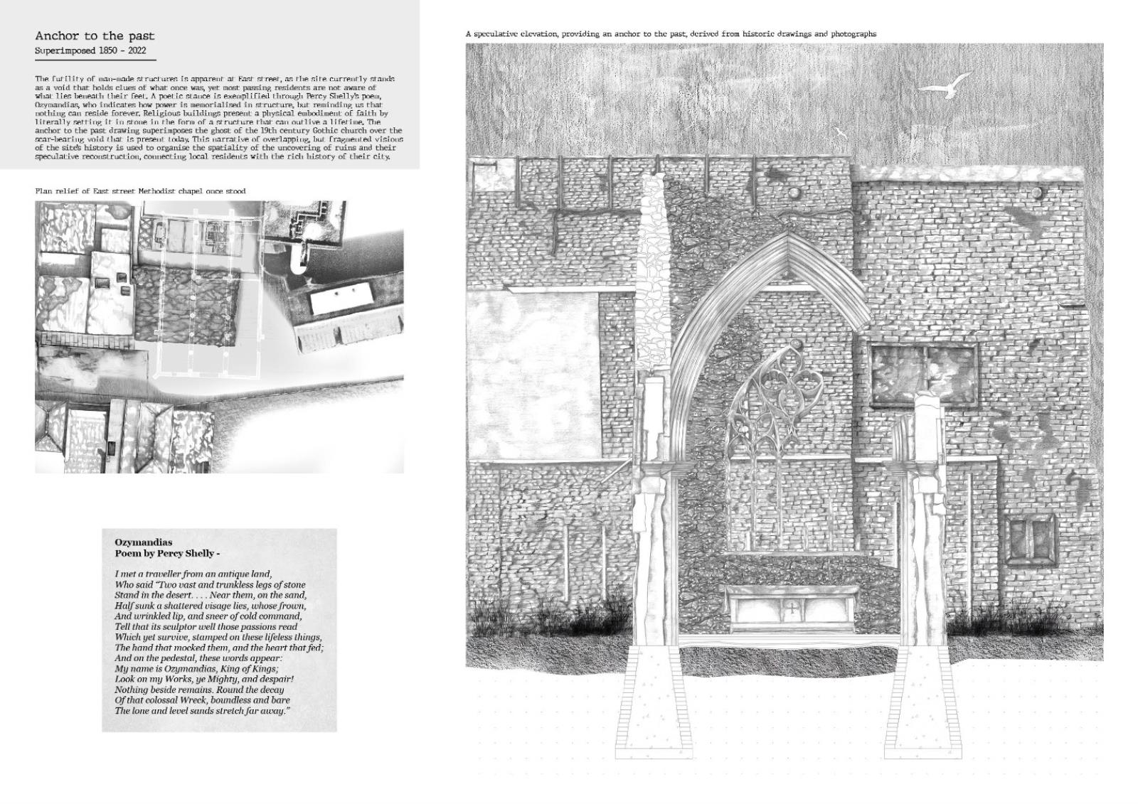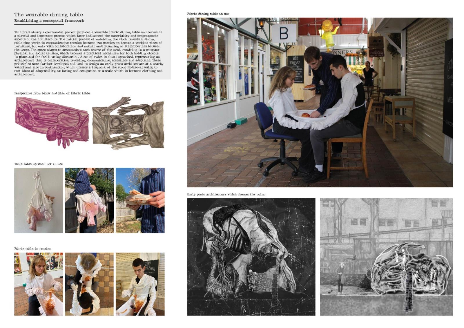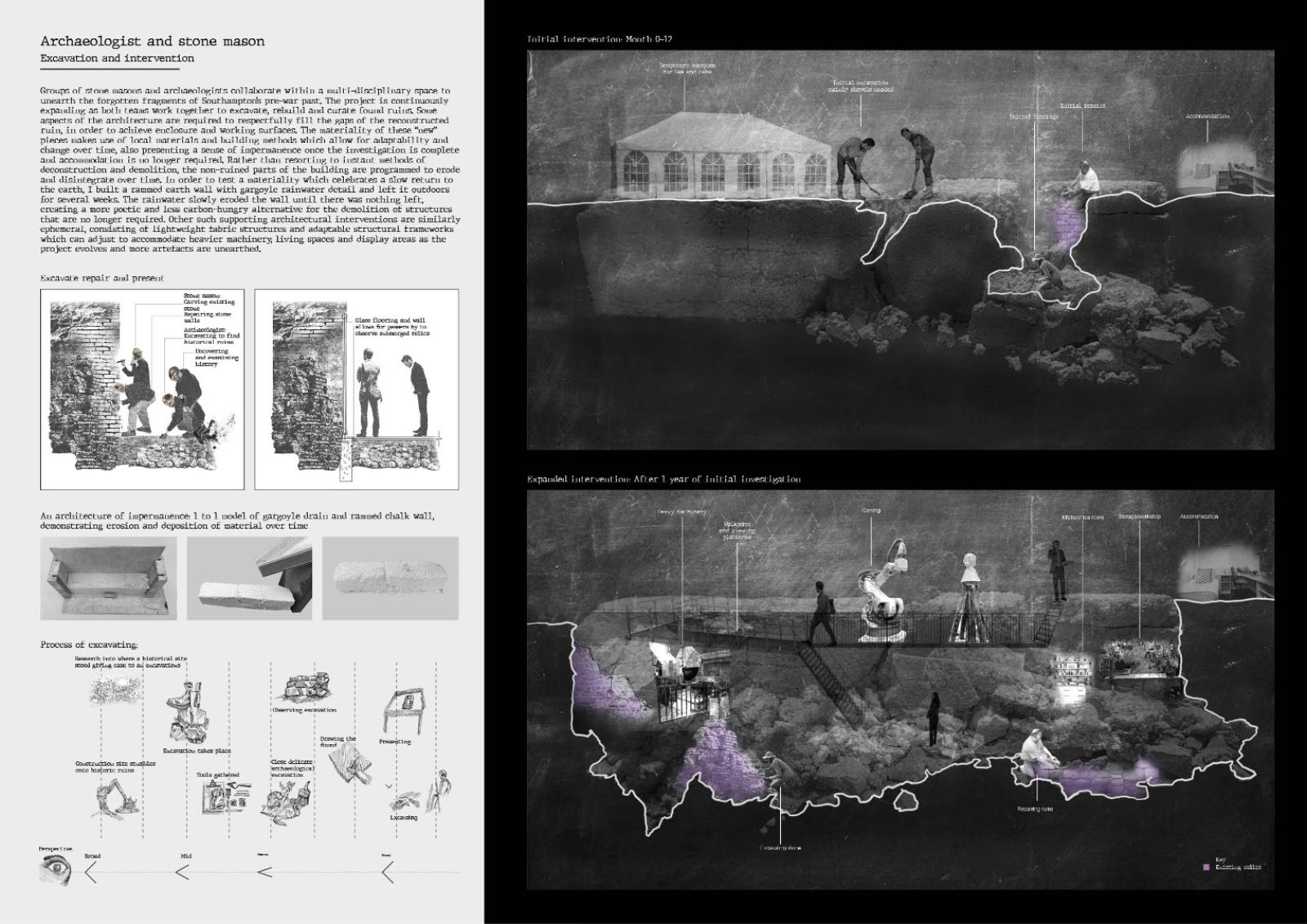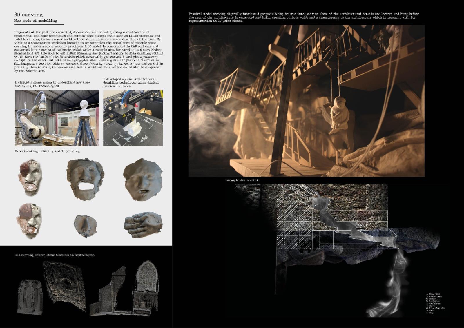 A Palimpsest of Dust Part 1 Project 2022 Cristian Sebastiano Rocco Francioso Oxford Brookes University Oxford | UK Located in a small brownfield site on East Street in Southampton, this project proposes an architecture of curiosity and constant discovery. Through a simultaneous process of excavation and re-construction, the project reveals the ruins of James Wilson's 19th century Gothic church, which was destroyed in the blitz of 1940.Groups of stonemasons and archaeologists collaborate within this multi-disciplinary space to unearth the forgotten structures of Southampton's pre-war past. Fragments of the past are excavated, documented and re-built, using a combination of traditional analogue techniques and cutting-edge digital tools such as 3D scanning and robotic fabrication, to form a new architecture as a reconstructed relic of what once was.The resultant construction serves as an educational tool which facilitates a rich skills and knowledge-share across the associated disciplinary fields of archaeology, architecture, urban planning, craft, construction, heritage, and digital fabrication.The project has been developed using a wide range of media and techniques including photogrammetry, film and animation and prototyping with rammed earth. A series of preliminary experimental projects formed a conceptual framework from which a more complex and comprehensive architecture was able to evolve. The wearable dining table was particularly important as an investigation of collaboration, communication accessibility and adaptability. Tutor(s) Emma-Kate Matthews