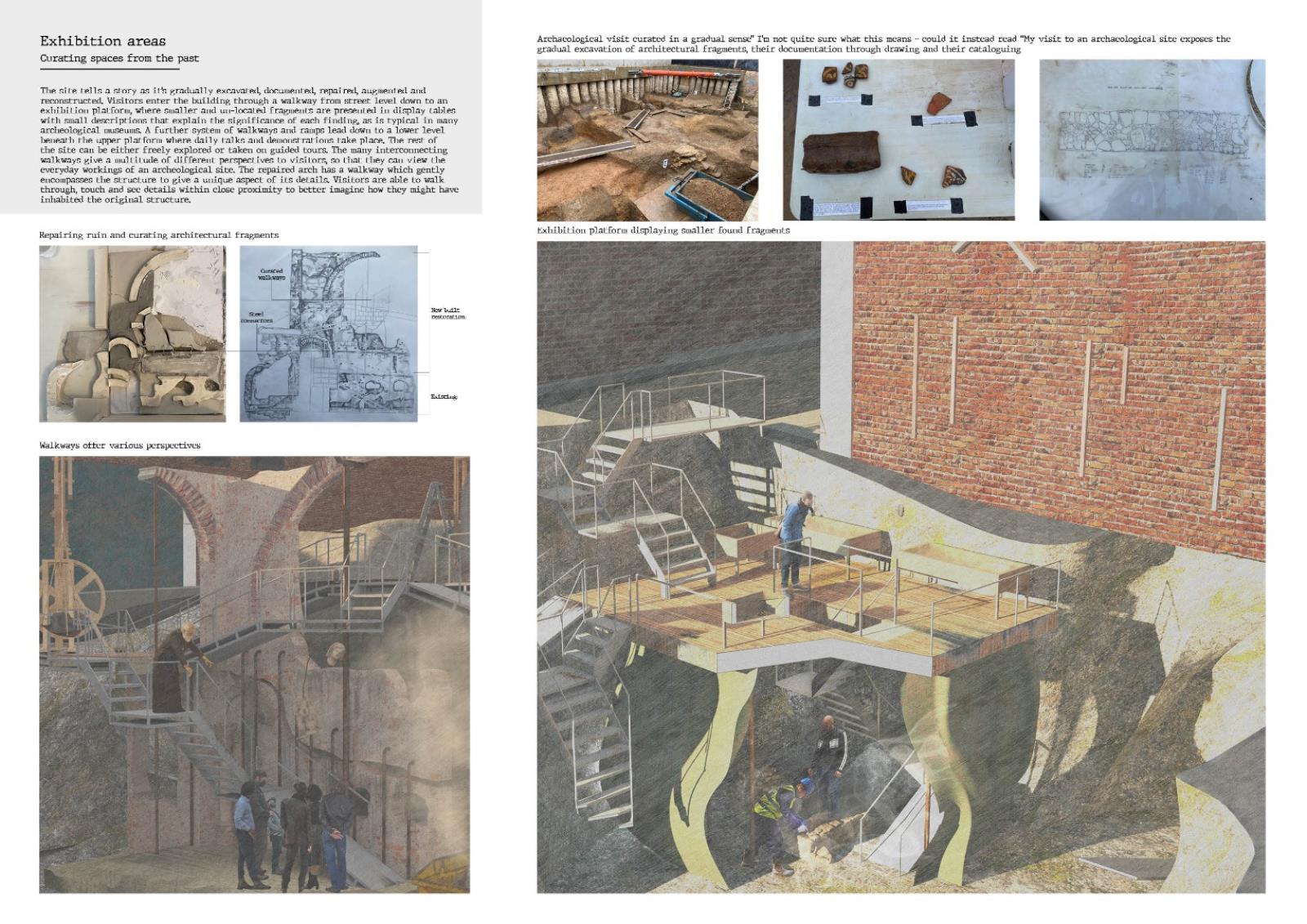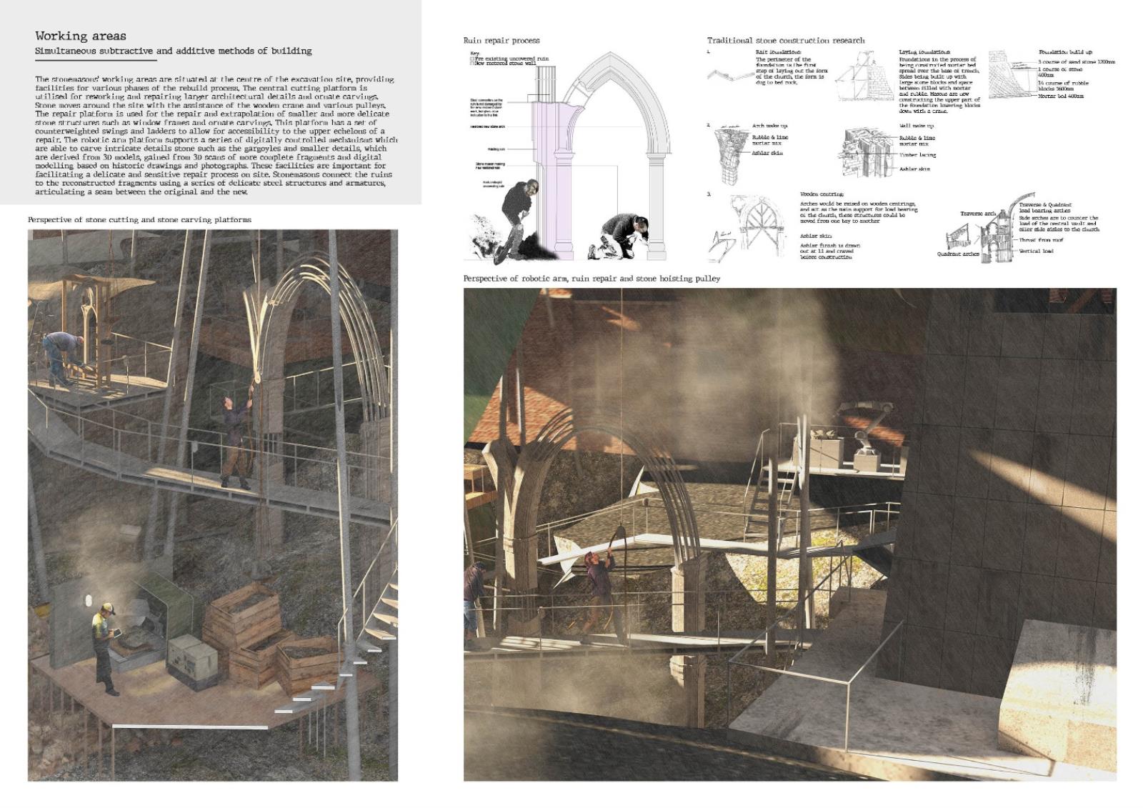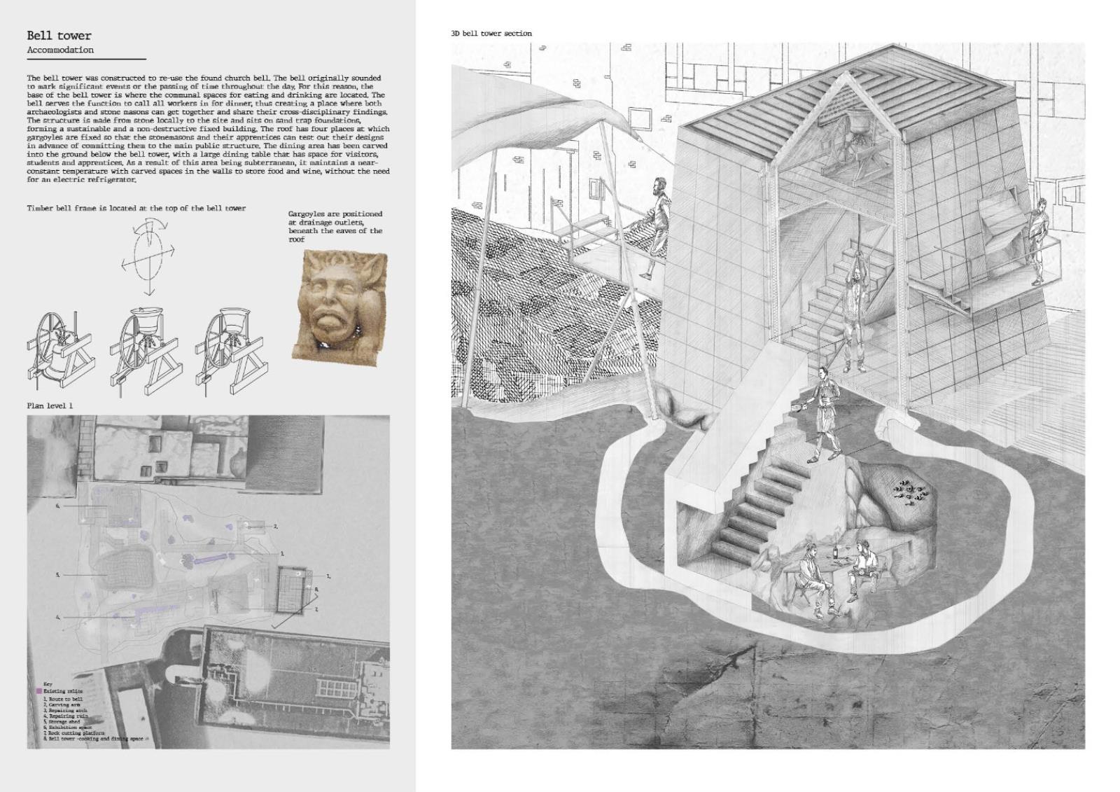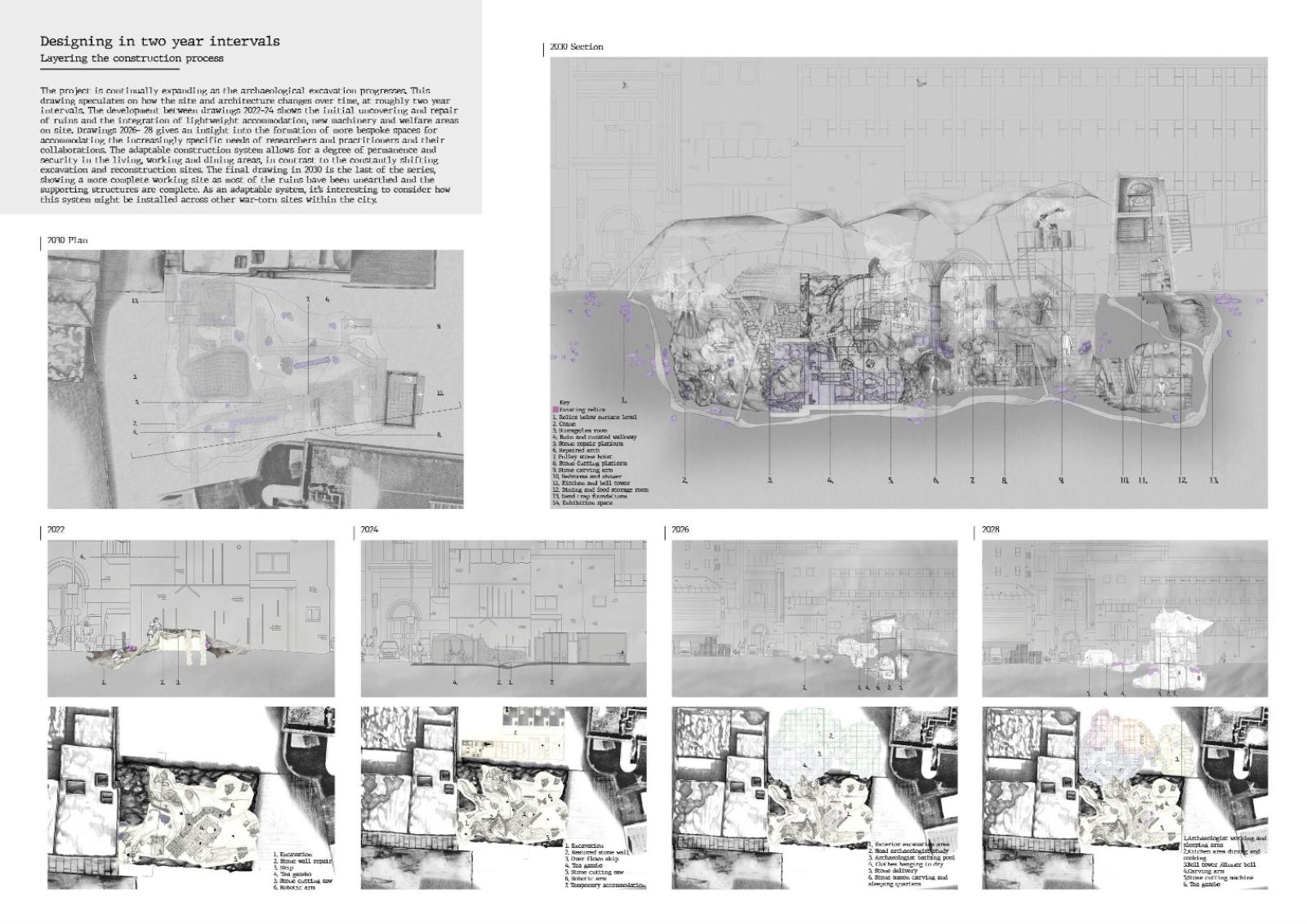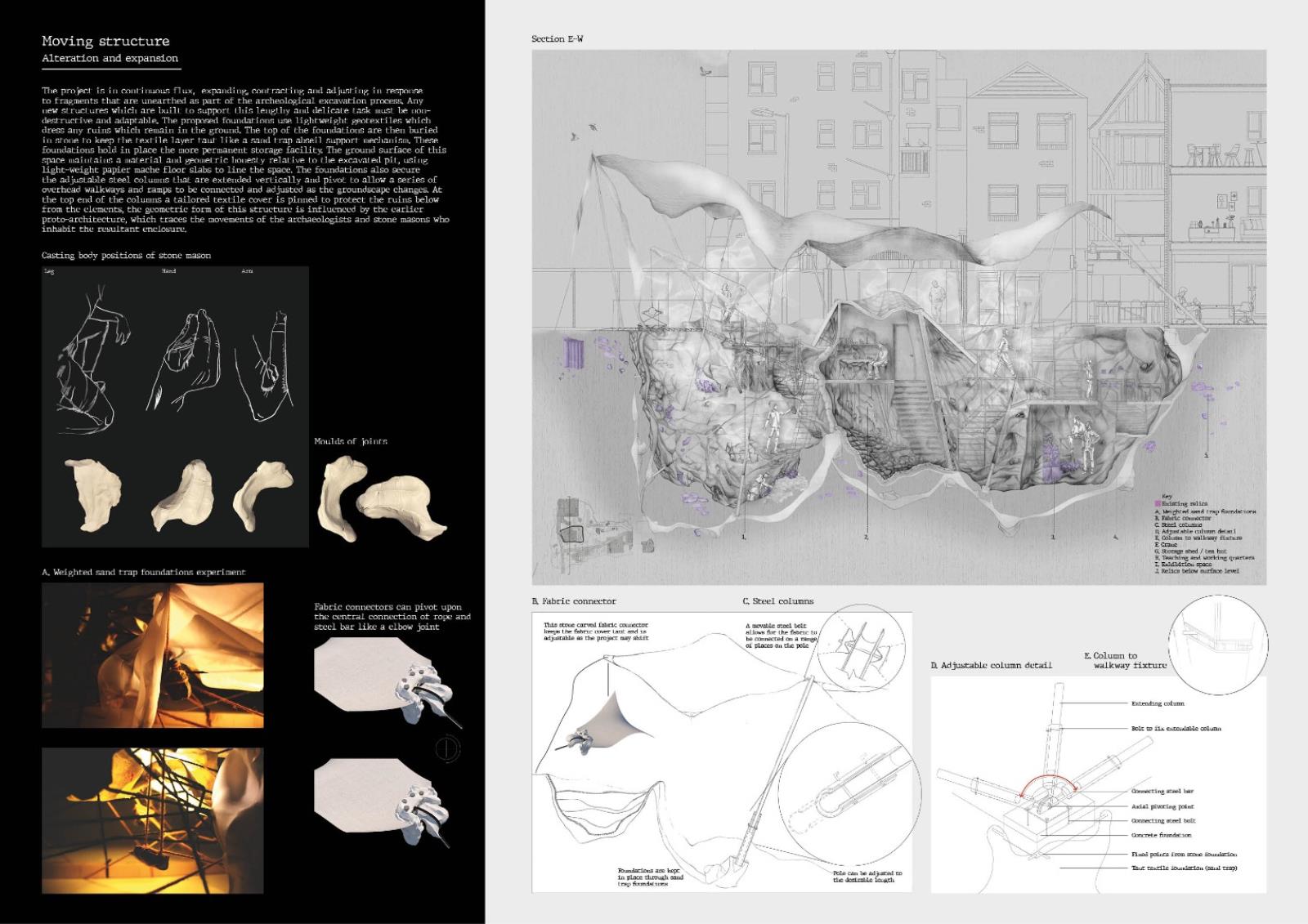 A Palimpsest of Dust Part 1 Project 2022 Cristian Sebastiano Rocco Francioso Oxford Brookes University Oxford | UK Located in a small brownfield site on East Street in Southampton, this project proposes an architecture of curiosity and constant discovery. Through a simultaneous process of excavation and re-construction, the project reveals the ruins of James Wilson's 19th century Gothic church, which was destroyed in the blitz of 1940.Groups of stonemasons and archaeologists collaborate within this multi-disciplinary space to unearth the forgotten structures of Southampton's pre-war past. Fragments of the past are excavated, documented and re-built, using a combination of traditional analogue techniques and cutting-edge digital tools such as 3D scanning and robotic fabrication, to form a new architecture as a reconstructed relic of what once was.The resultant construction serves as an educational tool which facilitates a rich skills and knowledge-share across the associated disciplinary fields of archaeology, architecture, urban planning, craft, construction, heritage, and digital fabrication.The project has been developed using a wide range of media and techniques including photogrammetry, film and animation and prototyping with rammed earth. A series of preliminary experimental projects formed a conceptual framework from which a more complex and comprehensive architecture was able to evolve. The wearable dining table was particularly important as an investigation of collaboration, communication accessibility and adaptability. Tutor(s) Emma-Kate Matthews