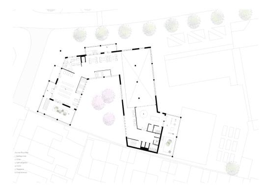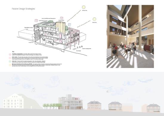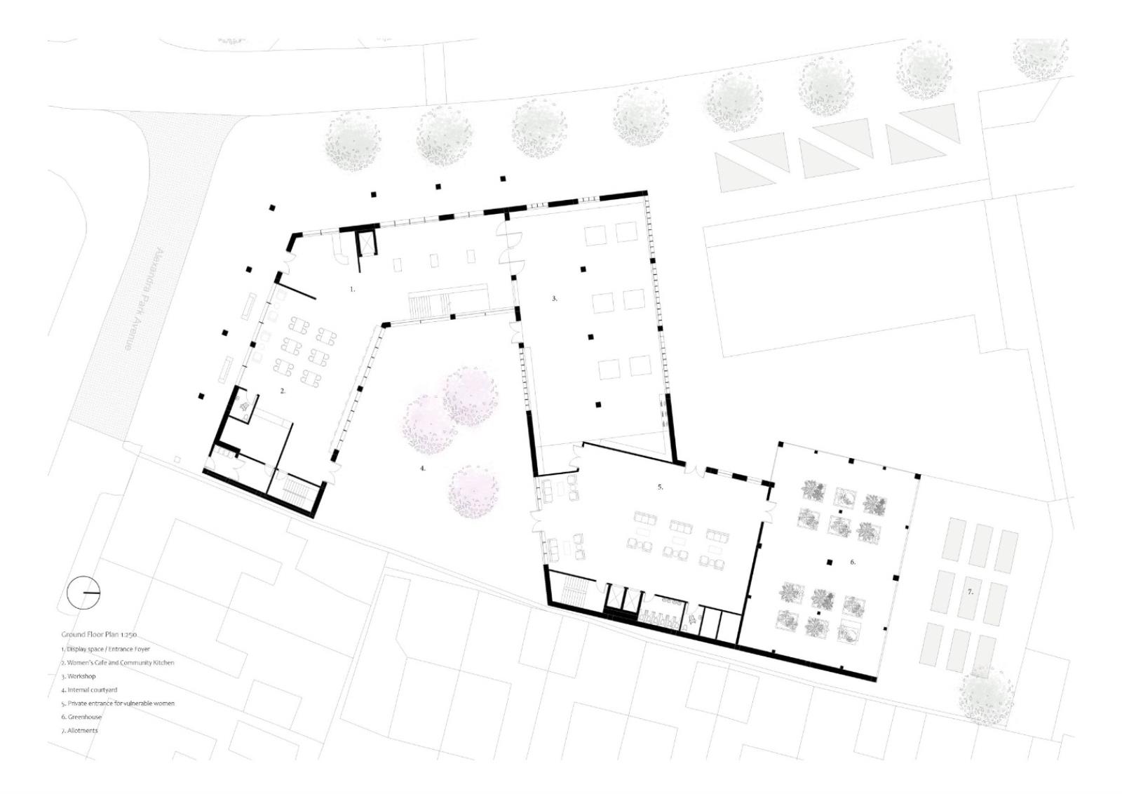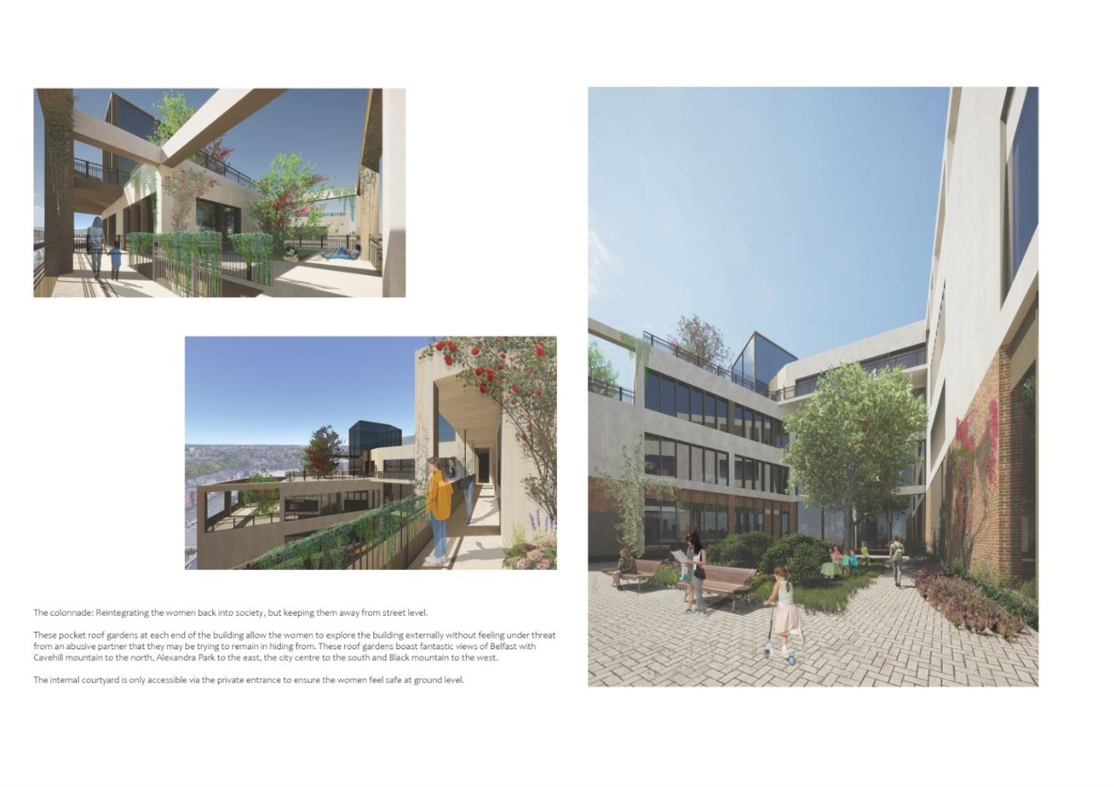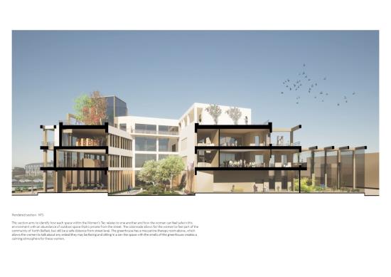 The principal triple height workshop space, flooded with natural light facilitates dynamic visual connections throughout the building. It’s important to ensure vulnerable or at-risk women feel safe here and so the architecture creates opportunities to engage with the public aspects of the building or maintain a more discreet presence while using the facilities. The use of the shading colonnade wrapped around the south & west facades creates a safe raised relationship to the street and an opportunity to circulate the building externally with the use of hidden roof gardens that encourage reflection and informal socialising, alongside views across key landmarks of Belfast.