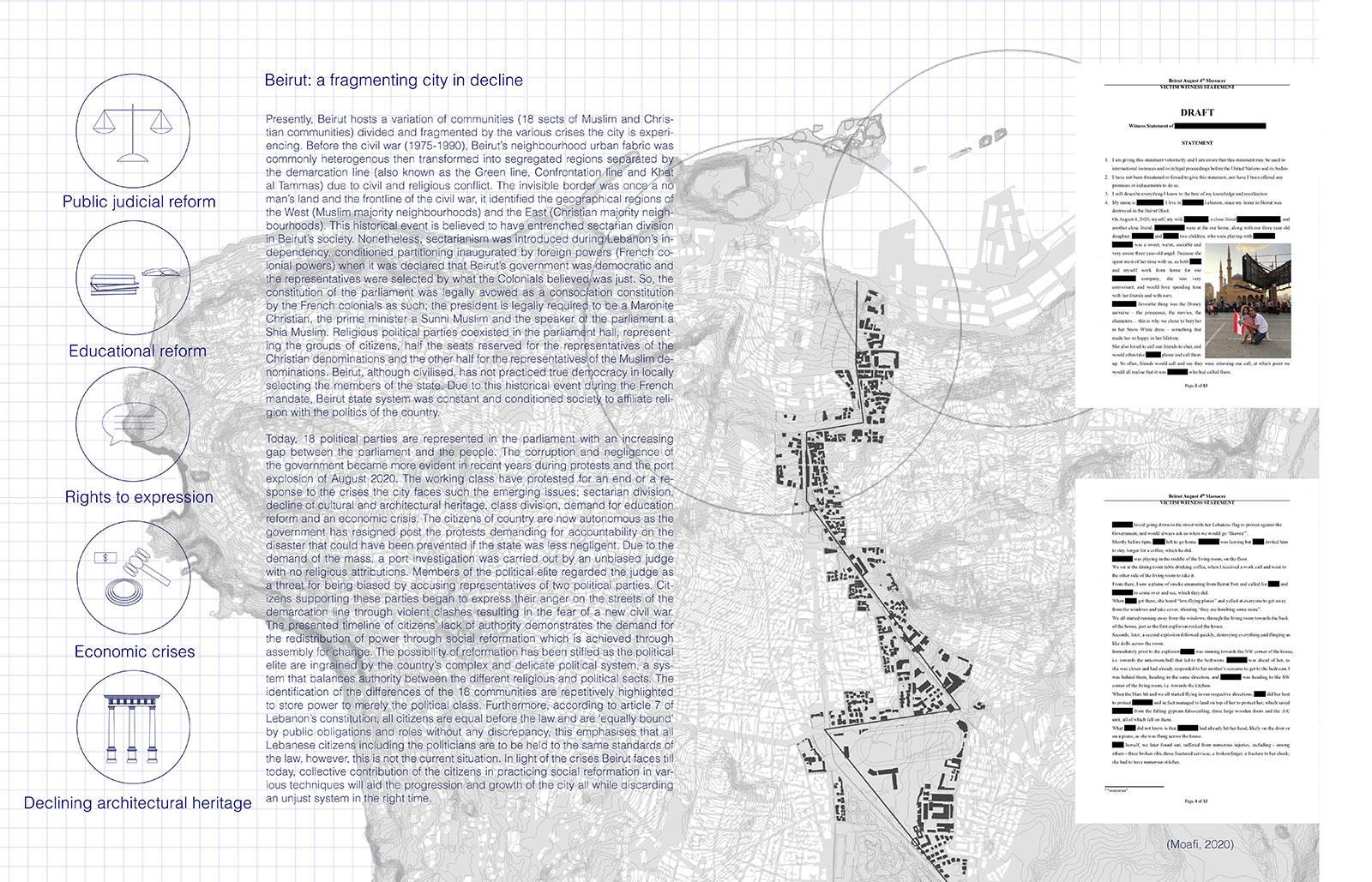 Post the Beirut warehouse port explosion of August 2020 and months of public protests and riots, an investigation on the port disaster has reignited past civil war tension on Beirut’s former demarcation border resulting in combat clashes between the civilians consequential in threats of reintroducing social stagnation. Concurrently, Beirut is a in a critical moment in history as the youth initiate in mobilising projects in hopes for a just future, the possibility for social reformation is evident.