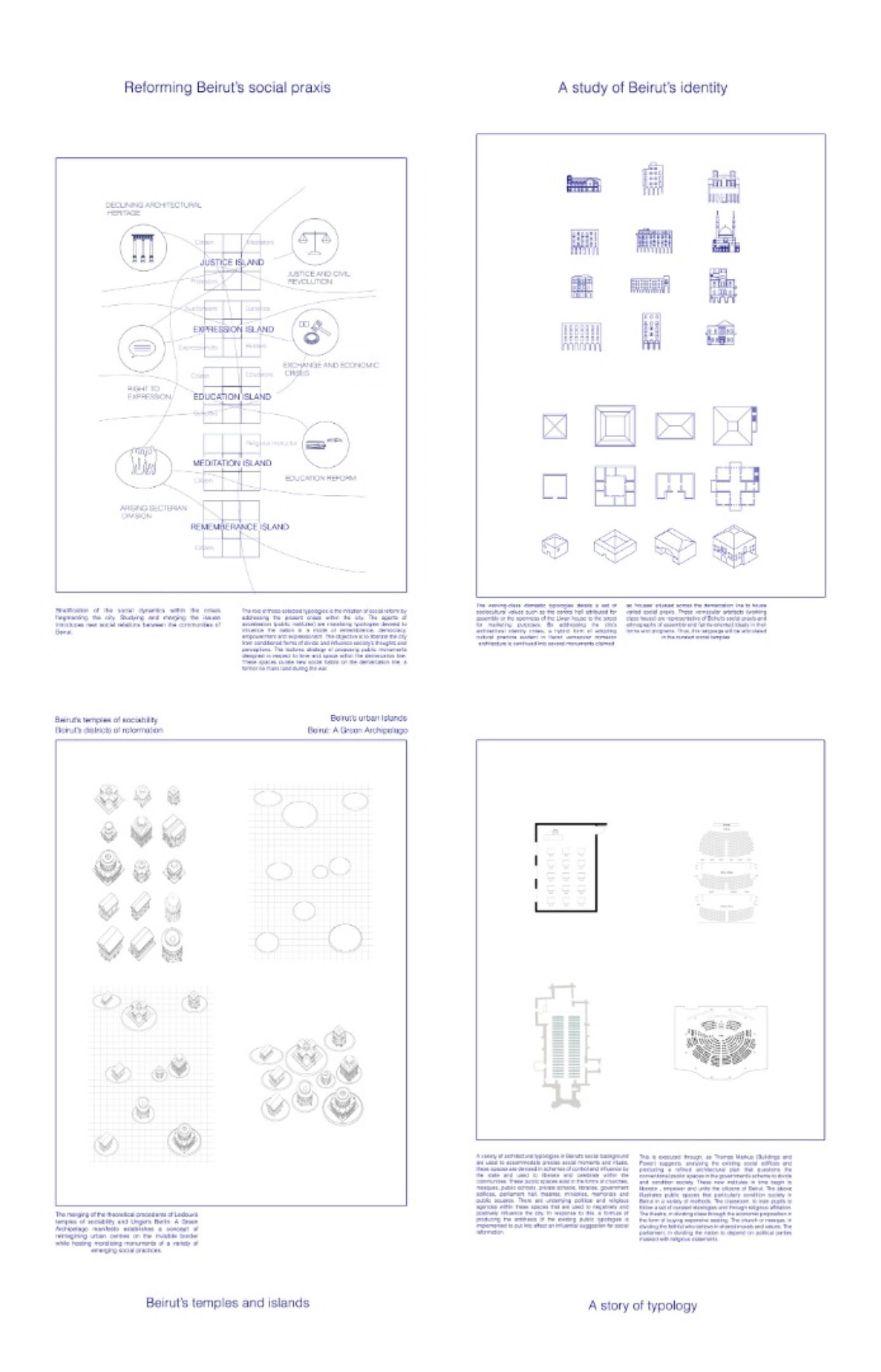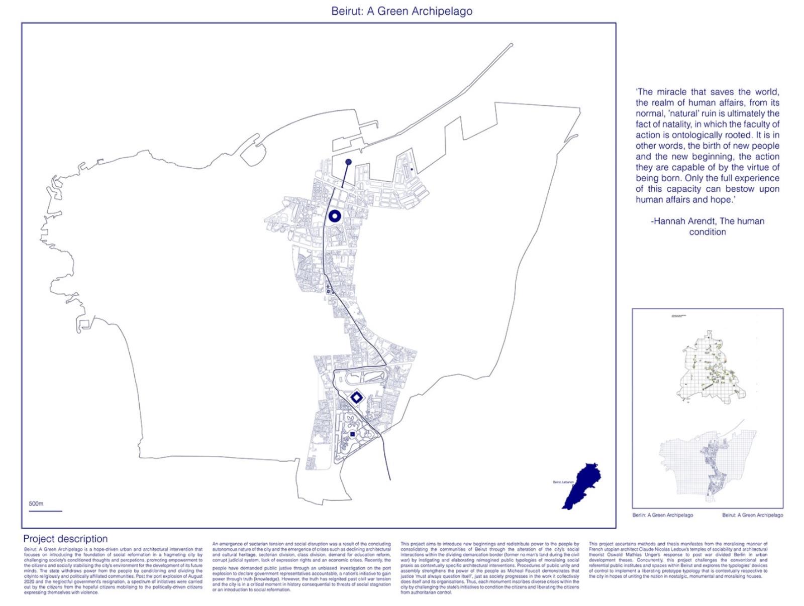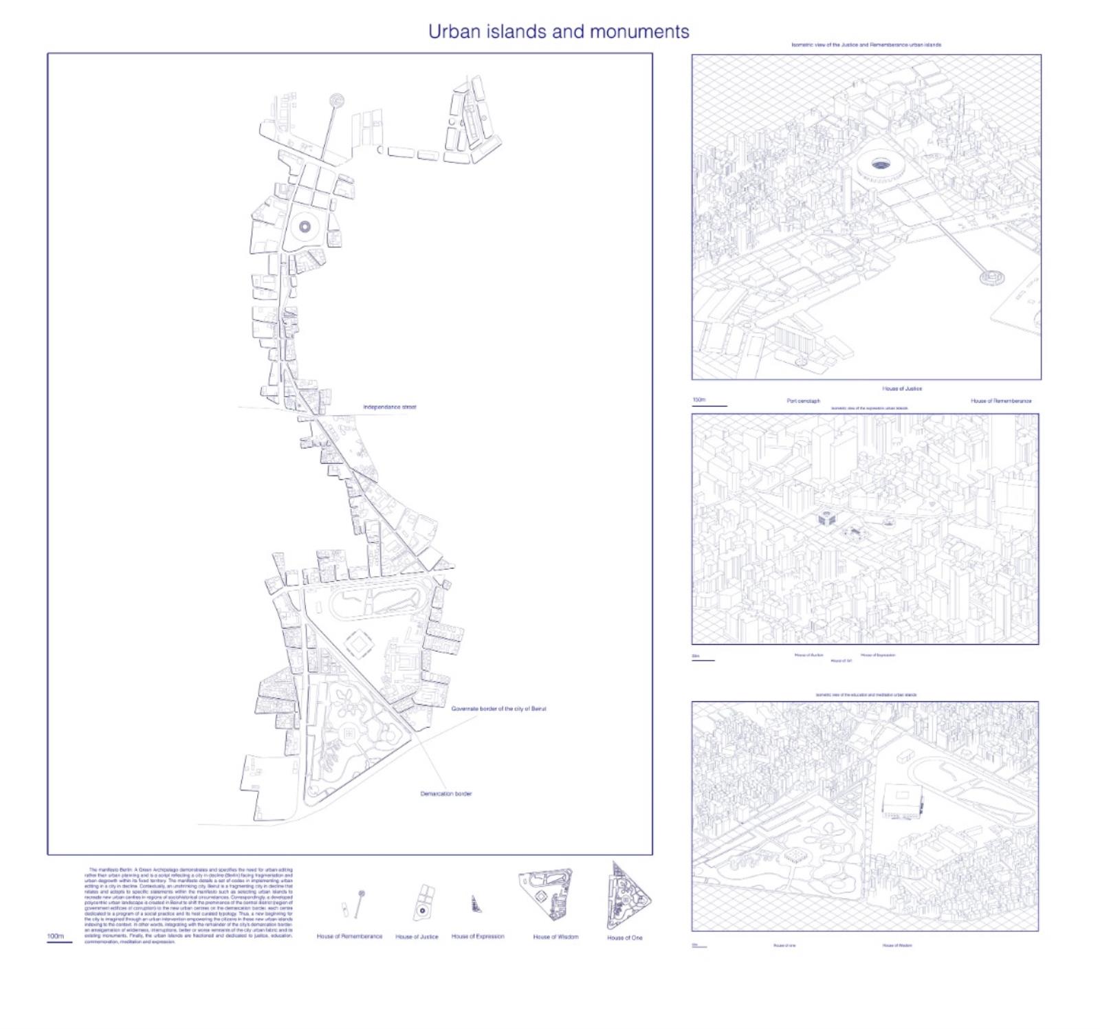 Beirut: A Green Archipelago is a hope-driven urban and architectural intervention project that aims to challenge society’s misconceptions, set the foundation of social reformation and empower the citizens through the consolidation of the religious and ethnics communities of Beirut. Respectively, this scheme ascertains methods and thesis manifestos from the moralising manner of French utopian architect Claude Nicolas Ledoux’s temples of sociability and architectural theorist Oswald Mathias Unger’s response to post war divided Berlin urban development theses. Challenging the demarcation border’s urban environment, the project intervenes in the form of monuments as reimagined typologies dedicated to justice, remembrance, education, meditation and expression. Thus, the monuments explore and challenge the conventional public institutes within Beirut and implement prototype typologies sympathetic to the city’s vernacular.