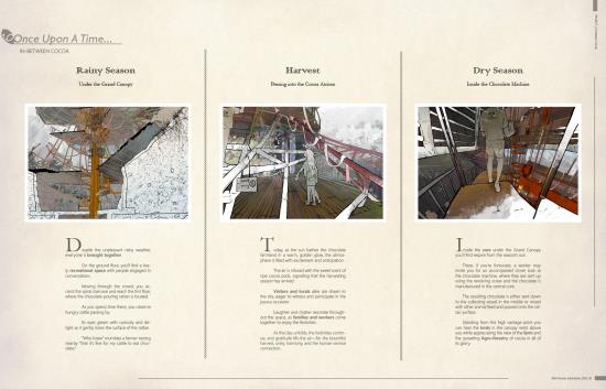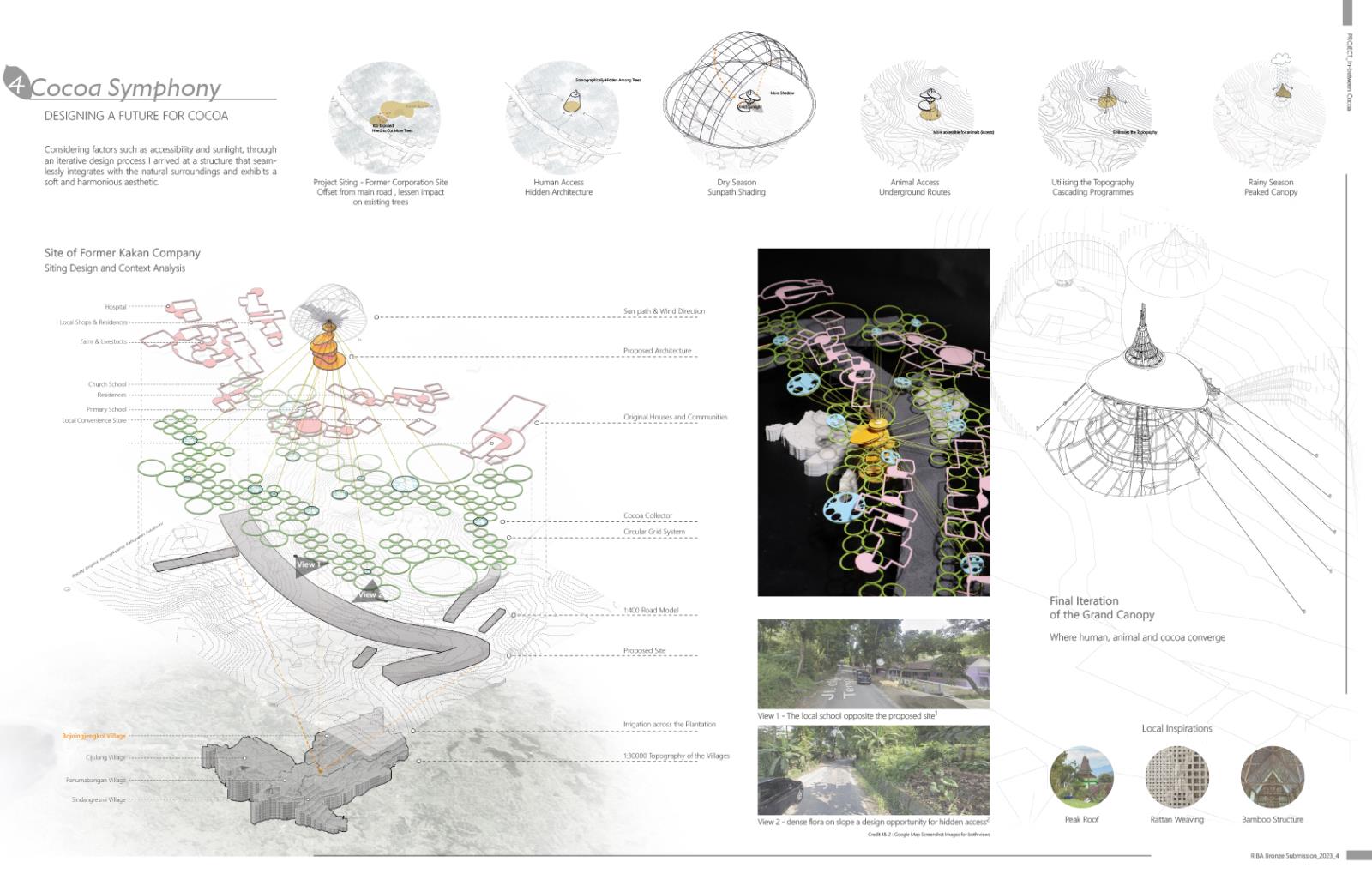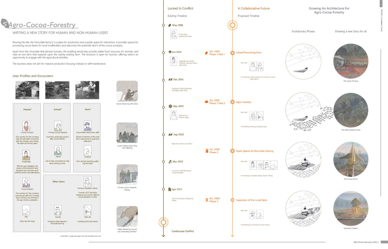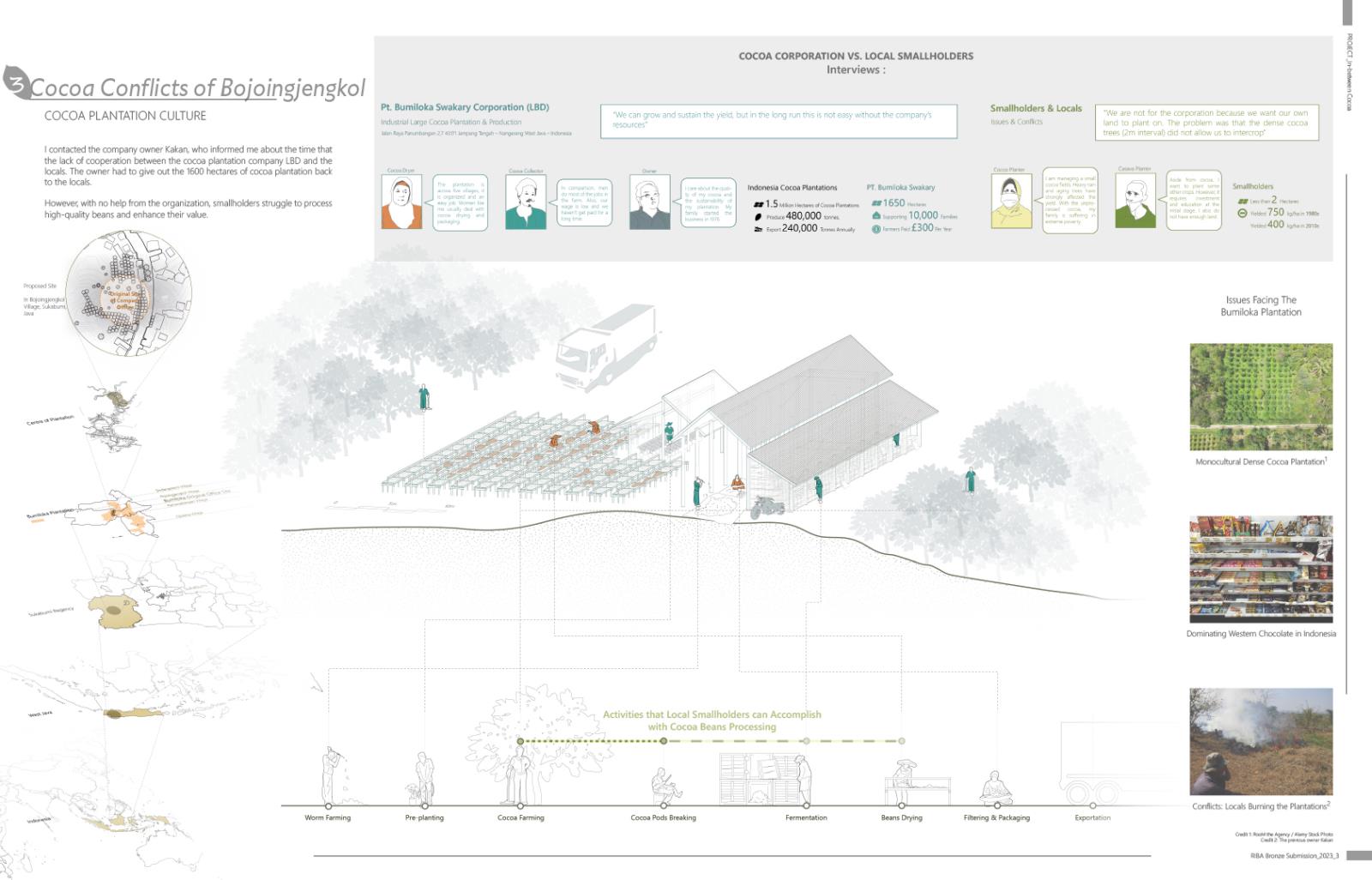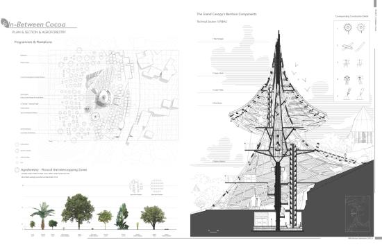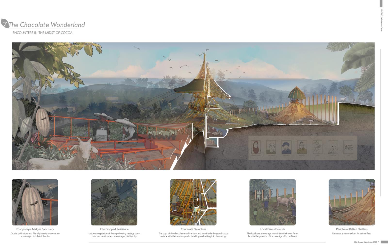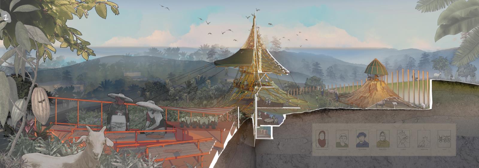 Following this tale, the In-Between Cocoa project intertwines cocoa processing with livestock programs, creating a harmonious fusion of flavours and a sustainable alliance between species. By designing for a thorough agroforestry scheme, its architecture, like a wise mediator, seeks to resolve conflicts over land distribution between smallholders and corporate interests on the site of a former cocoa company. Moreover, it envisions a vibrant playground, where joy echoes in its vernacular-inspired canopies, from local kids and families. A sanctuary is born, providing shelter and solace for pets, livestock, and wildlife. Not to mention yields from resilient farmland and bustling tourists attracted by the revitalised cocoa miracle.