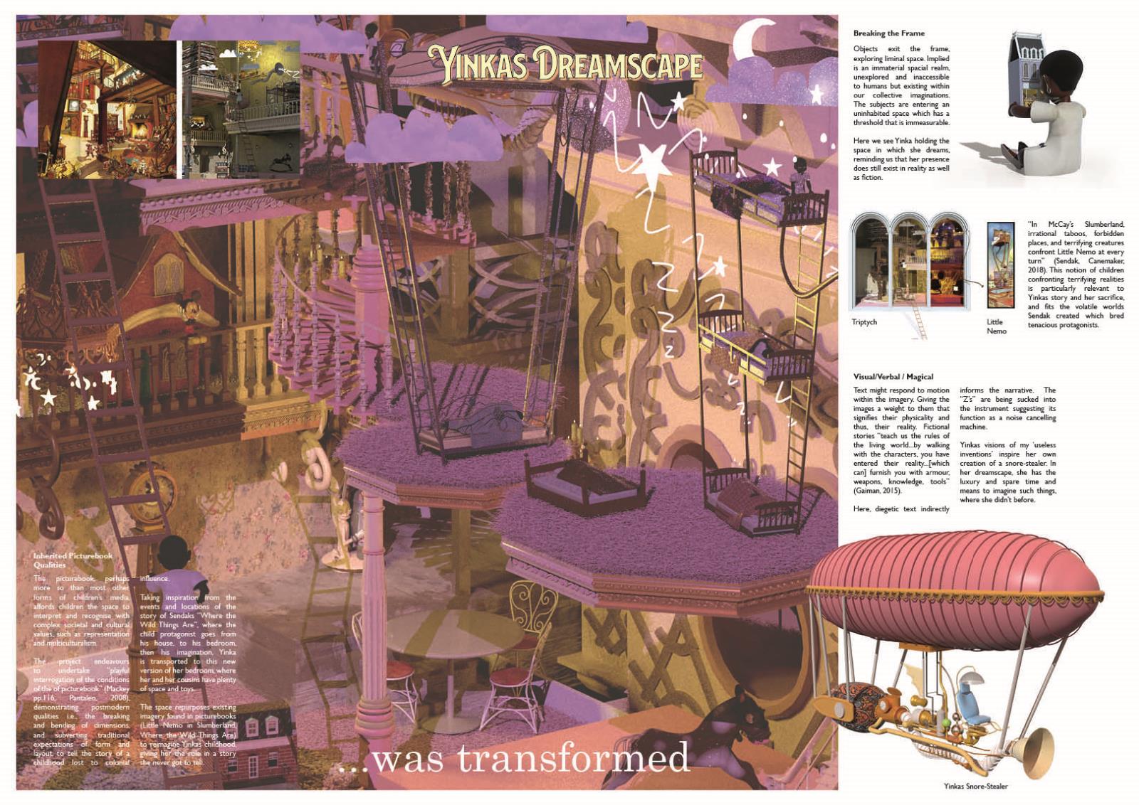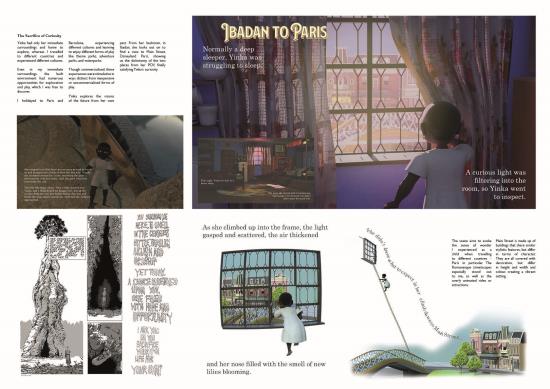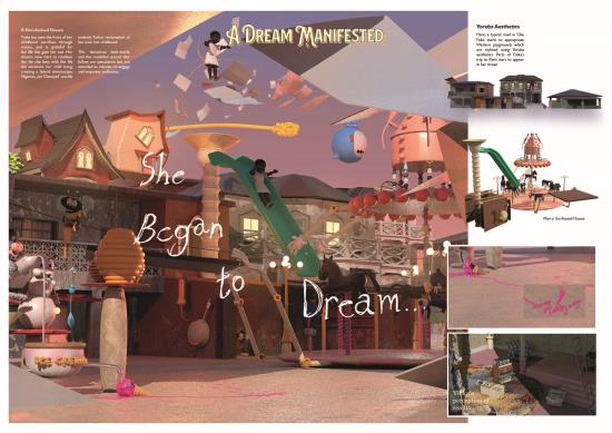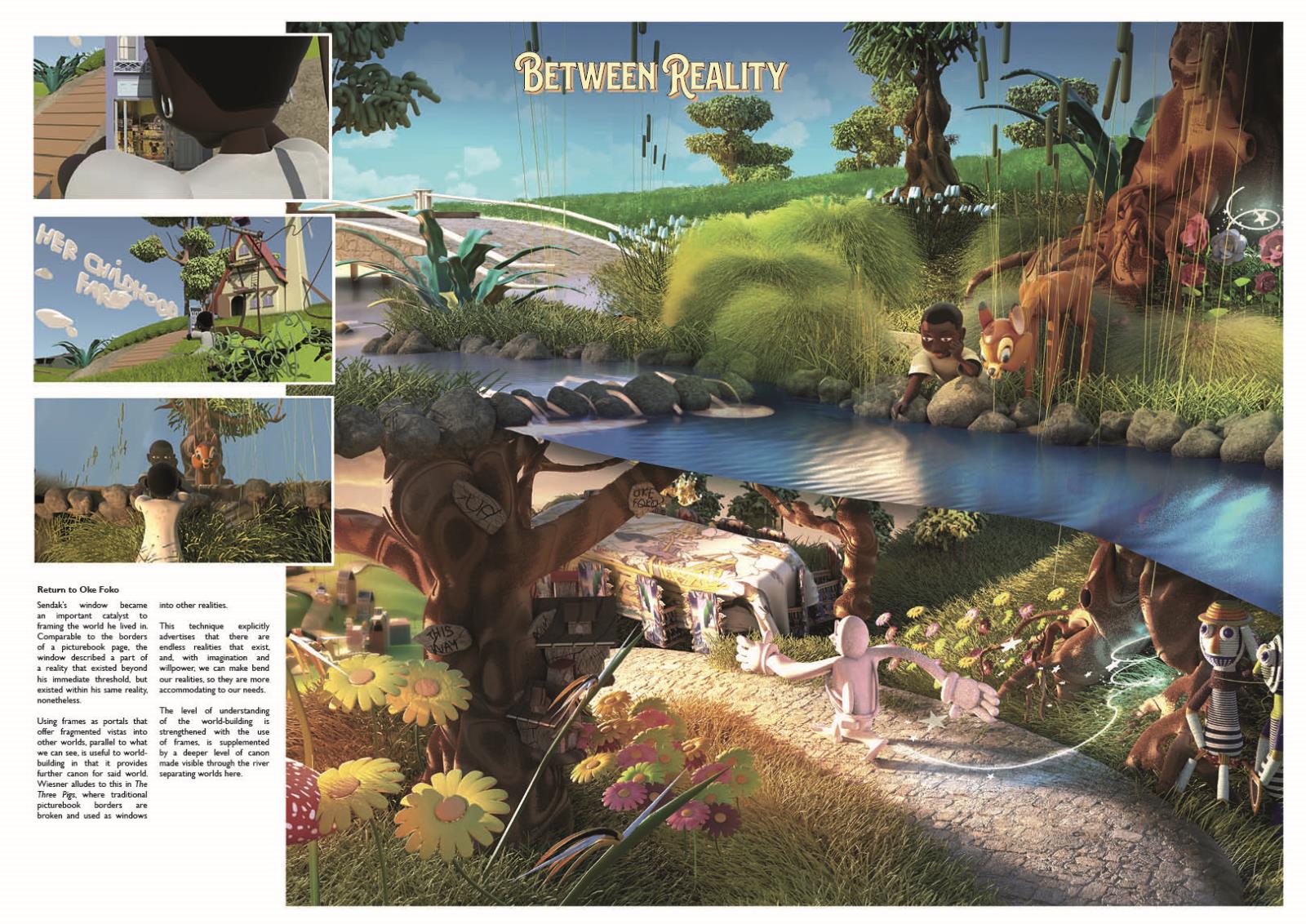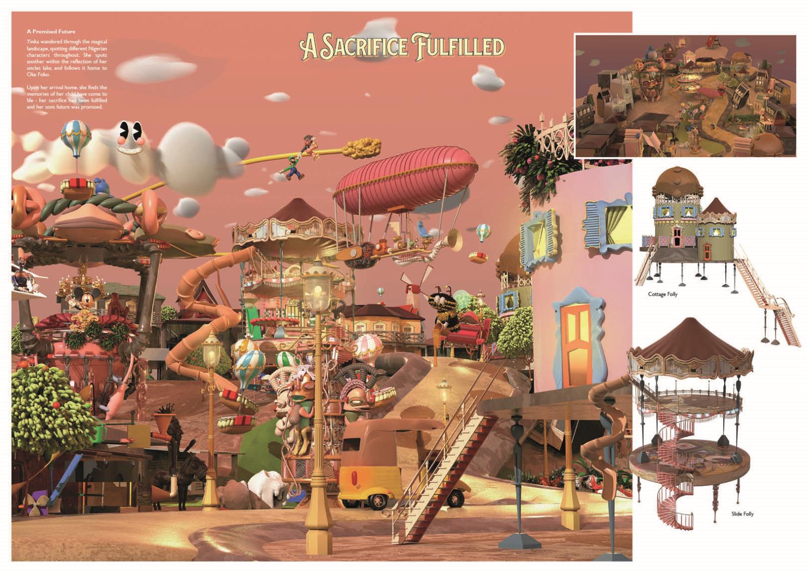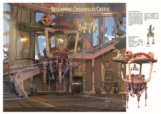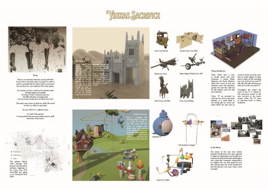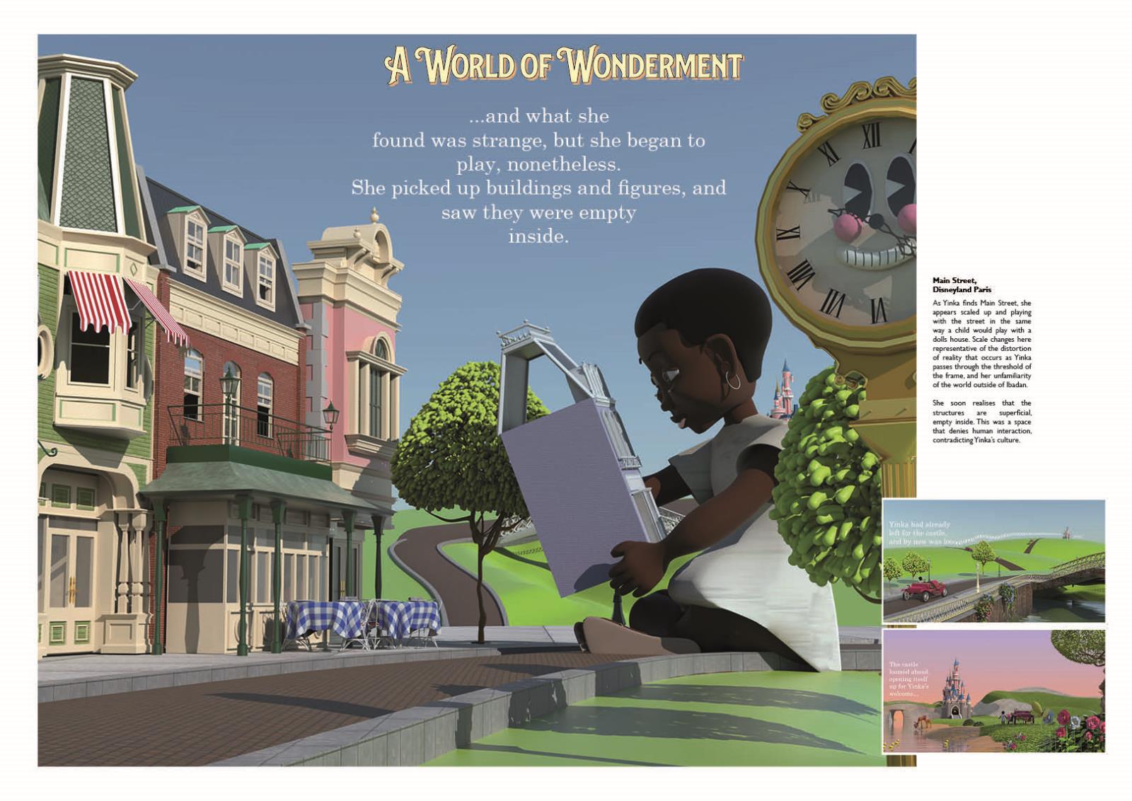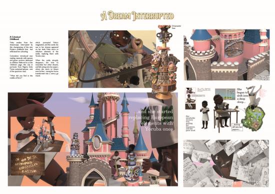 A Memory Foretold Part 2 Project 2023 Luke Temiloluwa Stevens University of Greenwich | UK The project is a self-exploration of identity. As a British architect with Nigerian parentage, I explore the contradictory symptoms of modern and precolonial childhoods. British colonisation warped Nigerian childhoods, undermining precolonial methods, shaping a generation around a plastic, consumerist culture. The ‘dangling-of-the-carrot’ of a Westernised childhood drove Nigerians to pursue such a life for their children, thus, an inconsistent coexistence between modern and precolonial upbringings emerged.A Memory Foretold is the story of reclamation of Western fantastical imagery. It follows a decolonised dreamscape in which architecture acts as a political character, repurposing the Disney aesthetics that were fundamental to the Westernisation of Nigerian childhoods. Replacing the roofs of Cinderella’s castle to adorn them with Yoruba crowns, for example, illustrates the dichotomy in the British-Nigerian upbringing, using storytelling to critique architectural norms and explore issues of identity.Testing the malleability of architecture and its inherent storytelling capability, the project manipulates European architecture as an allegorical ‘desanctifying’ of colonial heritage. Con¬sequently, a denunciation of the elitism that such architecture represents is gestured. The childhood a Nigerian mother was refused, but that her British son received, is reclaimed through speculative places that experiment with an unsettling ‘Africanisation’ of European architec¬ture. Tutor(s) Ifigeneia Liangi Daniel Wilkinson