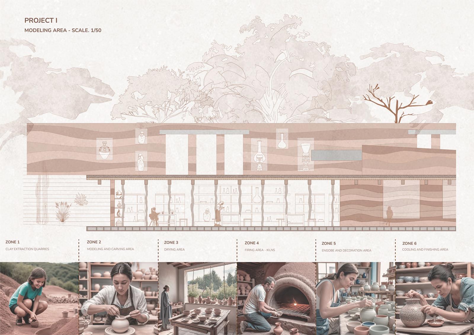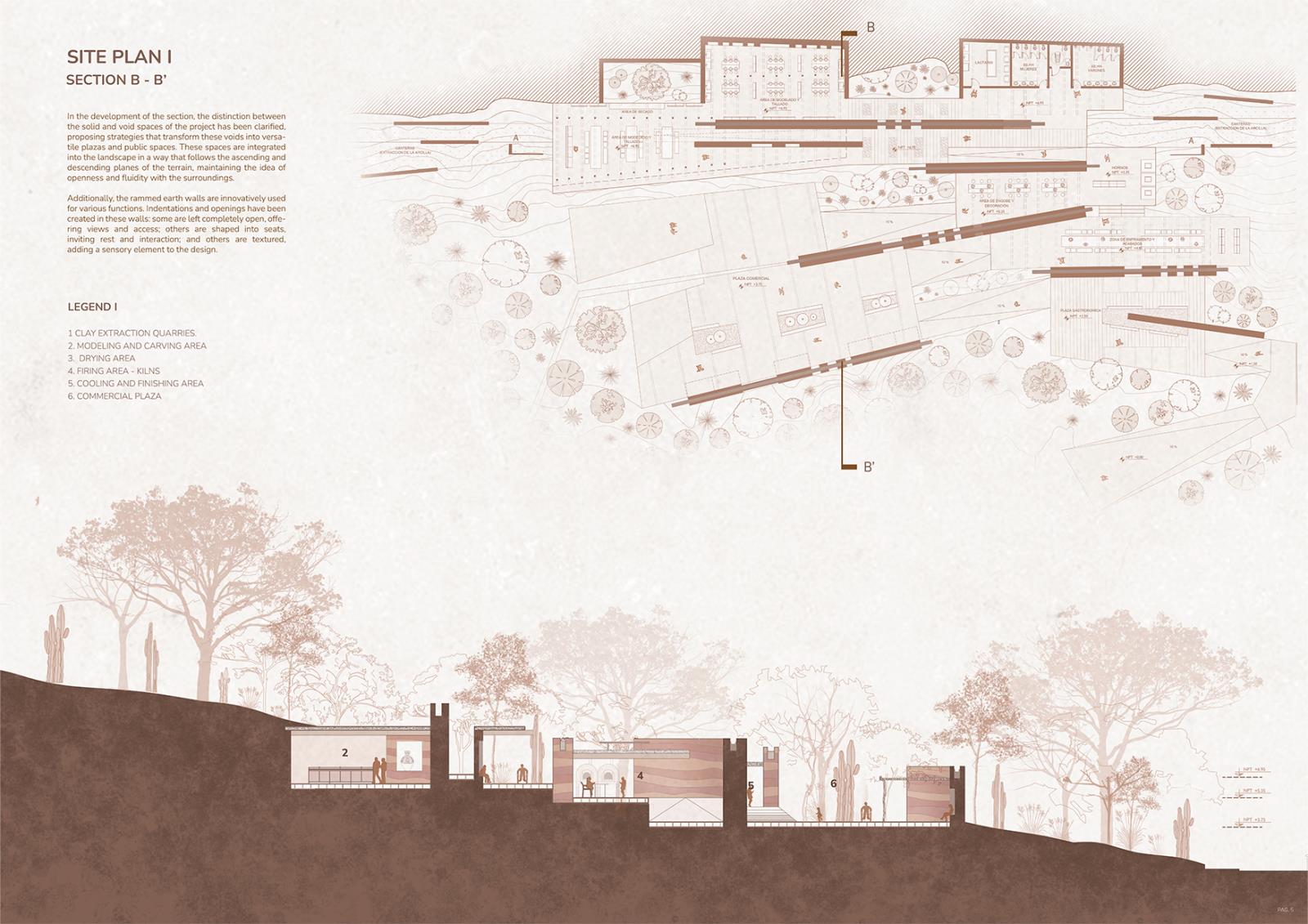 Once the main topographical axes are established, solids and voids are defined by rammed earth walls that rise from the ground, minimizing the impact on the natural environment and preserving the area's biological processes. These walls not only delineate spaces but also house all stages of the ceramic production process, from extraction to painting.