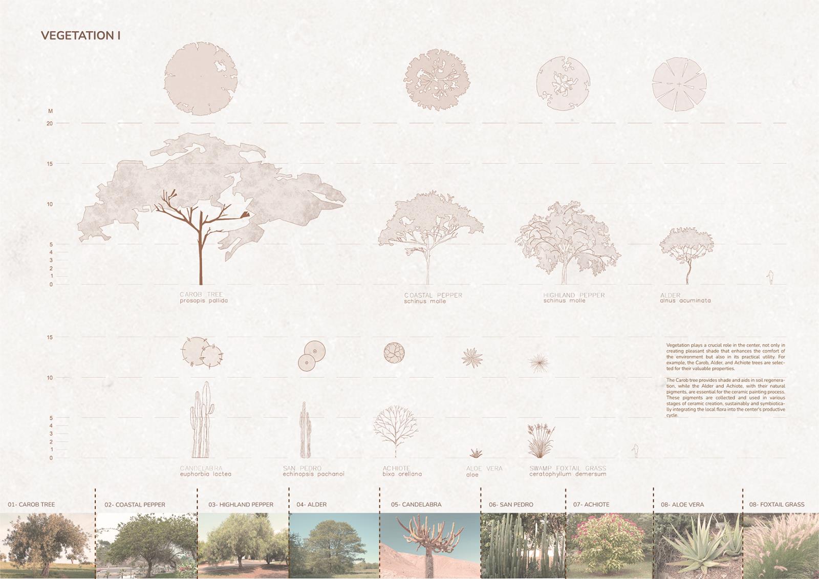 The project's strategies focus not only on enriching visitors' sensory experiences but also on supporting biological processes through architecture, ensuring the continuity of the ecosystem services offered by the site. This is evidenced by the use of water resources, integrating sloped irrigation channels that serve a structural function as beams and ensure the continuous flow of water to the cultivation areas, which provide the necessary pigments for the ceramic painting process.