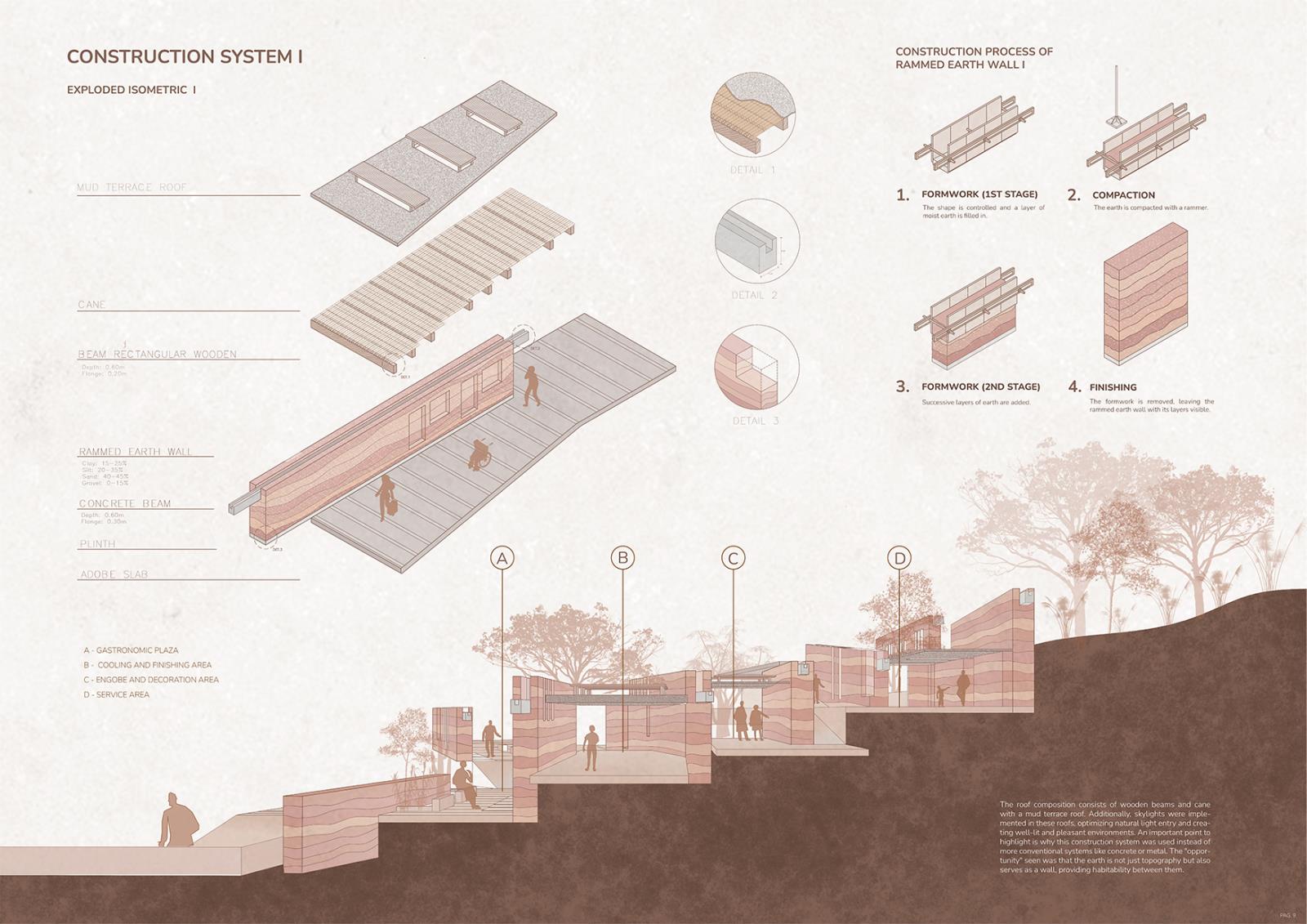 The project aims to exalt pre-Columbian architectural culture through the use of rammed earth walls, which define spaces and reflect respect and care for the surrounding natural environment.