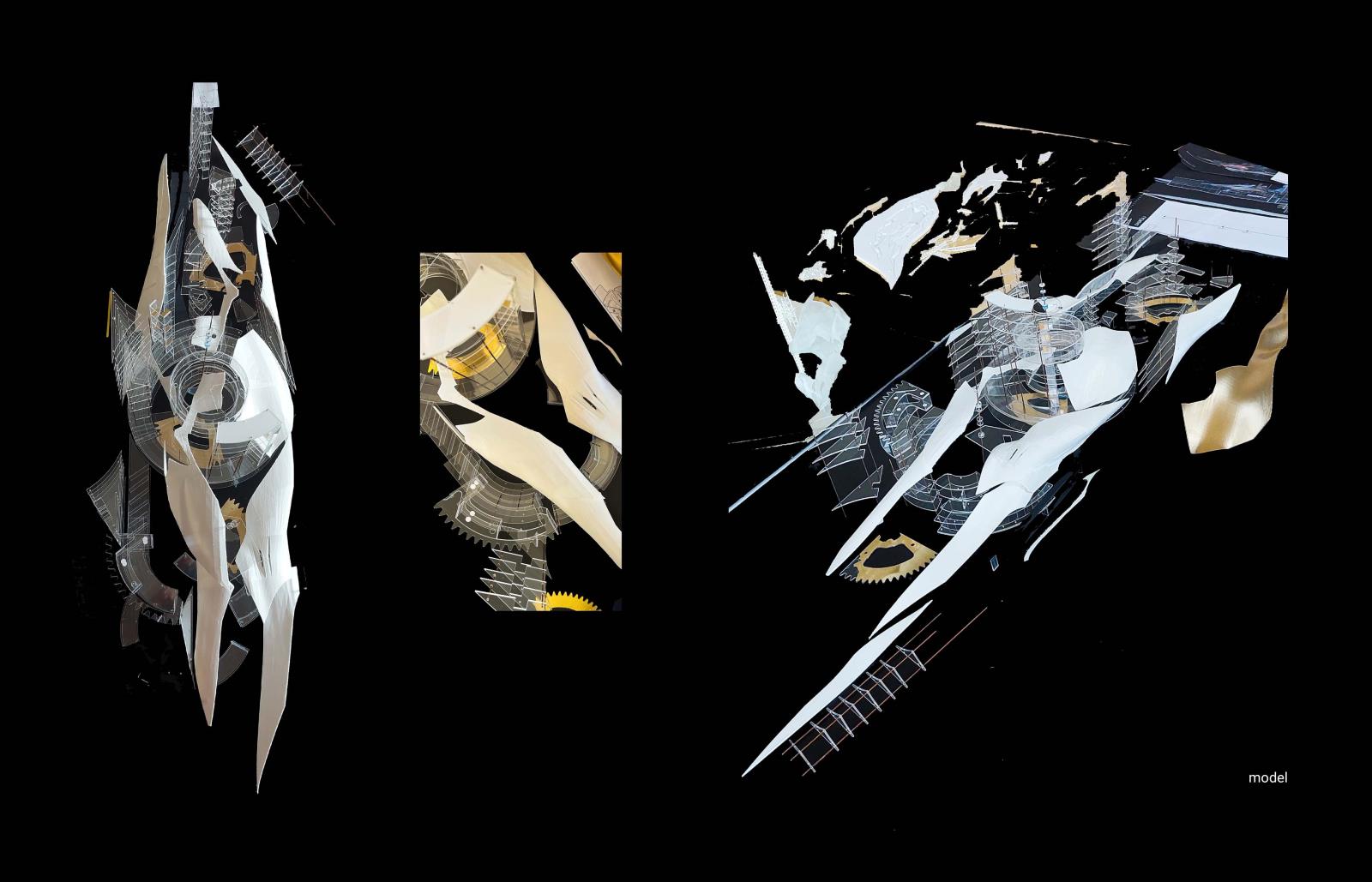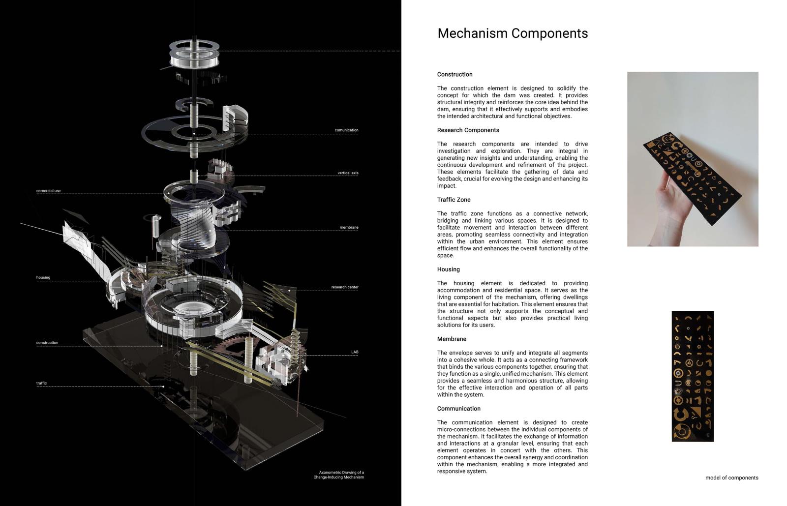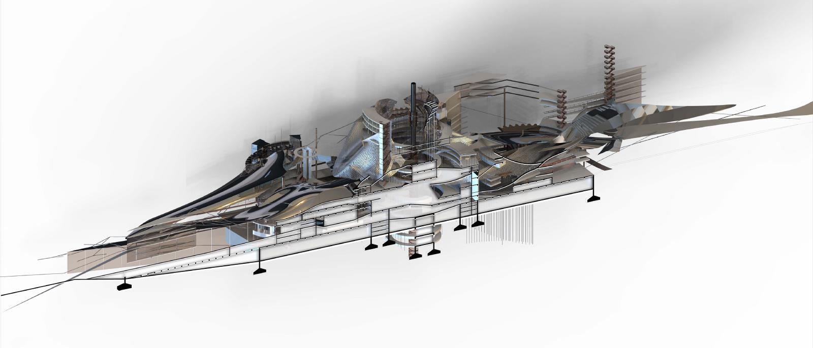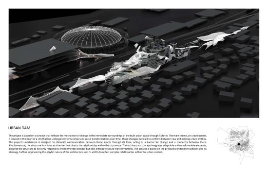 The project is based on a concept that reflects the mechanism of change in the immediate surroundings of the built urban space through its form. The main theme, an urban barrier, is located in the heart of a city that has undergone intense urban and social transformations over time. These changes have led to conflicts between new and existing urban entities. The project's mechanism is designed to stimulate communication between these spaces through its form, acting as a barrier for change and a connector between them. Simultaneously, the structure functions as a barrier that directs the relationships within the city centre. The architectural concept integrates adaptable and transformable elements, allowing the structure to not only respond to environmental changes but also anticipate future transformations. The project is based on the principles of deconstructivism and its ideology, further emphasizing the playful nature of the architecture and its ability to reflect complex relationships within the urban context.