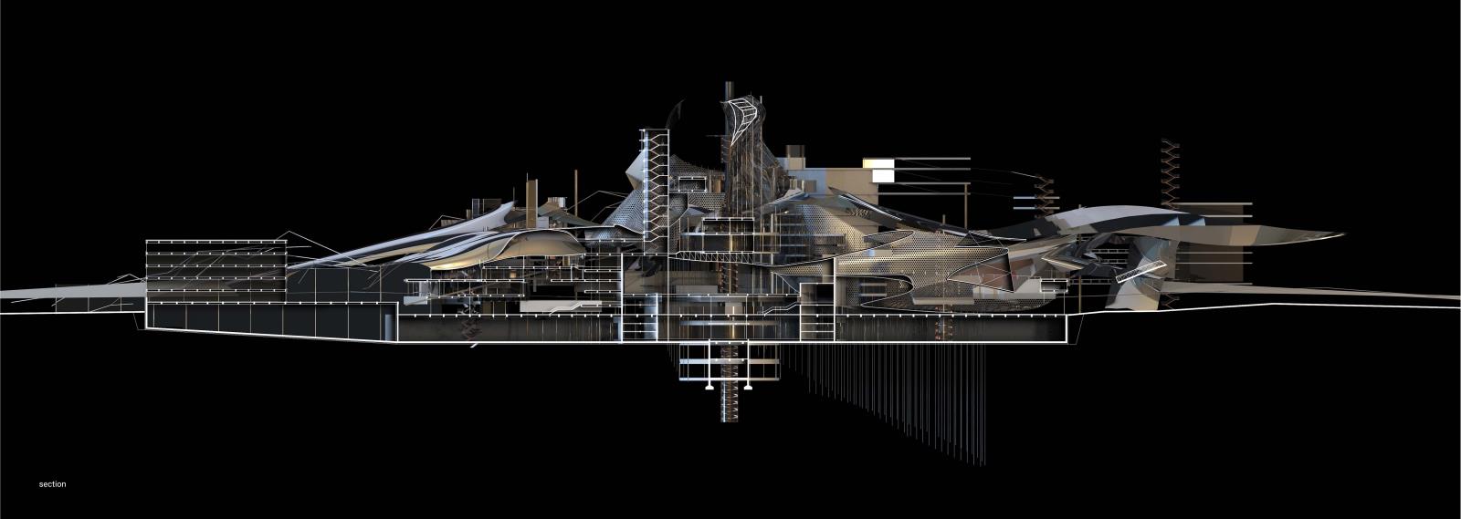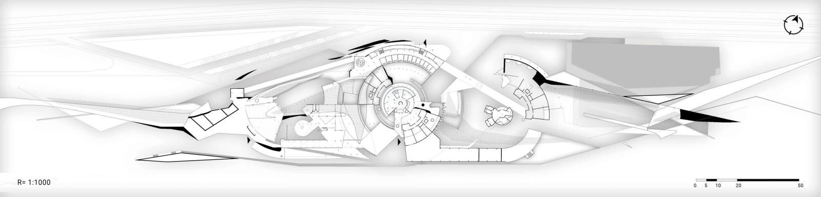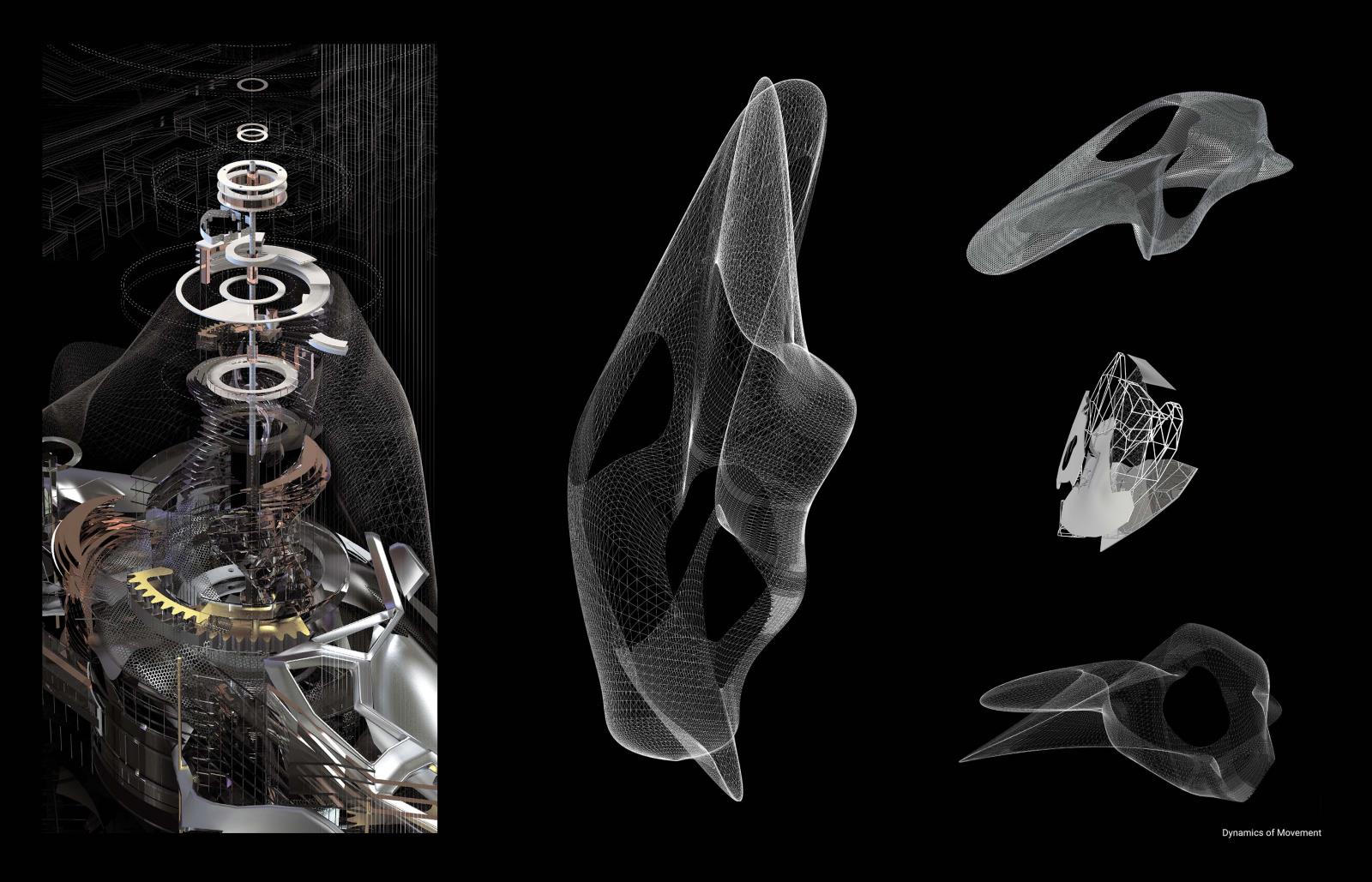 The project is based on a concept that reflects the mechanism of change in the immediate surroundings of the built urban space through its form. The main theme, an urban barrier, is located in the heart of a city that has undergone intense urban and social transformations over time. These changes have led to conflicts between new and existing urban entities. The project's mechanism is designed to stimulate communication between these spaces through its form, acting as a barrier for change and a connector between them. Simultaneously, the structure functions as a barrier that directs the relationships within the city centre. The architectural concept integrates adaptable and transformable elements, allowing the structure to not only respond to environmental changes but also anticipate future transformations. The project is based on the principles of deconstructivism and its ideology, further emphasizing the playful nature of the architecture and its ability to reflect complex relationships within the urban context.