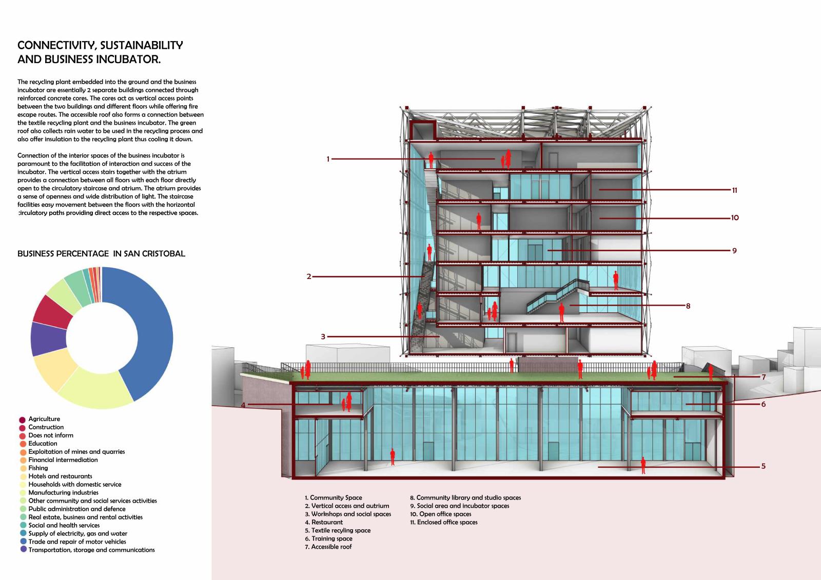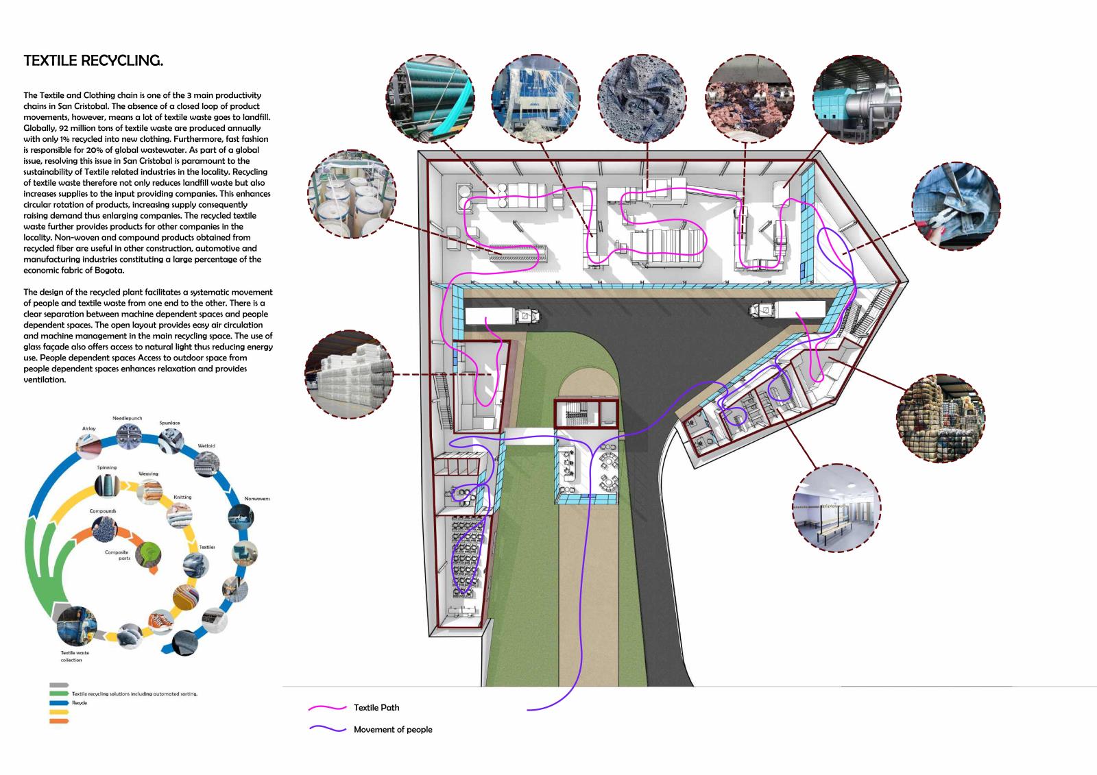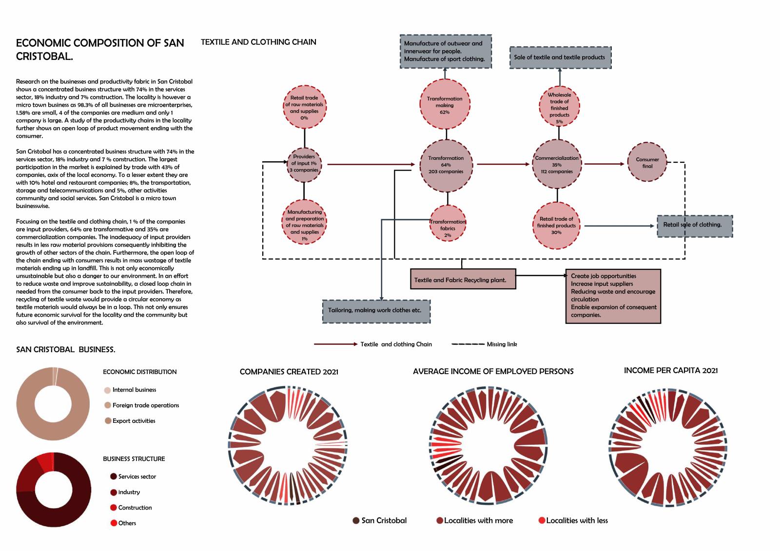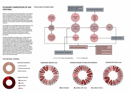 Research on the business structure and productivity within the disadvantaged San Cristobal shows a concentrated structure with 74% in the services sector; 18% industry and 7% construction. The locality is however a micro town business as 98.3% of all businesses are micro-enterprises. A study of the productivity chains in the locality further shows an open loop of products circulation. In the textile and clothing chain, the productivity loop between the consumers and the input suppliers is broken hence most of the textile waste ends up in landfill. This is not only economically unsustainable but also a danger to our environment. The project connects this link through implementation of a recycling plant forming a circular economic fabric. It also aims to empower smaller business through the provision of a business incubator, enabling growth, increasing employment and developing a sustainable economy.