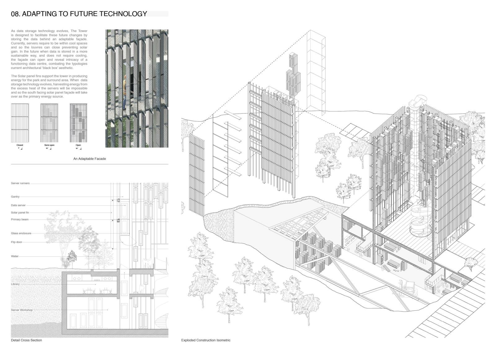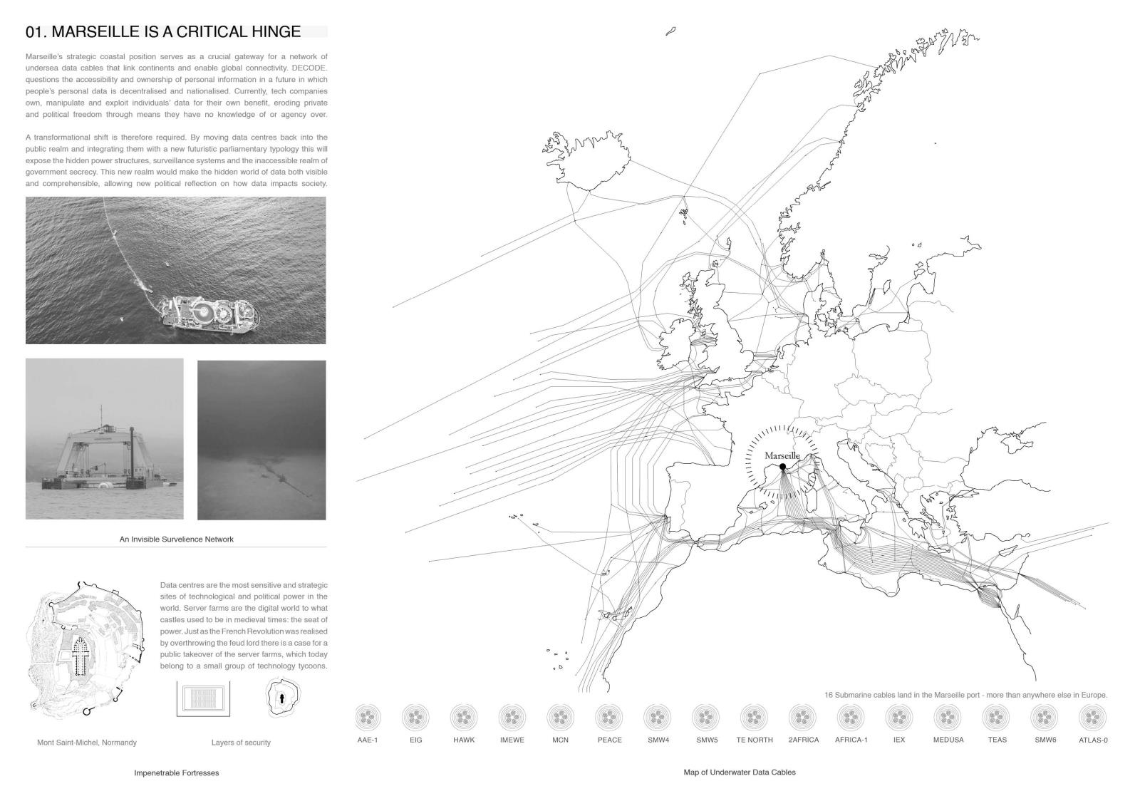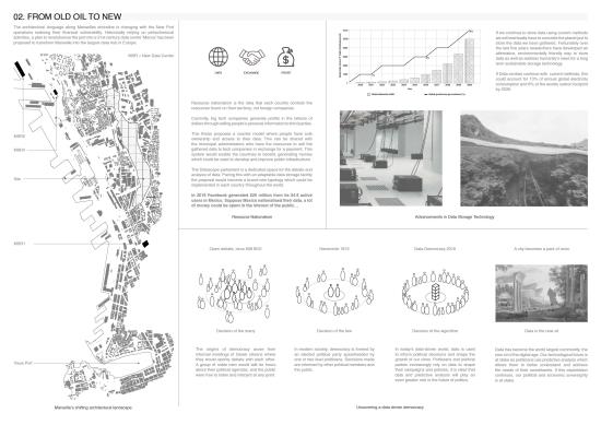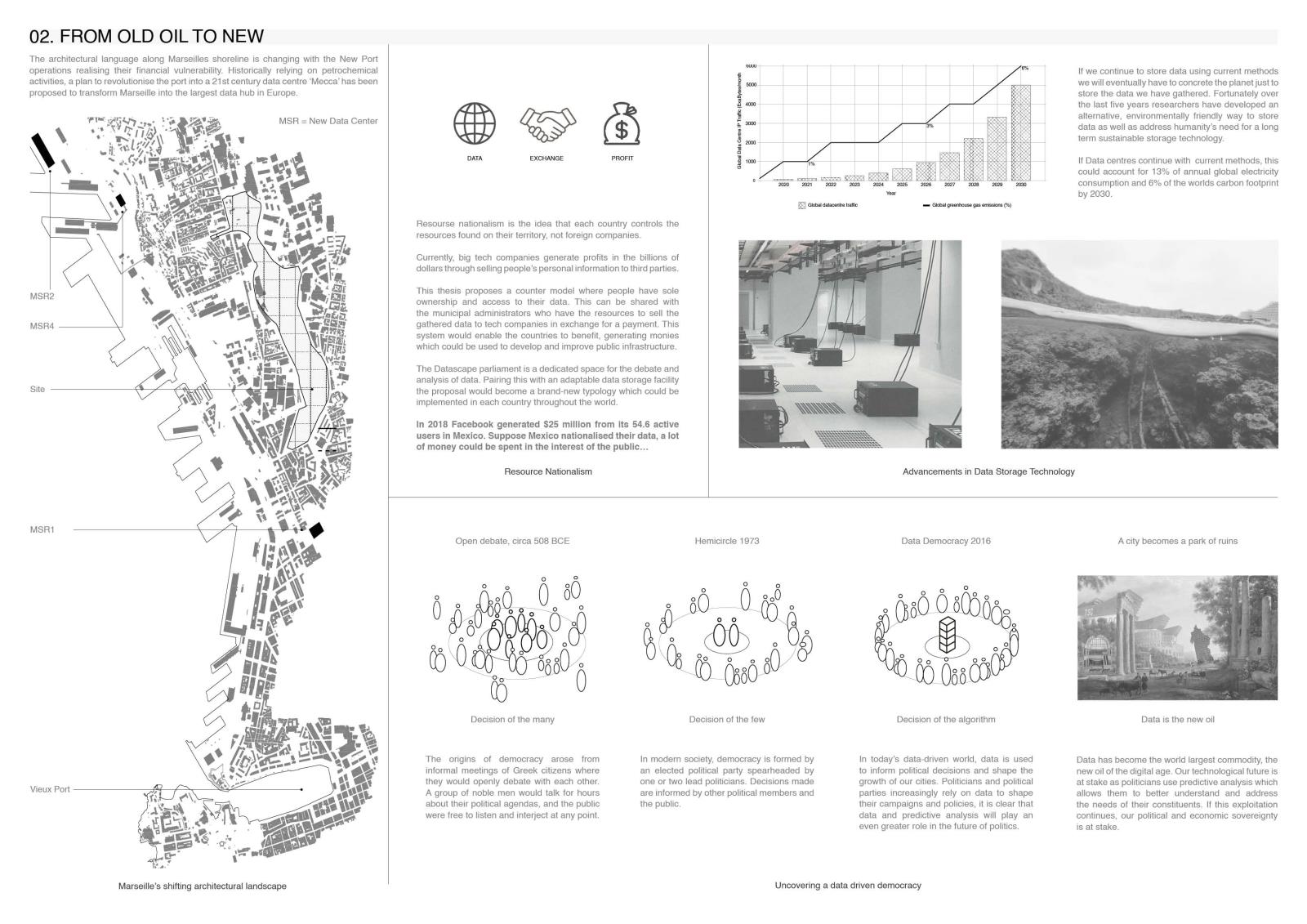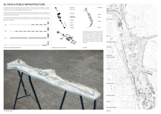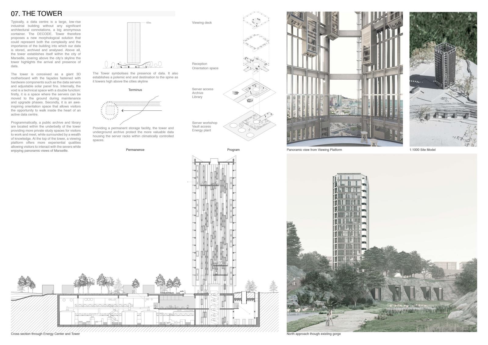 Decode Part 2 Project 2024 Euan Clarke Mackintosh School of Architecture | UK This thesis examines the accessibility and ownership of personal information, proposing a future where personal data is decentralised and nationalised. Data has become a major commodity owned by tech companies who transform private information into data points which they use to inform commercial decisions. This shift has compromised personal privacy, leaving people unaware of the surveillance and manipulation conducted daily. Data is stored in physical servers and these companies have succeeded at hiding them within ‘black boxes’ located in isolated locations, inaccessible to the public.If governance is no longer possible without exploitation of private information, then this thesis relocates data centres back into the city, combining them with a futuristic parliamentary typology that makes the incomprehensible data realm both visible and understandable. The new infrastructure will regenerate an abandoned landscape by implementing a flexible data storage solution while providing the necessary facilities that provide new civic opportunities as well as promote political discourse. It will be a place of political activation, a symbol of civil liberty uncovering new forms of life that would have been impossible if left in the hands of the big tech companies. Tutor(s) Thomas Woodcock