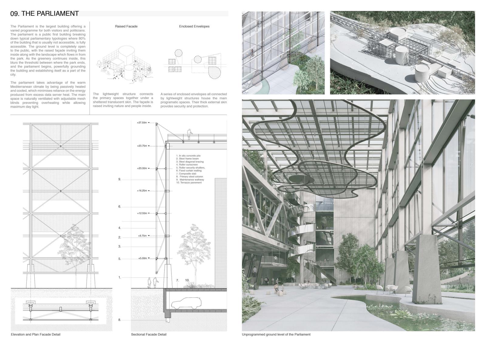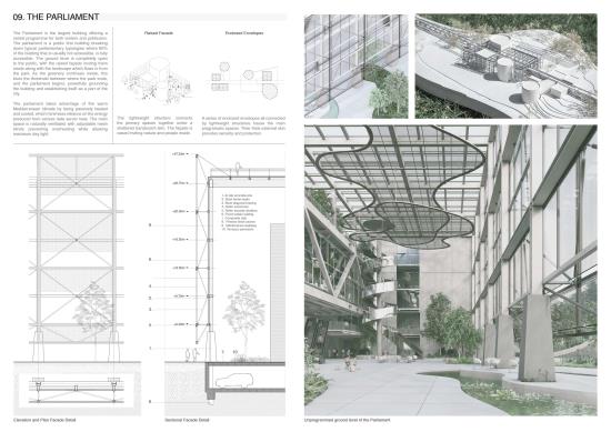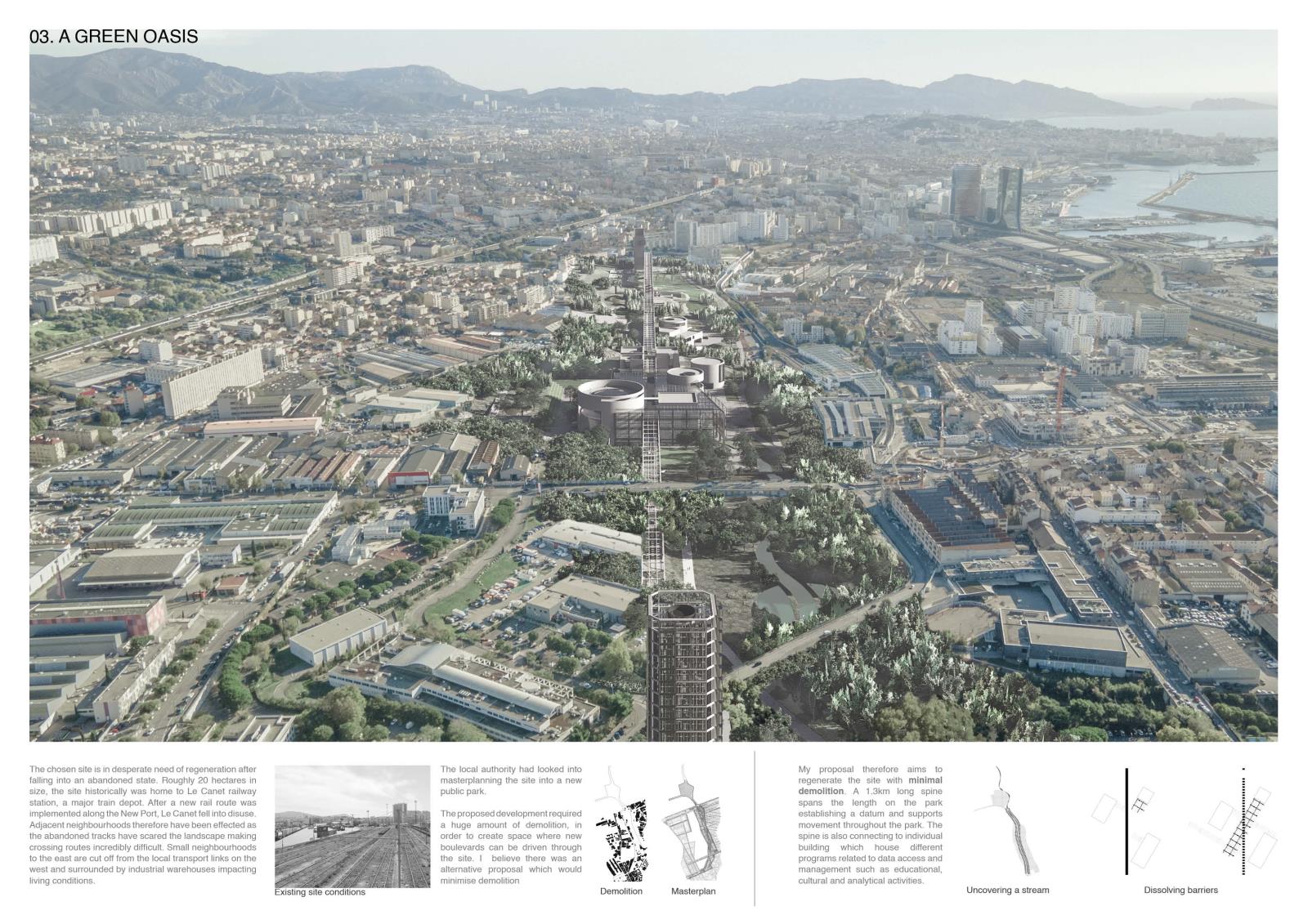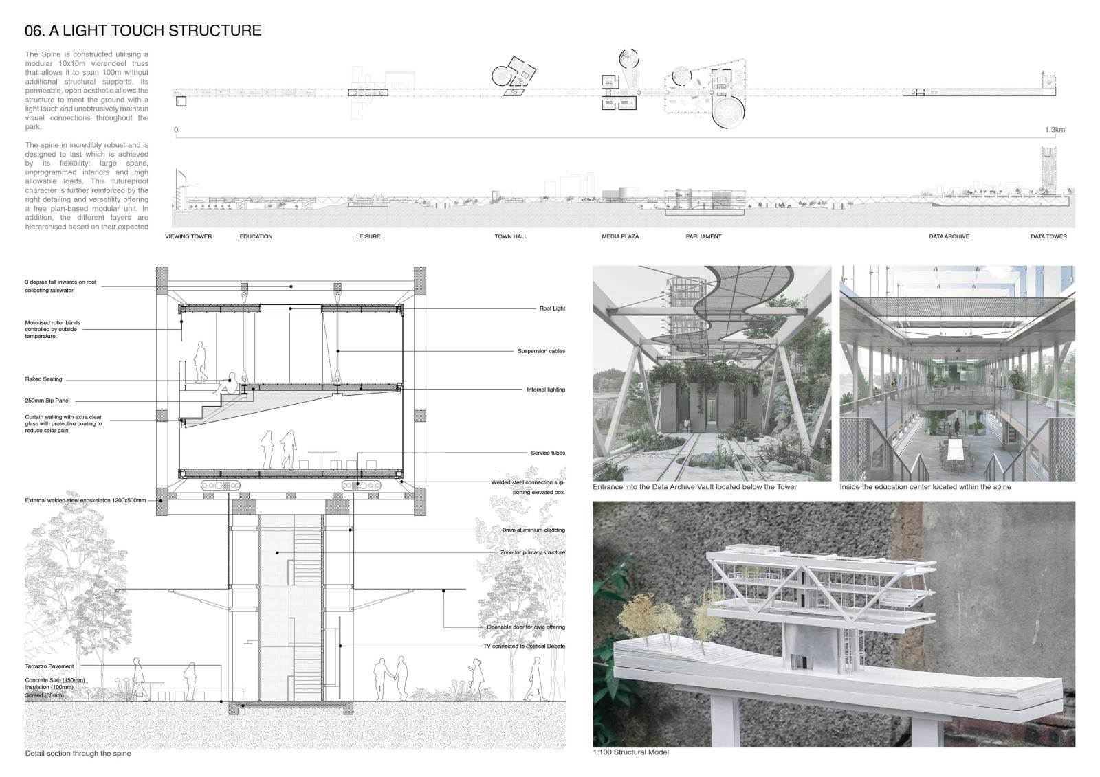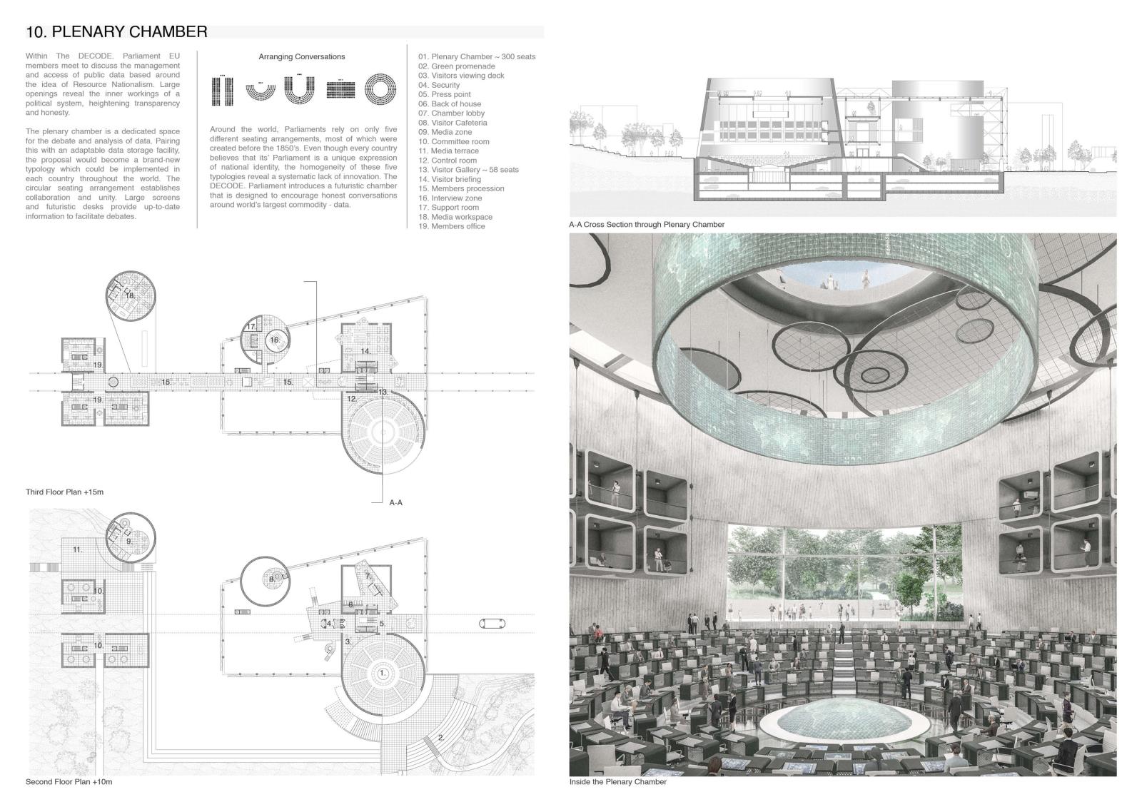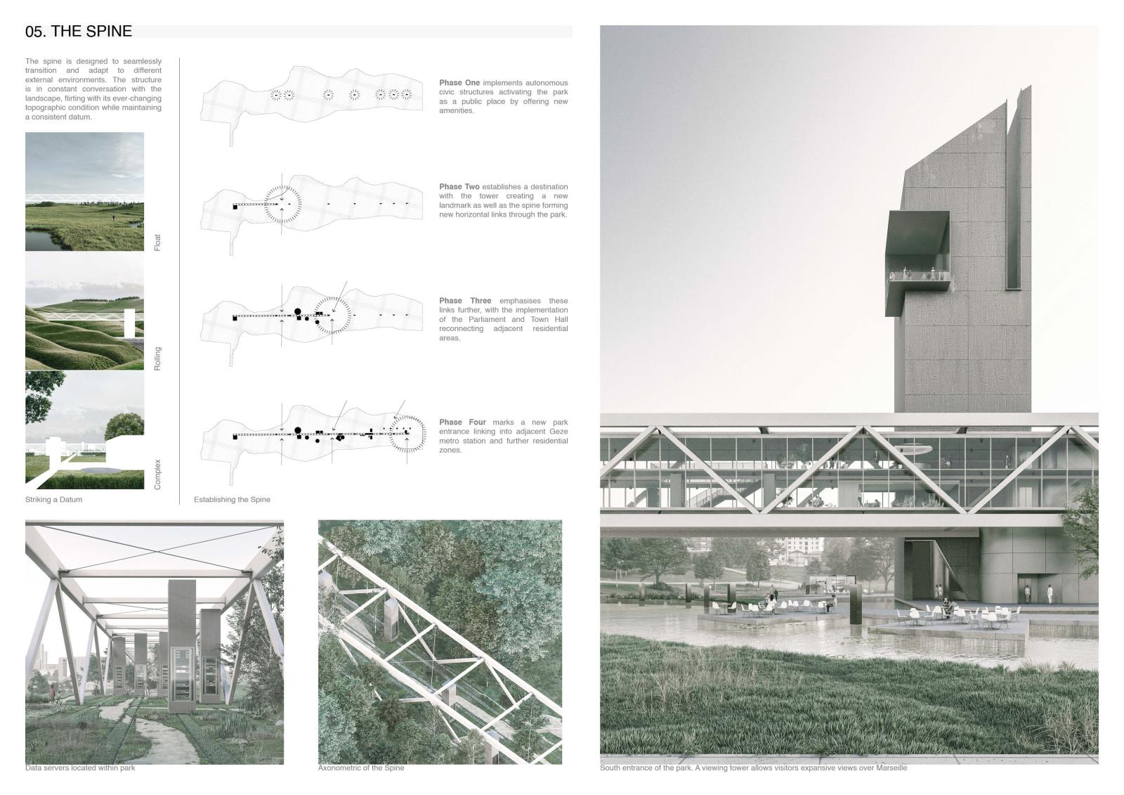 Decode Part 2 Project 2024 Euan Clarke Mackintosh School of Architecture | UK This thesis examines the accessibility and ownership of personal information, proposing a future where personal data is decentralised and nationalised. Data has become a major commodity owned by tech companies who transform private information into data points which they use to inform commercial decisions. This shift has compromised personal privacy, leaving people unaware of the surveillance and manipulation conducted daily. Data is stored in physical servers and these companies have succeeded at hiding them within ‘black boxes’ located in isolated locations, inaccessible to the public.If governance is no longer possible without exploitation of private information, then this thesis relocates data centres back into the city, combining them with a futuristic parliamentary typology that makes the incomprehensible data realm both visible and understandable. The new infrastructure will regenerate an abandoned landscape by implementing a flexible data storage solution while providing the necessary facilities that provide new civic opportunities as well as promote political discourse. It will be a place of political activation, a symbol of civil liberty uncovering new forms of life that would have been impossible if left in the hands of the big tech companies. Tutor(s) Thomas Woodcock