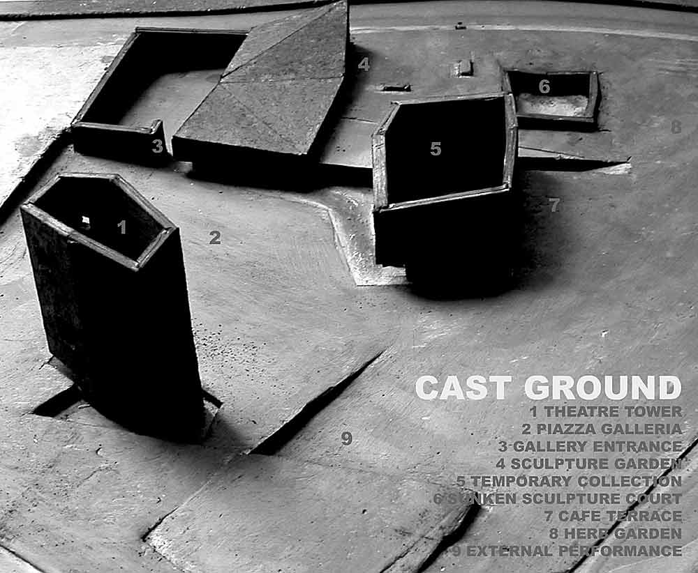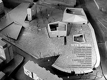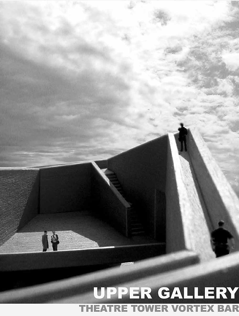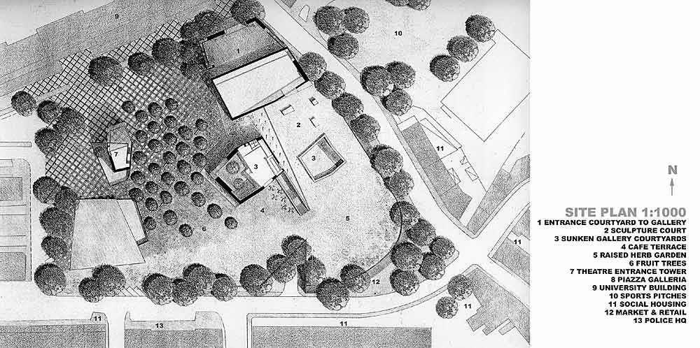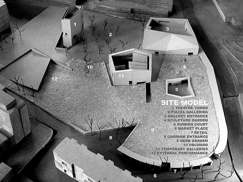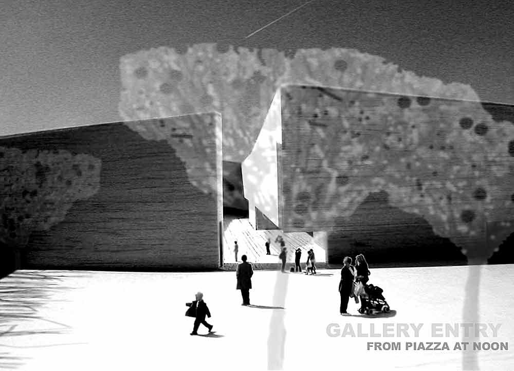 His design proposal re-uses basements which were designed as firing ranges for the testing of the factory's lenses, as site specific galleries which artists would be commissioned to work in. The temporary and permanent collections co-exist within a sunken topography of darkened rooms, illuminated with artificial light from deep triangulated concrete waffle slab ceilings. This subterranean world sits beneath and sometimes pops up onto a public piazza, which provides spaces for the adjoining university buildings to inhabit casually as well as for trade and domestic life to commingle. The large piazza is shaded from midday sun by a cluster of deciduous trees creating a pleasant venue for lunch, and in other parts is planted with grasses and herbs making an evening garden. The looming towers provide access to the various parts of the arts complex-the theatre and galleries and library are all interconnected below ground but appear as enigmatic figures grouped around the piazza. The sense of mystery and the complex oddness that they evoke, refers not only to the secret spaces within and under the ground, but also to the tradition of ruination, which pervades artistic and architectural visions of decrepitude and history. From Piranesi to Tarkovsky via De Chirico, strangely ambivalent scales of comprehension and identity characterize artists' visions of the cities. The strangeness of artworks and their uneasy relationship with everyday experiences is here exaggerated and made slightly sinister and moc