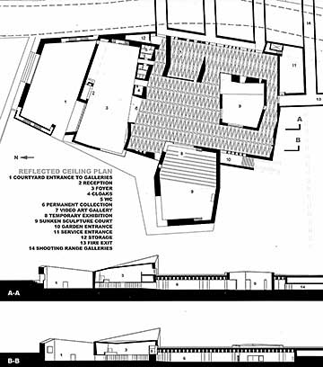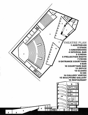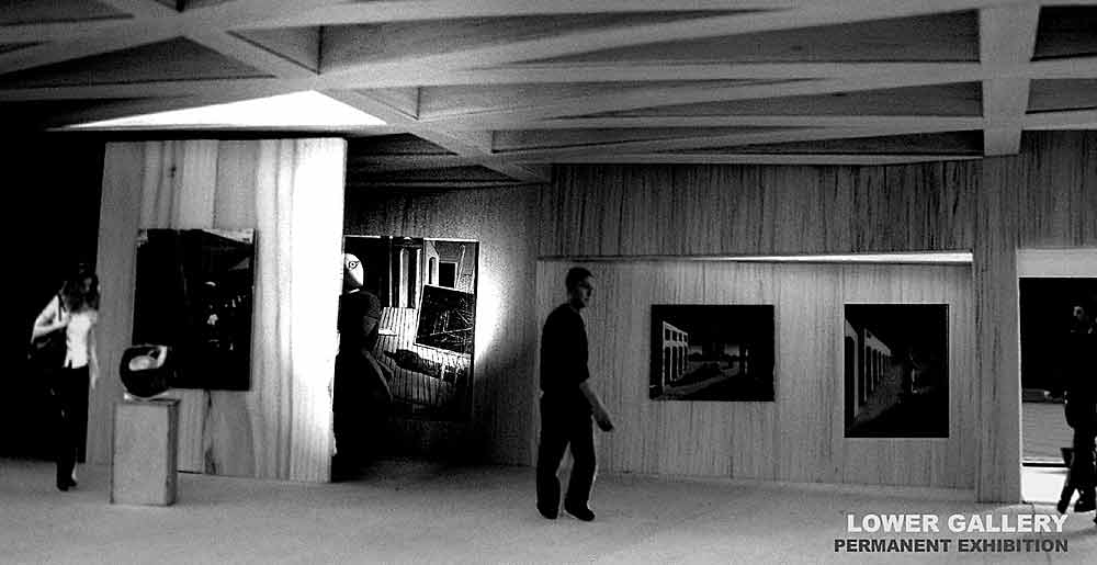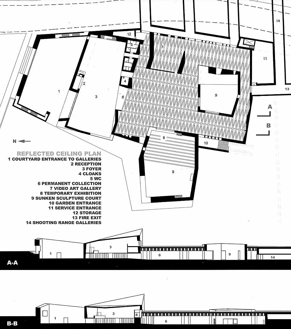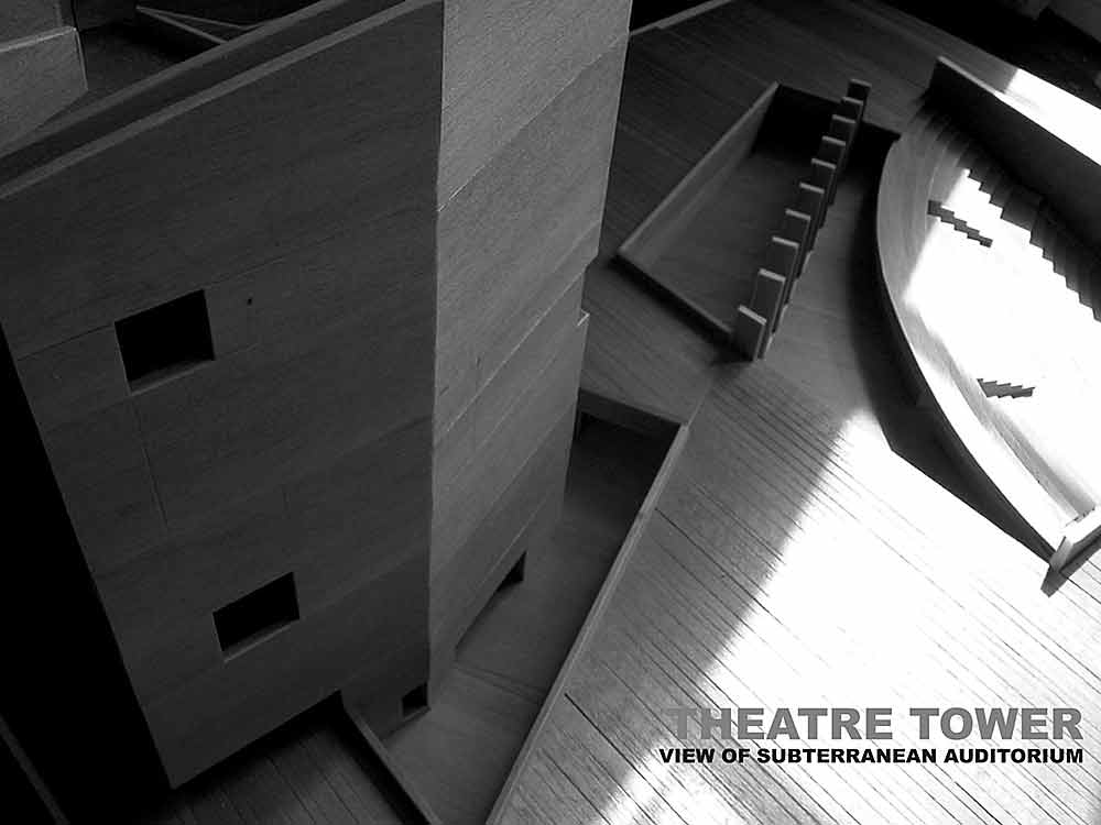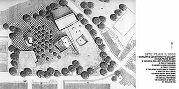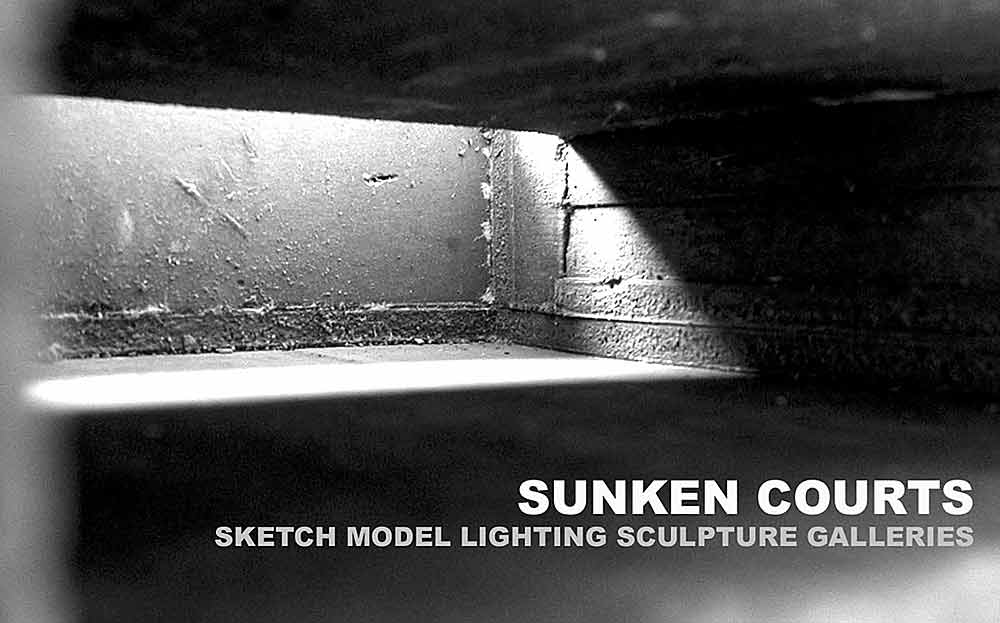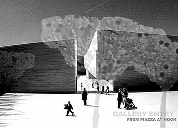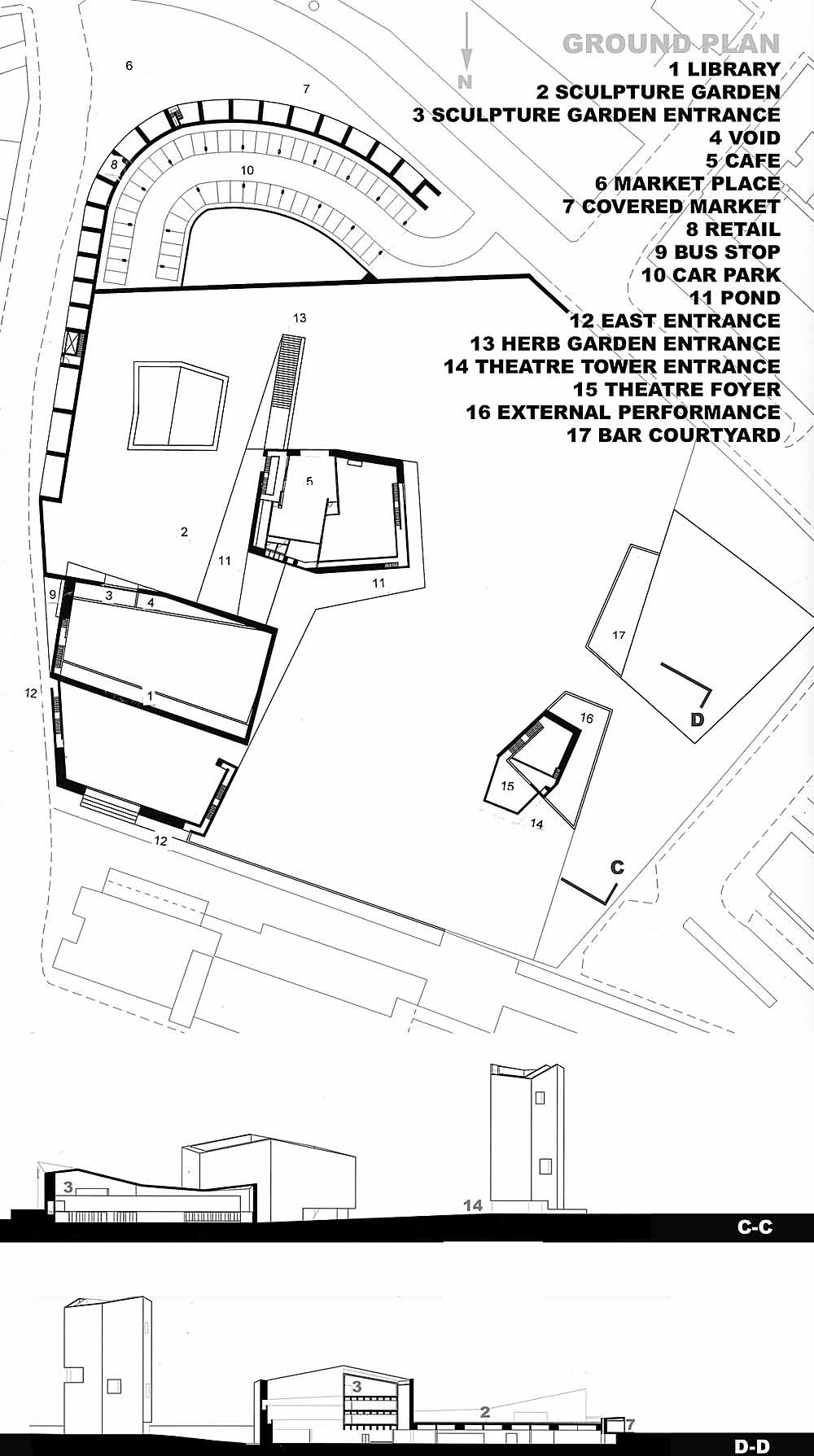 His design proposal re-uses basements which were designed as firing ranges for the testing of the factory's lenses, as site specific galleries which artists would be commissioned to work in. The temporary and permanent collections co-exist within a sunken topography of darkened rooms, illuminated with artificial light from deep triangulated concrete waffle slab ceilings. This subterranean world sits beneath and sometimes pops up onto a public piazza, which provides spaces for the adjoining university buildings to inhabit casually as well as for trade and domestic life to commingle. The large piazza is shaded from midday sun by a cluster of deciduous trees creating a pleasant venue for lunch, and in other parts is planted with grasses and herbs making an evening garden. The looming towers provide access to the various parts of the arts complex-the theatre and galleries and library are all interconnected below ground but appear as enigmatic figures grouped around the piazza. The sense of mystery and the complex oddness that they evoke, refers not only to the secret spaces within and under the ground, but also to the tradition of ruination, which pervades artistic and architectural visions of decrepitude and history. From Piranesi to Tarkovsky via De Chirico, strangely ambivalent scales of comprehension and identity characterize artists' visions of the cities. The strangeness of artworks and their uneasy relationship with everyday experiences is here exaggerated and made slightly sinister and moc