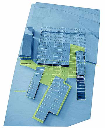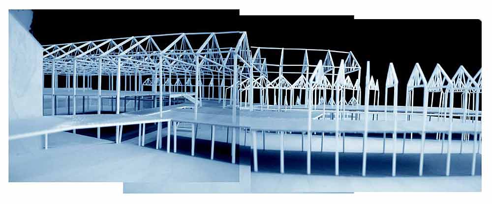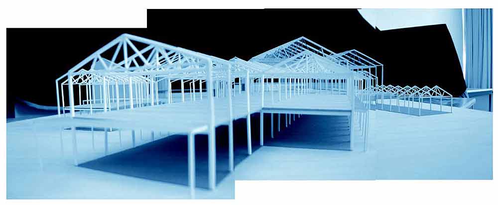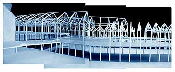 Quayside School Part 2 Project 2003 Alice Fung University of Bath | UK When thinking about the significance of the school in today’s society I decided to look beyond the standard parameters one might consider and design a school that intentionally allowed for flexibility within the framework of both the educational programme and the spatial arrangement. The education of children today cannot be pigeon holed within impenetrable and finite parameters. Instead I attempted to design a school where the building programme allows for the appropriation of territory so that the student can develop levels of responsibility and social awareness outside the structured curriculum. The rigidity of the institution is softened through the buildings translucent materiality. The project was intended as a critique of the government's school programme. Alice’s project was important for the emphasis it put on the experience of being at school. The project tries to develop the relationship that a school has with its constituency. It seems very optimistic and powerful that such an appropriate atmosphere could emerge from a strategy that relied on marshalling existing resources on the site as much as it did on new form.The final project has a light, cloud like quality to it using simple technologies and forms: every new structure only makes sense in relation to an existing one.
