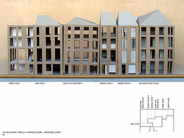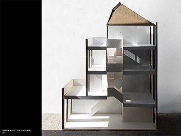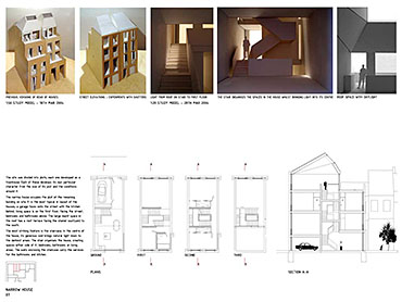 Seven Town Houses in Antwerp Part 2 Project 2004 Richard Marks London Metropolitan University | UK A battered yet sturdy landscape of industrial decline; Antwerp’s 18th-century docklands are currently being revitalised by an influx of young artists and designers. Townhouses make up the majority of Antwerp’s residential stock; solid, spacious shells adapted to endless situations. This proposal reinterprets the historic townhouse and fills a void at the end of an otherwise well-defined urban block.Exploration through model-making resulted in the adaptation of each of seven houses proposed on the site to its immediate context, shaping coherent and pleasing interior spaces. Although this is an academic exercise, my intention has been to work with as great a sense of realism as possible. Detailed design aims to reconcile the contextual and aesthetic with the pragmatic constraints of building. The unit focuses on specific locations with a clear interest in the actual process of building or constructing within a precise cultural framework.Avoiding overbearing ideological constructs all students are required to formulate an architectural proposal as a direct response to a particularcontext. Richard’s portfolio is exemplary in the sense that his project examines the typology of the town house in the historic city of Antwerp. Heis able to demonstrate that design development through a series of working models, can reach higher levels of refinement. Precise and well judgeddetailing reveal a careful approach that is both innovative and concerned with examining the relationship between structure and final finishes while the general concept remains intact.