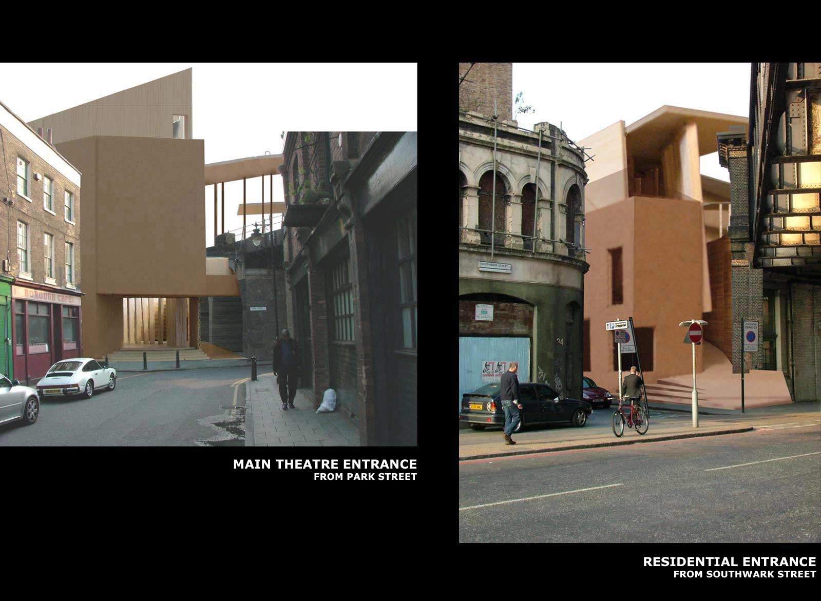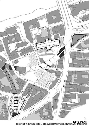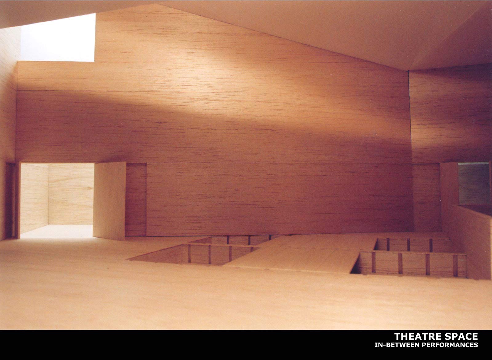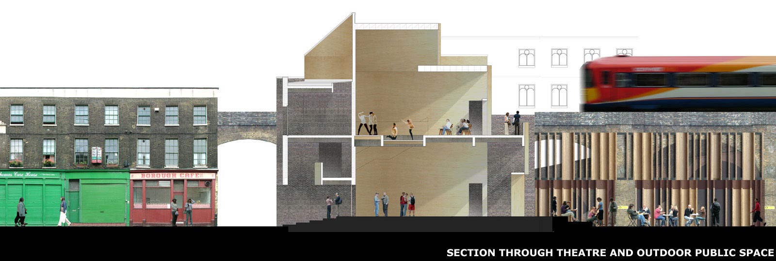 Southwark Theatre School Part 2 Project 2004 Irena Stoeva Kingston University Kingston | UK This project is for a Southwark Theatre School. The school is a higher education facility for the dramatic arts, located north of Southwark Street nearby Borough Market on London’s South Bank. The site consists of an urban void formed by the junction between two railway viaducts, and its immediate surroundings. It is a highly layered fragment of urban fabric with many different activities in a small area. The theatre school builds upon the inherent theatricality of the site, and enriches the existing context by overlaying its own programme onto that of the public domain. The building aims to profoundly situate the students and staff of the school into their social environment. The building provides public performance spaces, teaching facilities and student accommodation. The relationship between the individual, the community of the building, and the city around them, informs the architecture of the school.The proposal is constructed around ideas of democratic and participatory space, which relate to the theatres of ancient Greece, as well as those of Elizabethan Southwark. The school aims to encourage greater participation in theatre performances by challenging the convention of contemporary theatre space. The performance spaces are daylit to undermine the prioritisation of space and create an environment where the audience is no longer a passive witness but aware to be made up of individuals all part of a community. The spatial experience of the building consists of a series of loosely defined, ambiguous, interlocking spaces. These spaces are graduated and differentiated by the changing conditions of the ground and the ceiling. The subtle manipulations of the flow of space establish transition from the most private to the most public areas. Therefore rather than a definitively formed designated theatre space, the performances can take place in various locations. In this way the spatial manifestation of the building becomes a metaphor for the role of th Irena's Theatre School emerged from impressive research into both the city and the idea of theatre – the latter being a key dimension of the history and contemporary reality of the site. The result is a remarkable project which offers an innovative rethinking of the spatial structuring of the theatrical event, allowing for a genuinely participatory experience of the building, in both the performance and the public/foyer spaces. The tectonic quality of the building enhances this ‘ambiguity of boundaries’ and consistently convinces of the appropriateness of the project to both site and purpose.