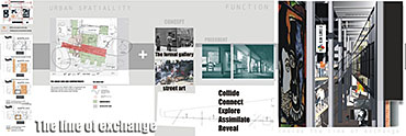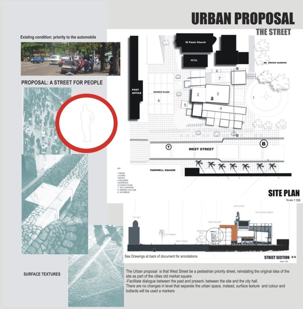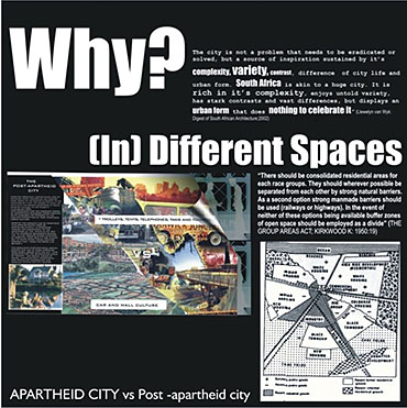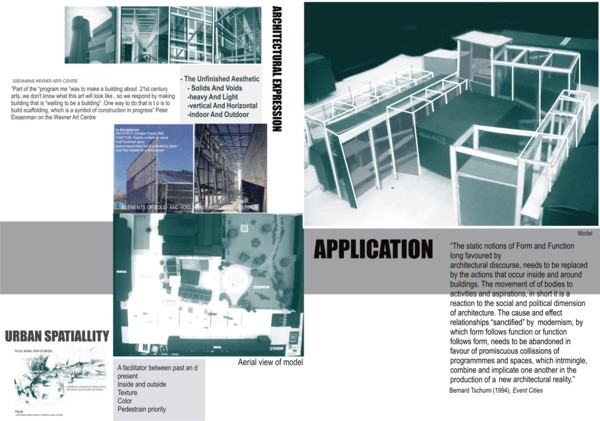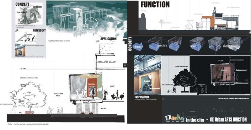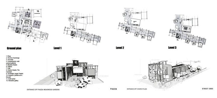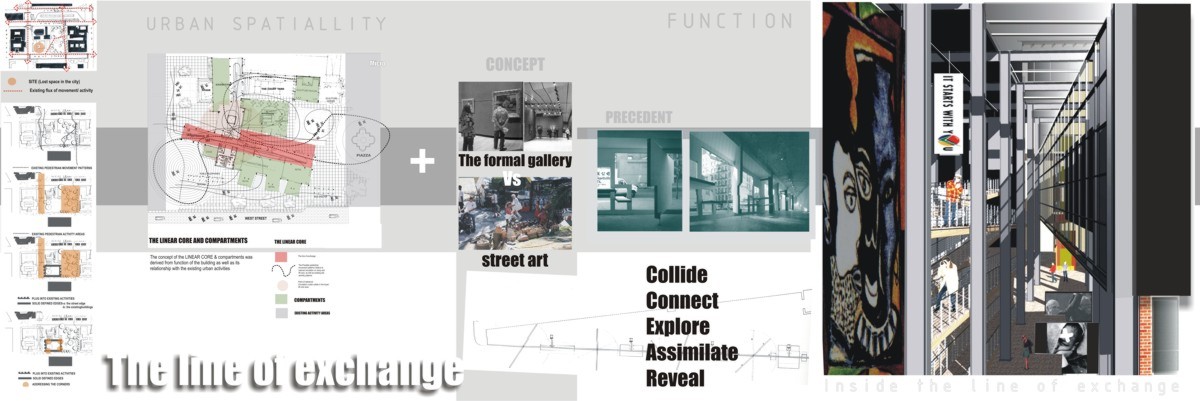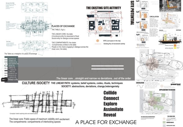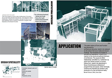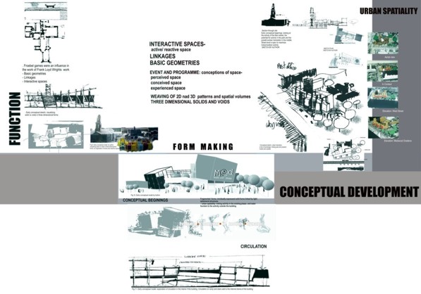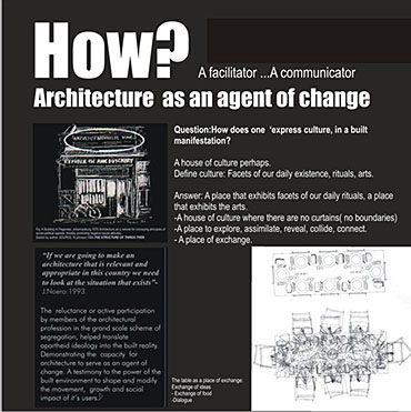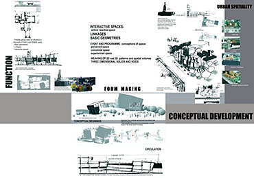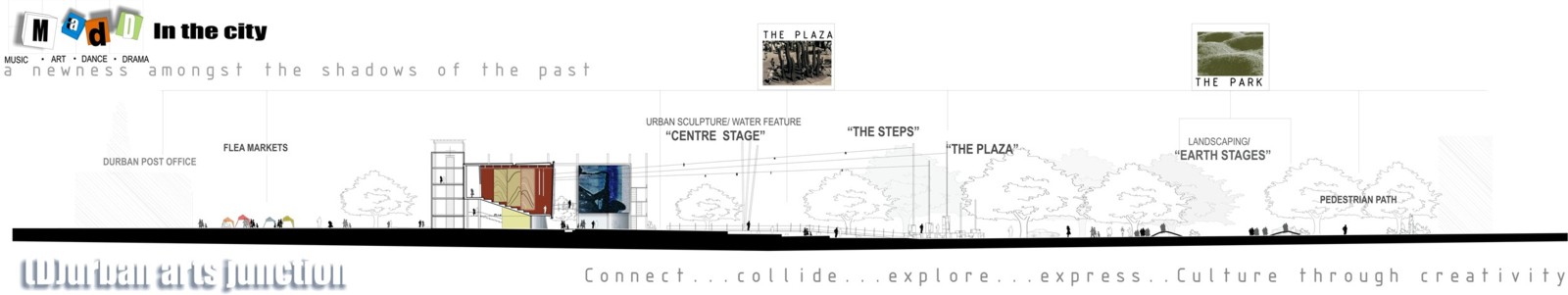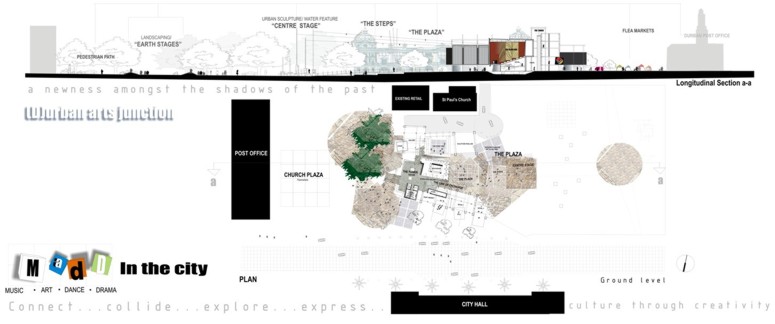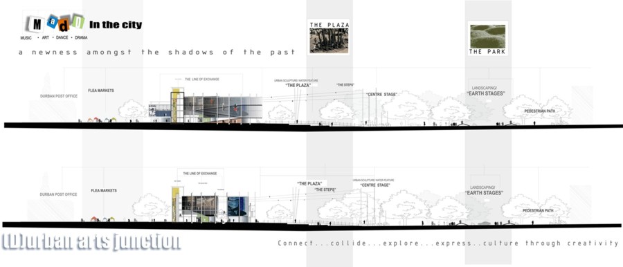 M.A.D.D.( Music Art Dance Drama)in the city: D(urban) Arts Junction Part 2 Project 2004 Charlene Pillay University of KwaZulu-Natal Durban | South Africa Present society offers a rich, complex and in many ways more paradoxical spectrum of choices than ever before. How do we plan and build for a world that becomes more heterogeneous everyday? The architect is divided between programmes in continuous societal transformations and the task of integrating them with the world of conventional things, in accord with political circumstances and the aspirations to that which is ideal, complete and unified. This has resulted in a change in the historical mission of architecture, owing to the complexity of social relationships and interactions, and also to the radical collapse of time in which social exchange takes place. It is no longer sufficient for architecture to accommodate or express ideas and events, but rather that it participates in social transformations, becoming more fluid and kinetic than ever before. In theory, M.A.D.D In the city is a search for “a new approach” in both language and tools of architectural expression. Instead of a complete system, which results in a finished, defined building. It is an open work, inseparable from the urban tissue. While simultaneously having the capacity to adapt to a changing environment and remain ‘open’ to the new or the ‘unexpected’, it is an attempt to create an architecture, which is no longer, just a part of the urban setting, but one that performs on the urban stage.In practice,is an intervention that reinterprets conventional performance space and galleries and caters for the needs of a changing SA urban culture. An interpretation that fuses contemporary performance space with the spontaneity of street art, and is easily accessible to city inhabitants . It is devoid of cultural association but rather a facilitator of dialogue between the arts and the public. The location in the heart of Durban provides the eclectic backdrop for a newness of post-apartheid Durban present amongst the shadows of colonial Durban past, an expression of culture through creativity. This submission won the acclaim of the examiner’s for its engagement with complex urban issues in a changing society and the production of a high quality document suited to the professionalism of a coffee table issue.The multi-faceted research exploration has borne a strong theoretical underpinning for the subject matter. The document cleverly synthesizes the findings and results in a gem of a building portraying the multi-cultural diversity and interchangeability of present day central Durban.