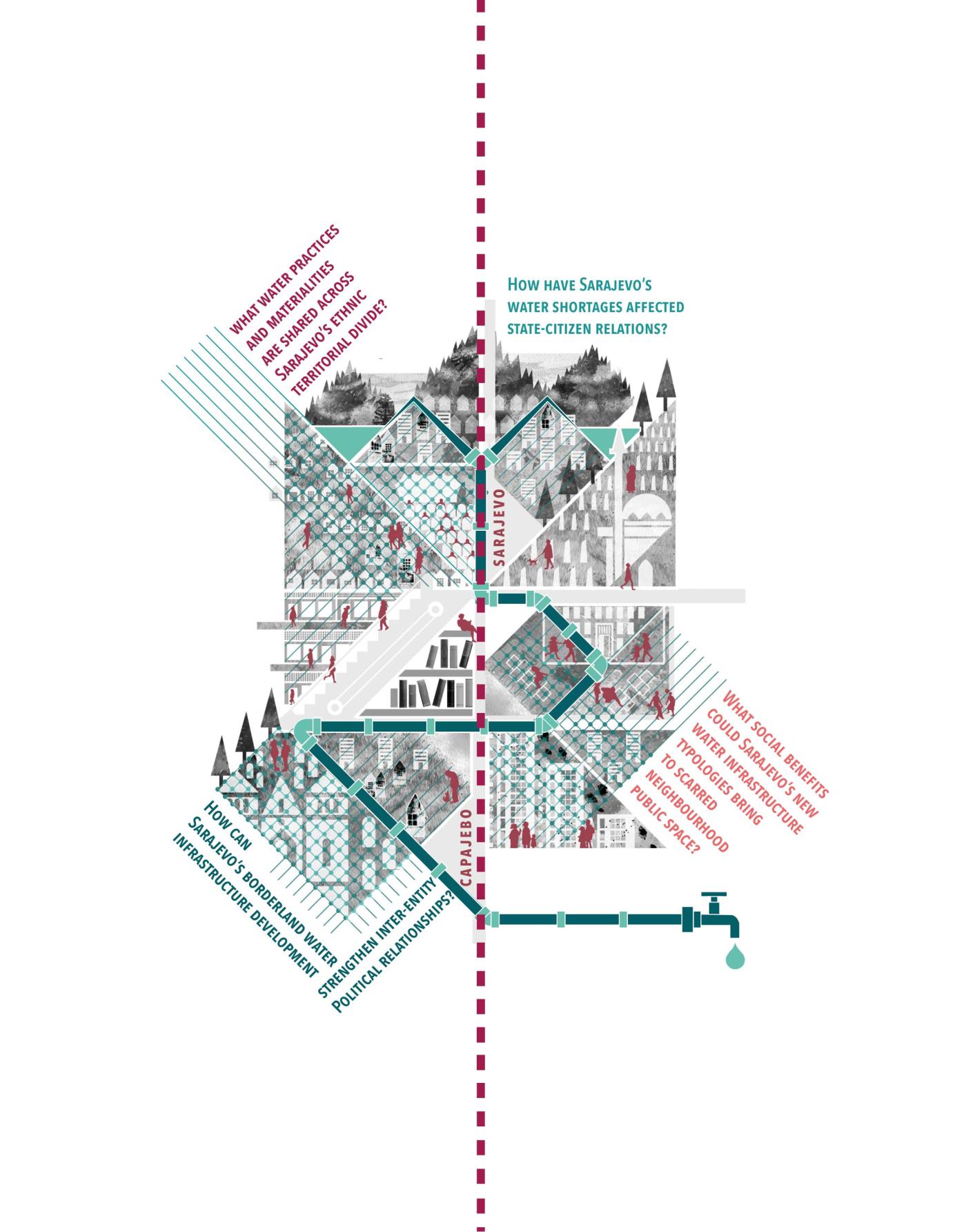 Peace in the Pipelines: Hydro-Social Infrastructure Development in Bosnia’s Urban Borderland Part 2 Dissertation 2020 Joanna Leigh-Bedford University of Cambridge | UK On the 25th anniversary of the end of the Bosnian War, this research asks - can water infrastructure development progress long-term peacebuilding efforts in contested territories? Although water is Bosnia’s most abundant natural resource, less than 65% of the population are connected to public water utilities. As international investment pours into the state water infrastructure sector, Sarajevo’s subterranean water network is used as a lens to investigate tripartisan ethno-national governance, yearning for pre-war normality, social customs of ethnic division and the psychology of dealing with individual and collective trauma. Capitalising on the grid’s horizontal and vertical span across geographical, political, social and cultural spheres, this research investigates what a truly ‘sustainable’ water infrastructure development could contribute to the splintered city of Sarajevo. In light of the current global health crisis and the growing impacts of climate change, the research empowers the politically underrepresented domestic end users, whose voices often go unheard. The research was informed by seven months of immersive fieldwork conducted in Sarajevo, while collaborating with the NGOs Project 1948 and the Post-Conflict Research Centre. Tutor(s) Hanna Baumann Christopher Hamill Ingrid Schröder