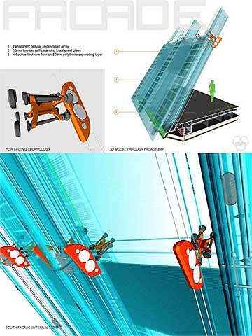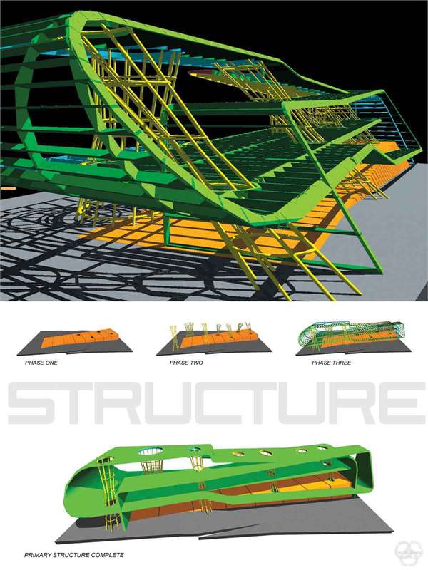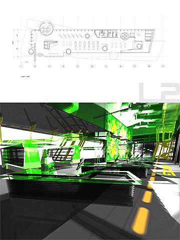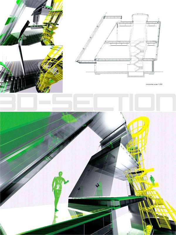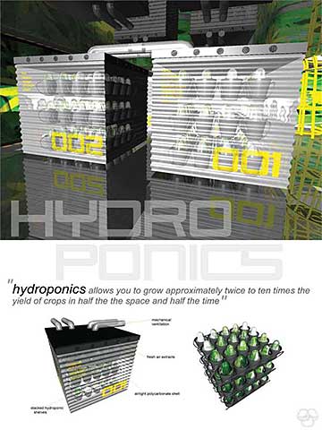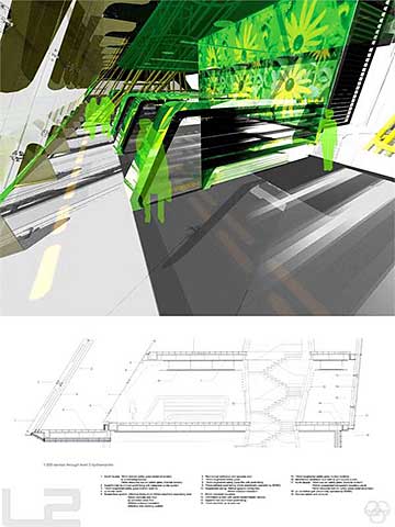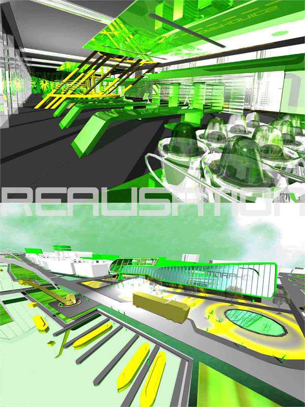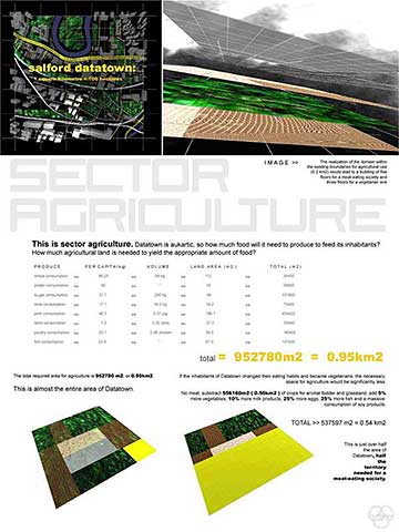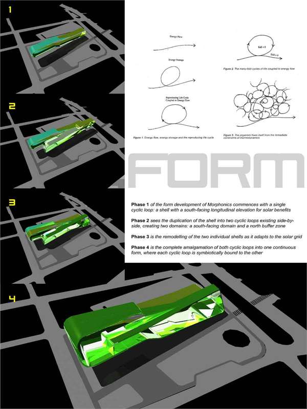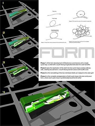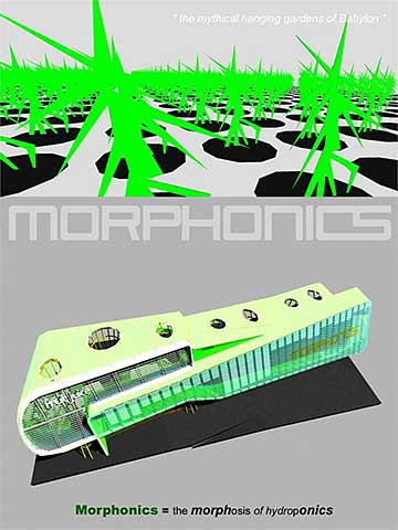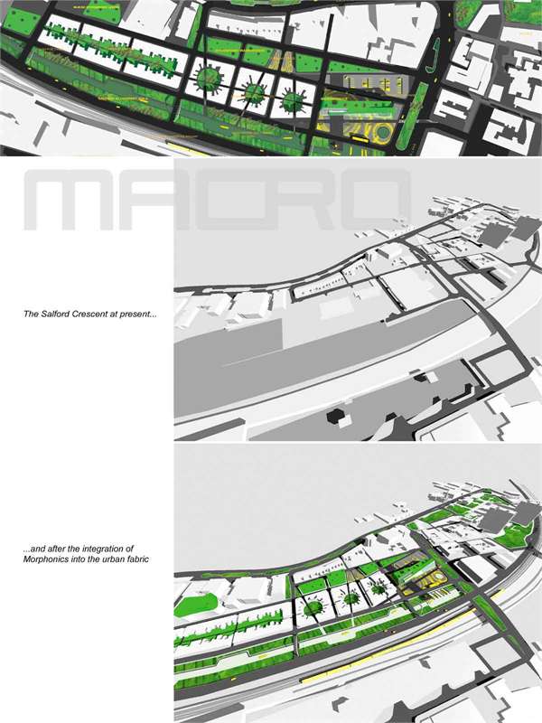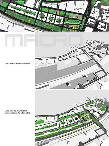 Morphonics - "The Morphosis of Hydroponics" Part 2 Project 2005 Souvik Das-Munshi Manchester School of Architecture | UK Morphonics is a regenerative scheme situated next to the Salford Crescent just outside of Manchester. The primary concept was to use hydroponics as a sustainable means to produce food and vegetation for the micro, meso and macro site. By growing food directly within the scheme, the energy required to transport produce to superstore shelves has been completely eliminated. The entire scheme was heavily based on an intimate relationship between 2d and 3d design, allowing a dynamic form to be developed, outside the realms of Cartesian realism. Sustainability has been integrated into the morphogenetic process of design at each key stage. Sho’s scheme starts with a spatial analysis of the needs of Salford with respect to its future as a sustainable ‘slow city’. Space isn’t a luxury here – Salford has 62% ‘green(ish) space’ – it has decayed from within. The design is a new landscape insertion –a continuously productive urban landscape – that culminates in a hydroponic vegetable-producing supermarket that uses the re-invigorated canal as a transport route. The building itself is iconic – a folded surface that the water and people flow up and down. It is a precursor for a new hybrid city – which is a mechanical, botanical and virtual superorganism.
