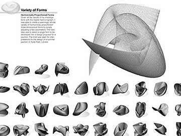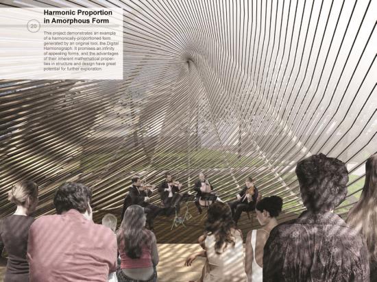 A music pavilion is proposed whose form was generated by software I wrote, the ‘3-D Digital Harmonograph’. This is based on a mechanical device said to visualise musical harmony by drawing apparently spatial graphs. I developed actual 3-D single-looping line graphs by adding a dimension, employed Fibonacci number ratios and harmonics thereof, and translated them into proportionate continuous surface-meshes.