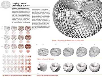 This student investigated harmonic proportion in amorphic form. Building on a found device, the harmonograph, the student scripted in ‘Visual Basic,’ a parametric tool that develops 3D forms with an embedded mathematical rigor.