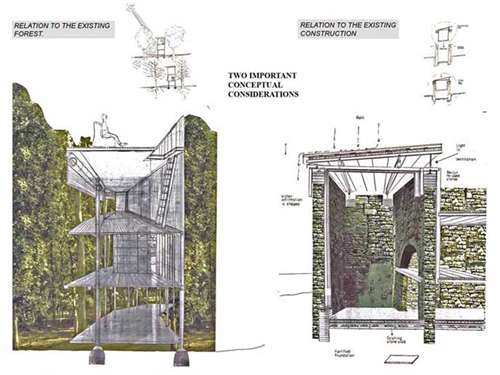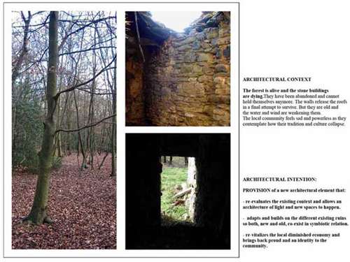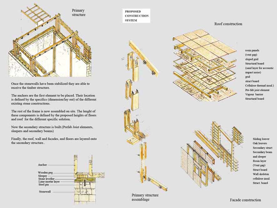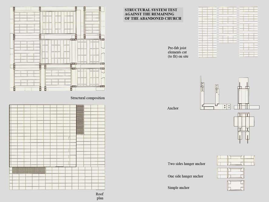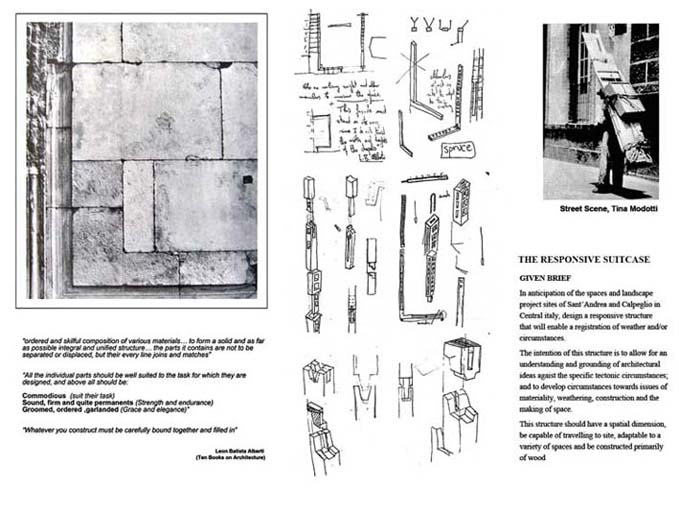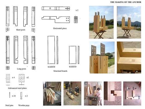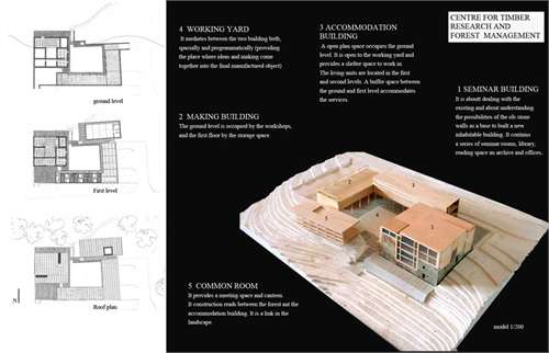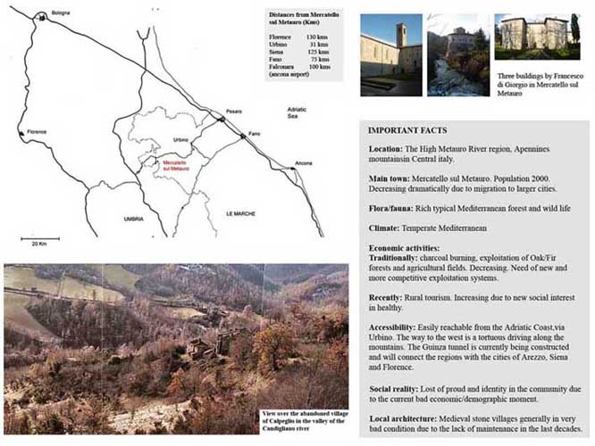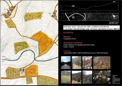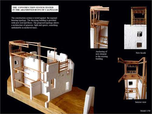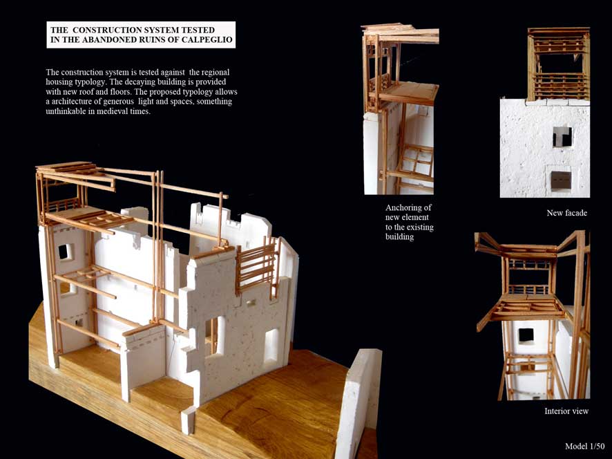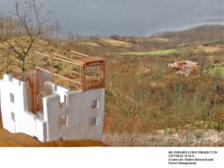 Re-inhabitation project in the Metauro Valley of Central Italy Part 2 Project 2006 Ricardo Lopez-Rivas University of East London London | UK The proposal provides a timber construction system that allows for the re-inhabitation of the currently abandoned medieval sandstone villages in the Marches region of Central Italy. This system is framed within a sustainable use of the local forest resources and the ambition towards the re-vitalization of a local architecture as well as a diminished local economy. Pivotal in the project is the construction of a Centre for Timber Research and Forest Management located in and around an abandoned church and the reconstruction of the nearby hamlet of Calpeglio which is used as a testing ground for domestic application. The unit's programme pursued an exploration into the art of building with an emphasis towards the idea that a strong sense of materiality can give meaning in architecture. Our context for the work was two remote medieval hamlets which lie in the foothills of the Apennines, 30 kilometers to the west of Urbino. Working against these remnant structures Ricardo sought out an innovative architecture that allows for a new measure and finesse of inhabitation and an eloquence of material existence. Crucial to the development of the project, was the building and testing at a scale of 1:1.