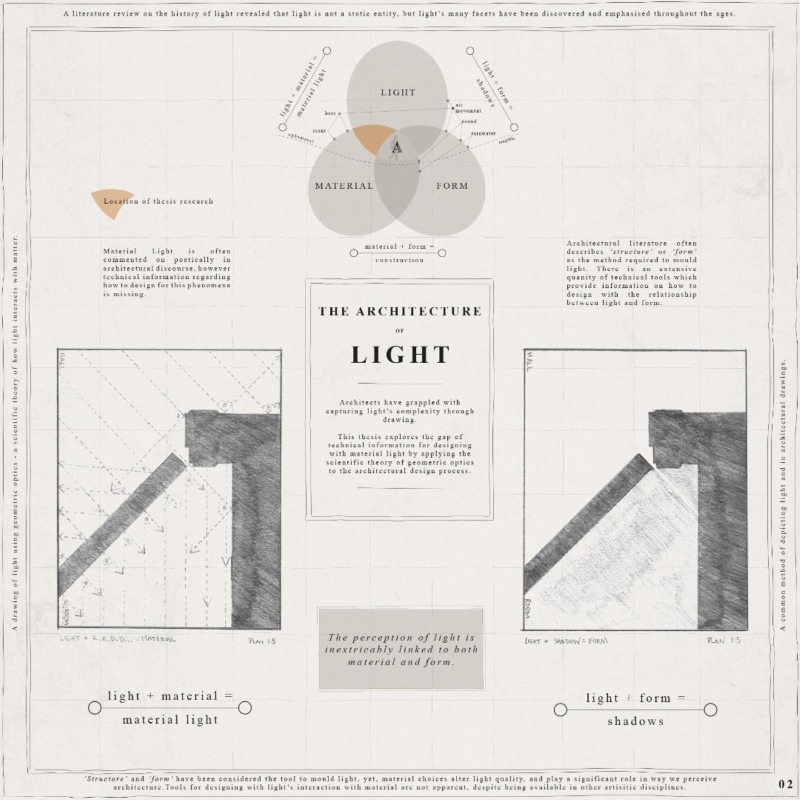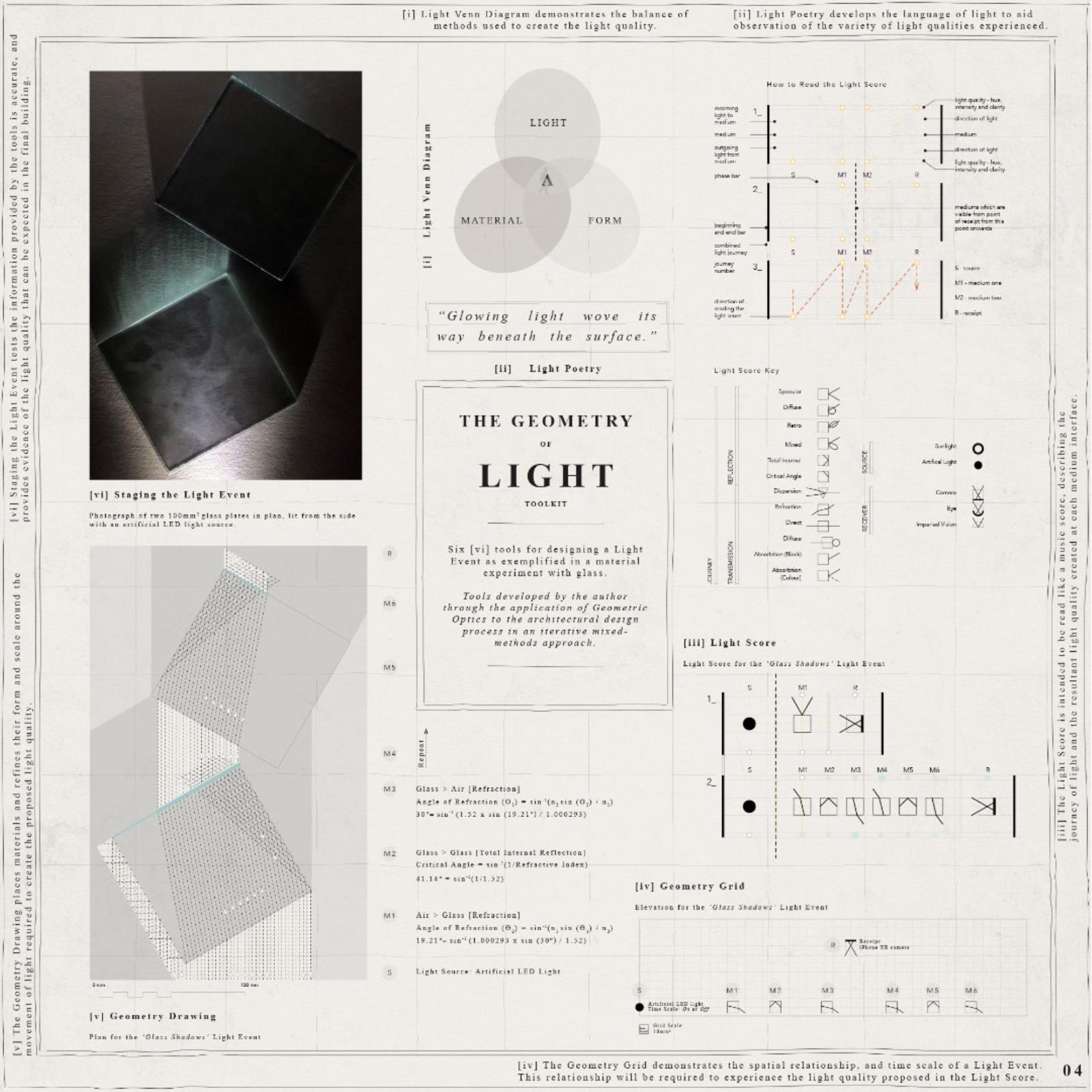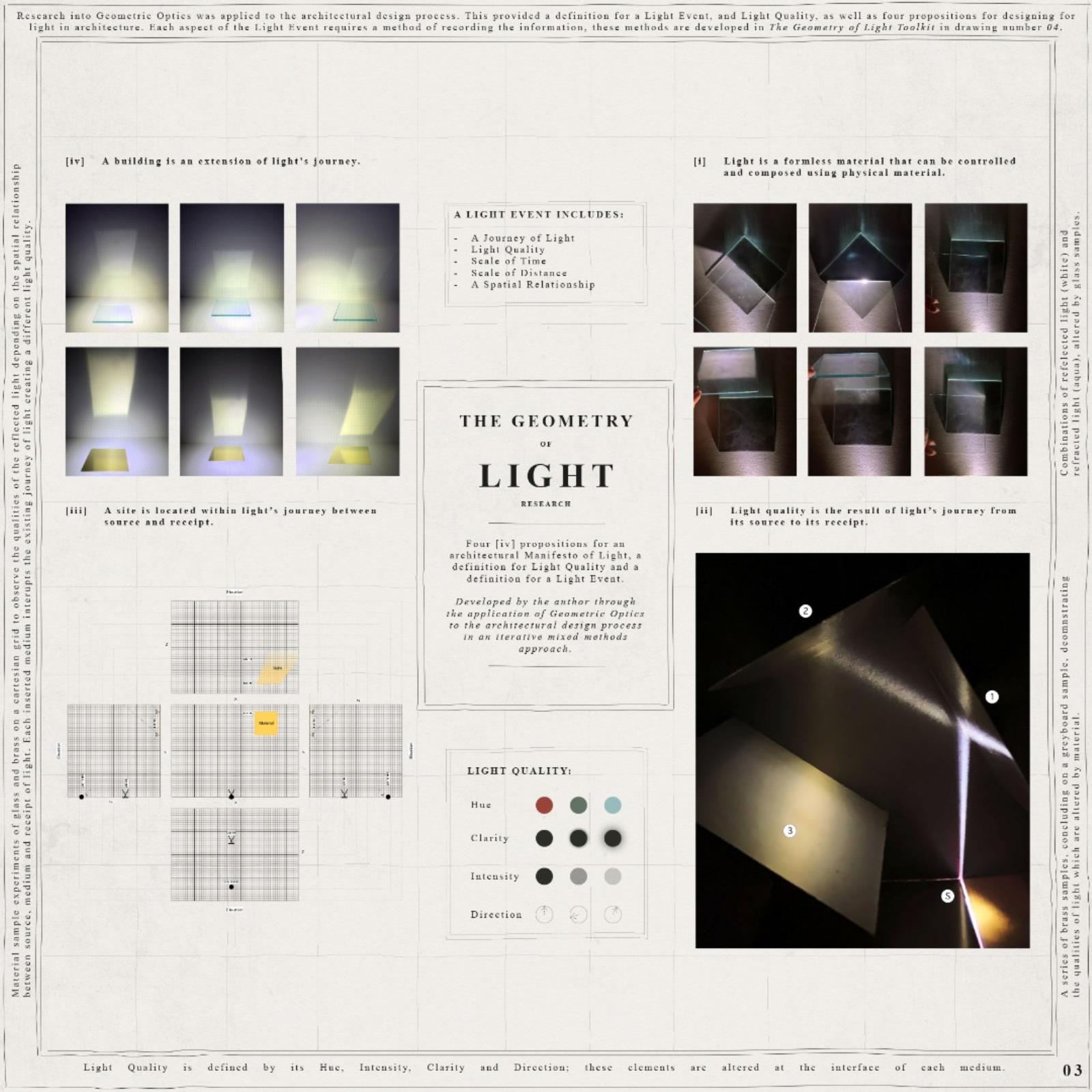 The Geometry of Light Part 2 Dissertation 2022 Rosie Somerville Oxford Brookes University Oxford | UK This thesis interrogates architects’ understanding of light, following my observation that light’s qualities were limited when seen through the modernist conception of ‘form’ in architecture. Quantum Physicist, Zajonc (1949 - present) states that our comprehension of light and our ‘conceptions of space have coevolved’. Current methods for designing with light overwhelmingly focus on light paired with shadow, revealing a form-based design approach. Kahn (1901-1974) and Le Corbusier (1887 - 1965) directly describe ‘structure’ and ‘form’ as the intervention required to mould light. Yet the perception of light is inextricably linked to both form and material. Whilst architects such as Zumthor (1943 - present) design with material light, a disseminated methodology isn’t available to the profession. With limited resources, architects are missing out on an aspect of architecture filled with rich opportunities. Taking precedent from Brunelleschi’s (1377 - 1446) application of geometric optics to devise the perspective drawing, this thesis applies a revised scientific theory of light, which now includes light’s interaction with matter, to the architectural design process. This research forms a new framework for light in architecture, culminating in a series of tools for architects to design through material light, enabling the translation from concept to design. Tutor(s) Hannah Durham Freya Wigzell