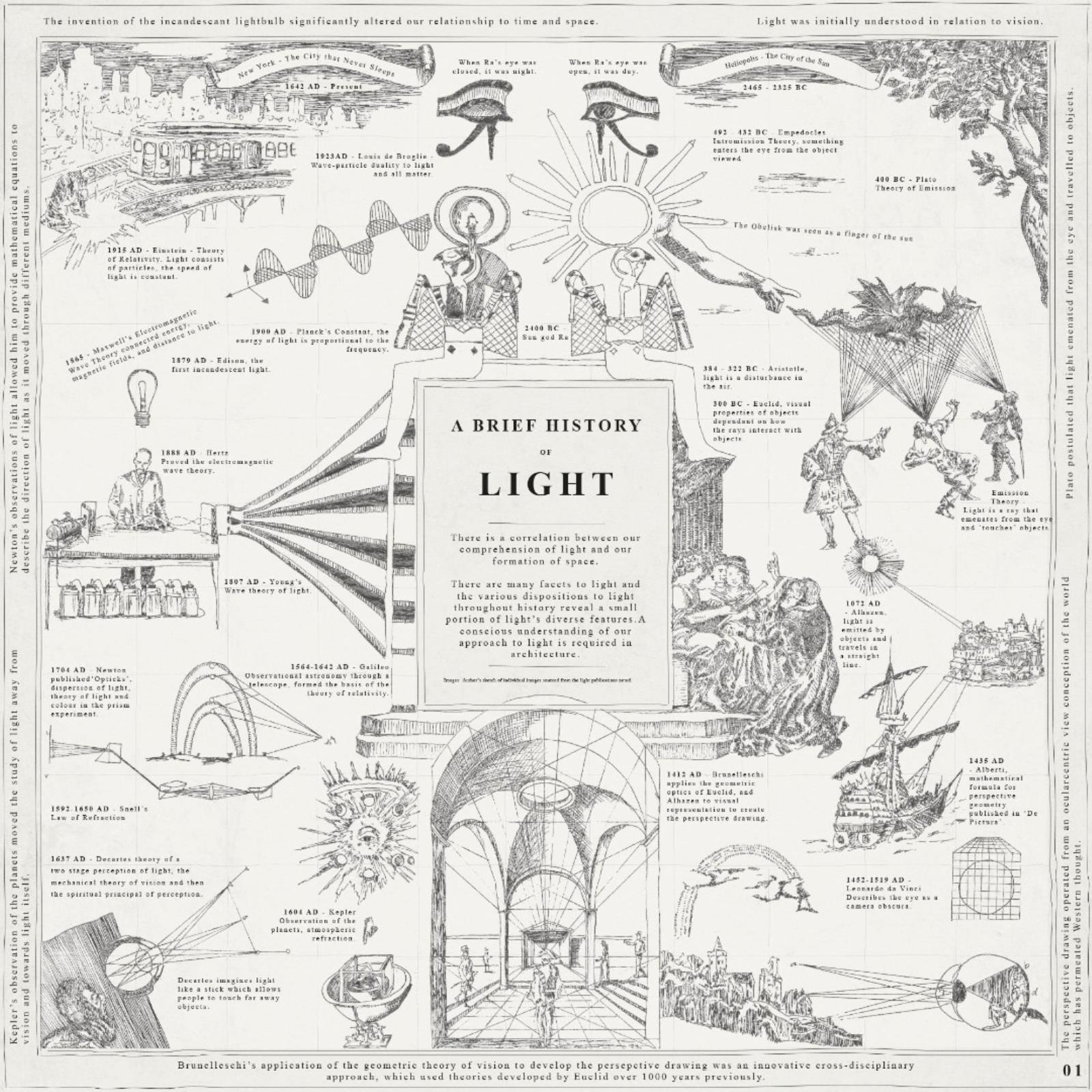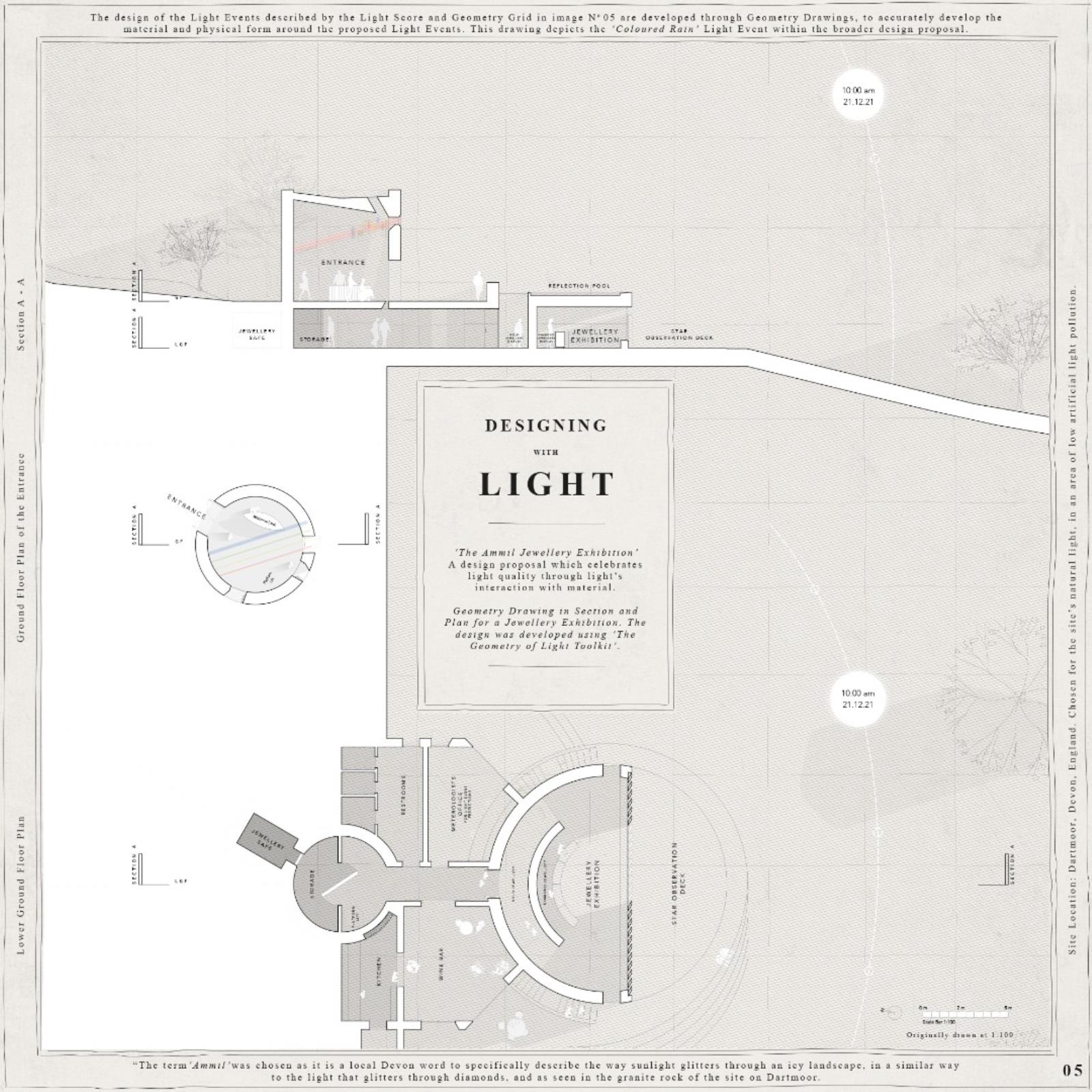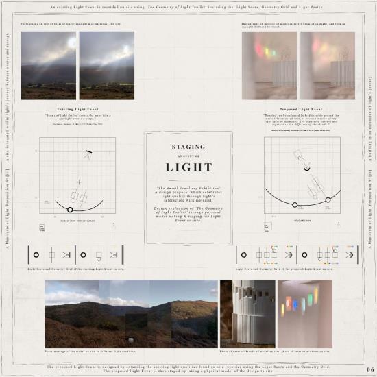 The Geometry of Light Part 2 Dissertation 2022 Rosie Somerville Oxford Brookes University Oxford | UK This thesis interrogates architects’ understanding of light, following my observation that light’s qualities were limited when seen through the modernist conception of ‘form’ in architecture. Quantum Physicist, Zajonc (1949 - present) states that our comprehension of light and our ‘conceptions of space have coevolved’. Current methods for designing with light overwhelmingly focus on light paired with shadow, revealing a form-based design approach. Kahn (1901-1974) and Le Corbusier (1887 - 1965) directly describe ‘structure’ and ‘form’ as the intervention required to mould light. Yet the perception of light is inextricably linked to both form and material. Whilst architects such as Zumthor (1943 - present) design with material light, a disseminated methodology isn’t available to the profession. With limited resources, architects are missing out on an aspect of architecture filled with rich opportunities. Taking precedent from Brunelleschi’s (1377 - 1446) application of geometric optics to devise the perspective drawing, this thesis applies a revised scientific theory of light, which now includes light’s interaction with matter, to the architectural design process. This research forms a new framework for light in architecture, culminating in a series of tools for architects to design through material light, enabling the translation from concept to design. Tutor(s) Hannah Durham Freya Wigzell
