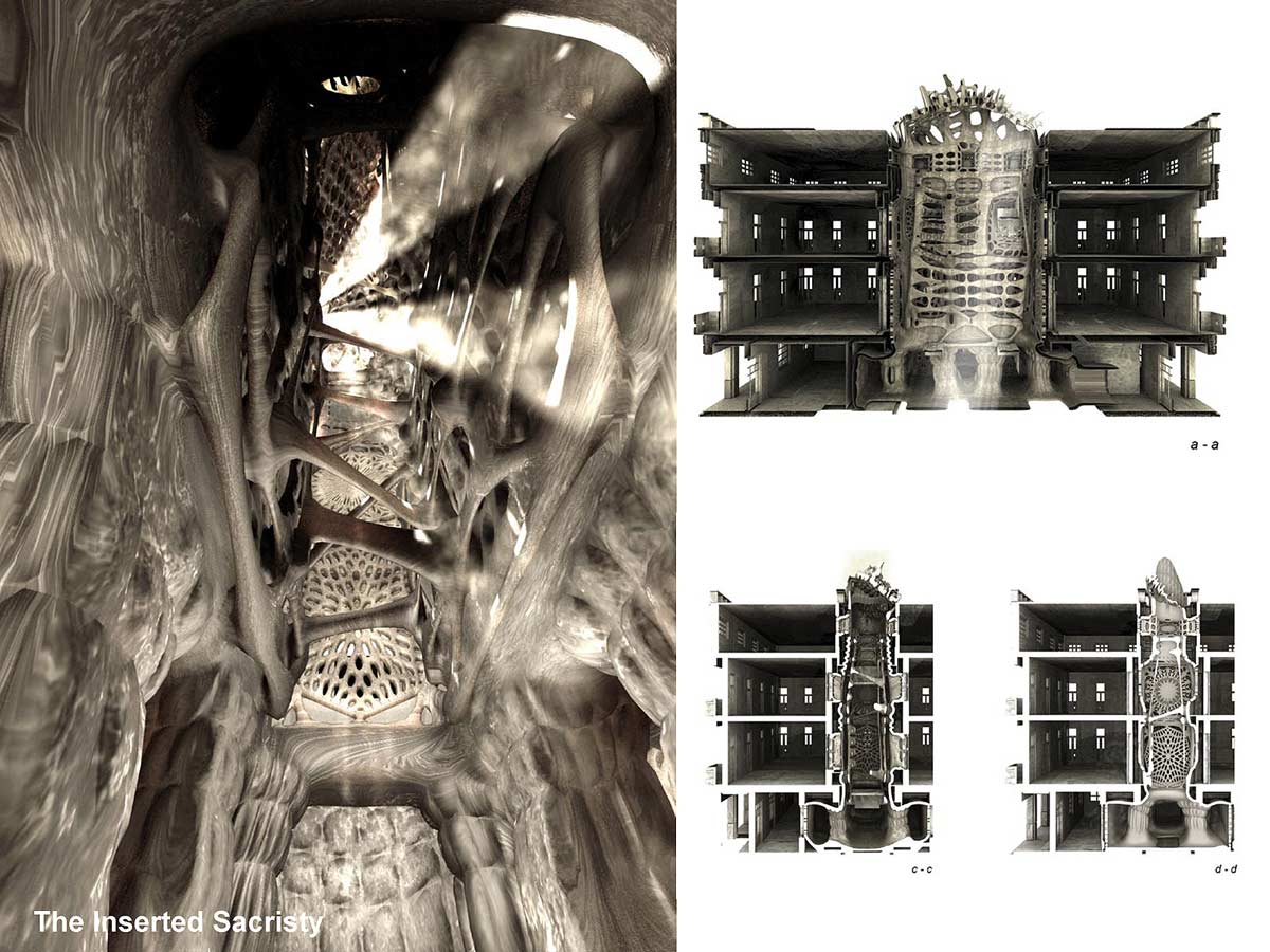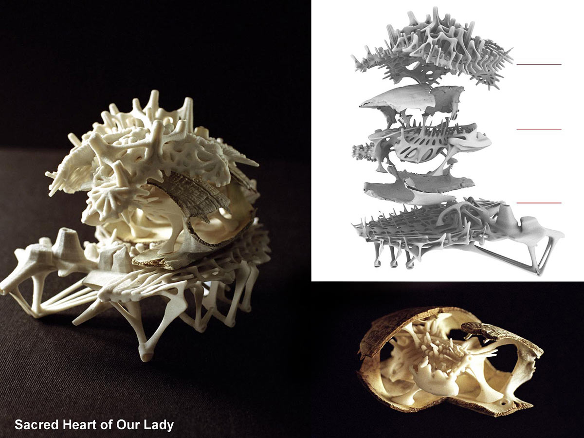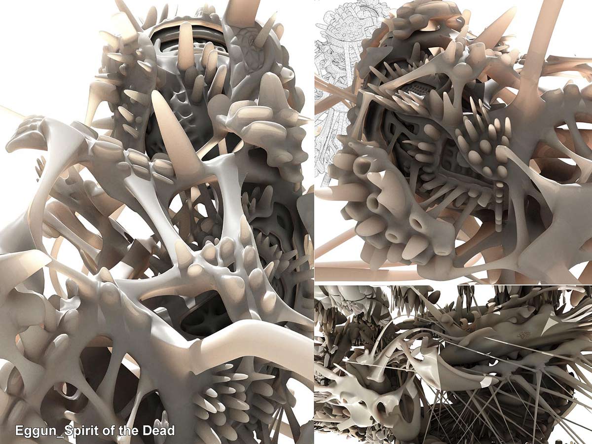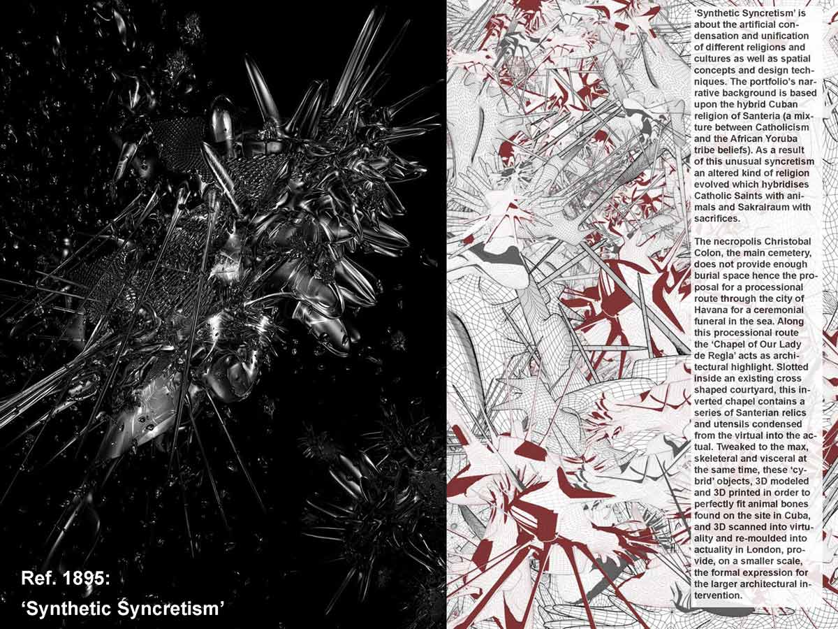 Synthetic Syncretism Part 2 Project 2006 Tobias Klein The Bartlett School of Architecture, UCL | UK ‘Synthetic Syncretism’The portfolio’s narrative background is based upon the hybrid Cuban Santeria religion—a mixture between Catholicism, African Yoruba tribe beliefs and Sakralraum with animal sacrifices.Due to lack of burial space on the necropolis in Havana, I propose a ceremonial processional funerary route through the city. Slotted inside an existing cross-shaped courtyard, the inverted ‘Chapel of Our Lady de Regla’ acts as architectural, ritual and cultural highlight. Its formal and structural expression is provided by a series of designed Santerian relics held inside the Sacristy—skeleteral and visceral utensils, 3D-modeled and 3D-printed in order to perfectly fit 3D-scanned animal bones. With a plethora of means of representations not available to the analogue practice, Tobias provides an impeccable example of syncretism of contemporary CAD techniques and CAD/CAM technologies with historical architectural references, site-specific design narratives, and intuitive non-linear design processes. Although digitally driven, he does not succumb to the pervasiveness of parametric protocols. His portfolio is more than the display of extraordinary 3D modeling and rendering skills, it is a virtuoso performance of patience, precision and tremendous creativity that re-enacts a challenging architectural conversation on ritualistic objects, pre-Modern typologies, and religious ornaments.Who wonders about his nickname ‘Gaudi on Acid’?