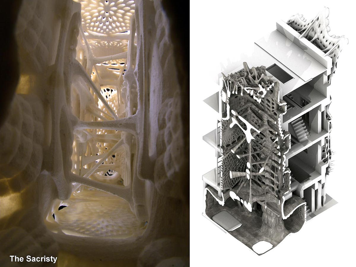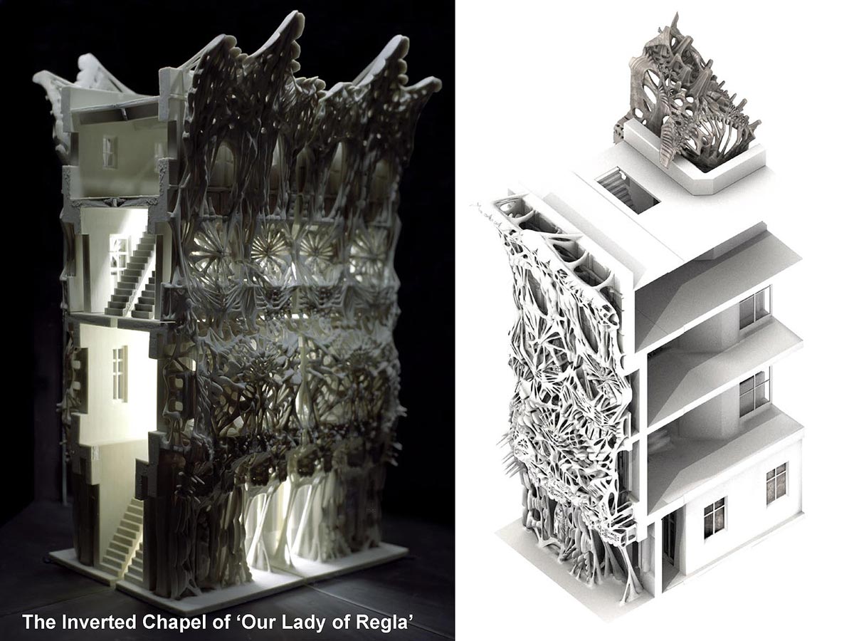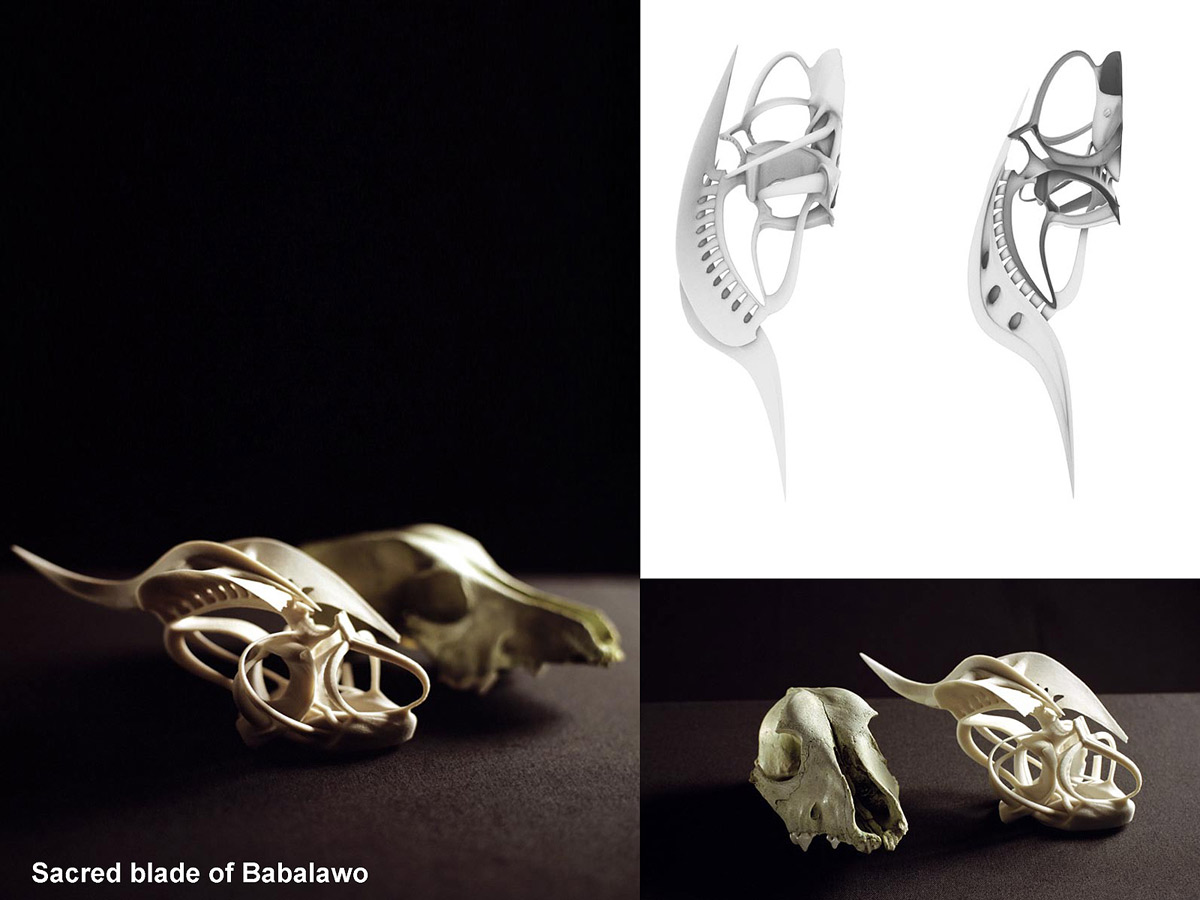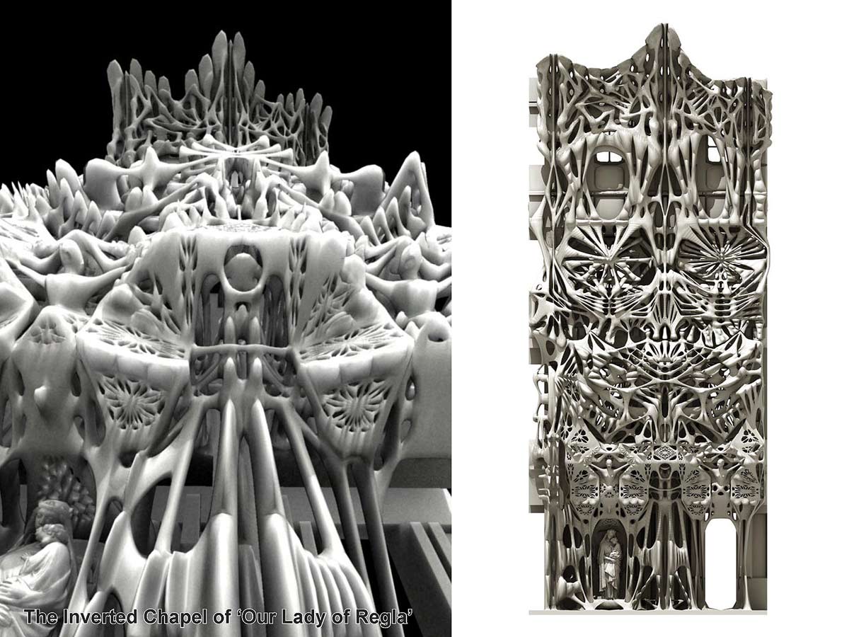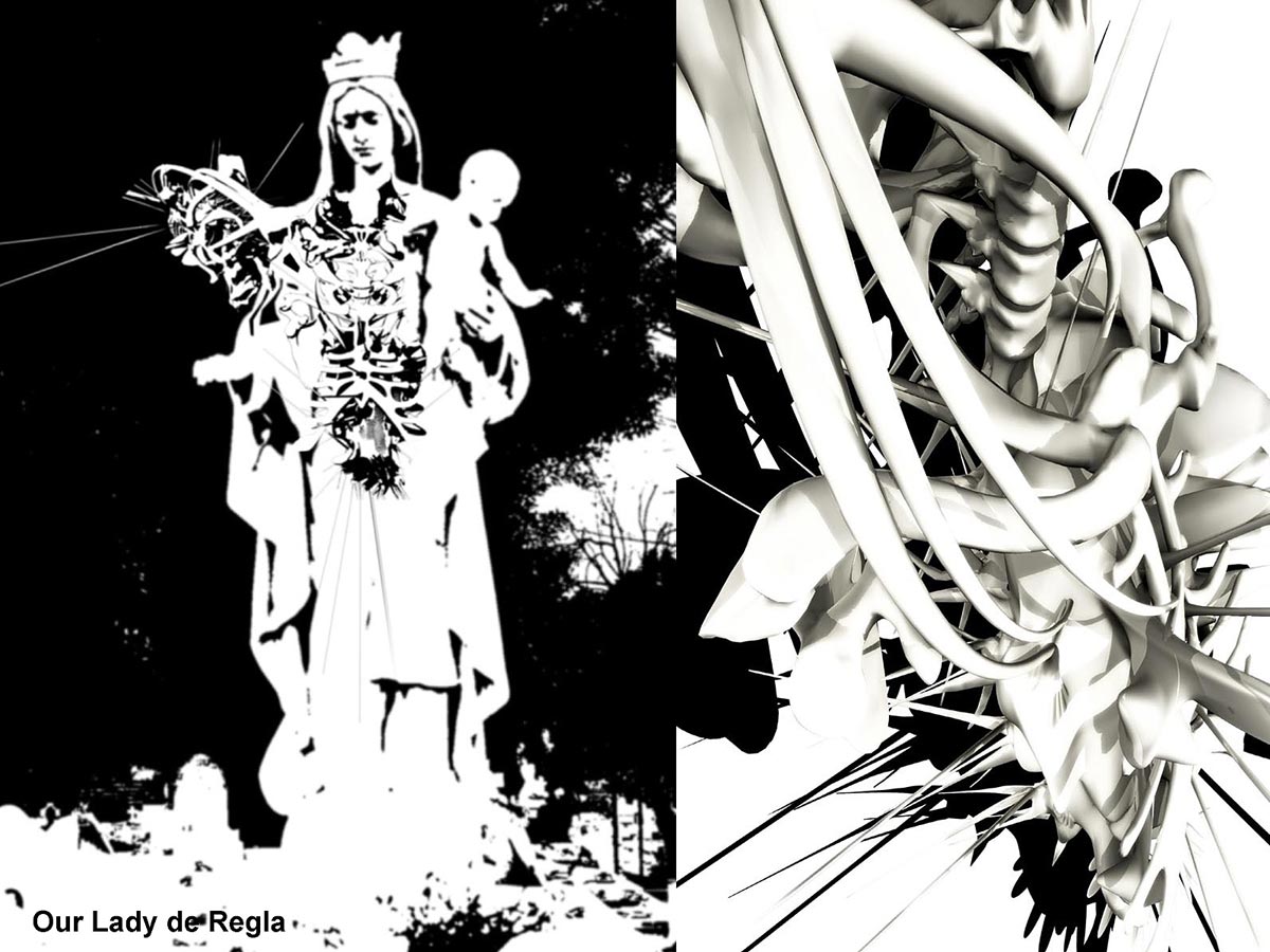 Synthetic Syncretism Part 2 Project 2006 Tobias Klein The Bartlett School of Architecture, UCL | UK ‘Synthetic Syncretism’The portfolio’s narrative background is based upon the hybrid Cuban Santeria religion—a mixture between Catholicism, African Yoruba tribe beliefs and Sakralraum with animal sacrifices.Due to lack of burial space on the necropolis in Havana, I propose a ceremonial processional funerary route through the city. Slotted inside an existing cross-shaped courtyard, the inverted ‘Chapel of Our Lady de Regla’ acts as architectural, ritual and cultural highlight. Its formal and structural expression is provided by a series of designed Santerian relics held inside the Sacristy—skeleteral and visceral utensils, 3D-modeled and 3D-printed in order to perfectly fit 3D-scanned animal bones. With a plethora of means of representations not available to the analogue practice, Tobias provides an impeccable example of syncretism of contemporary CAD techniques and CAD/CAM technologies with historical architectural references, site-specific design narratives, and intuitive non-linear design processes. Although digitally driven, he does not succumb to the pervasiveness of parametric protocols. His portfolio is more than the display of extraordinary 3D modeling and rendering skills, it is a virtuoso performance of patience, precision and tremendous creativity that re-enacts a challenging architectural conversation on ritualistic objects, pre-Modern typologies, and religious ornaments.Who wonders about his nickname ‘Gaudi on Acid’?