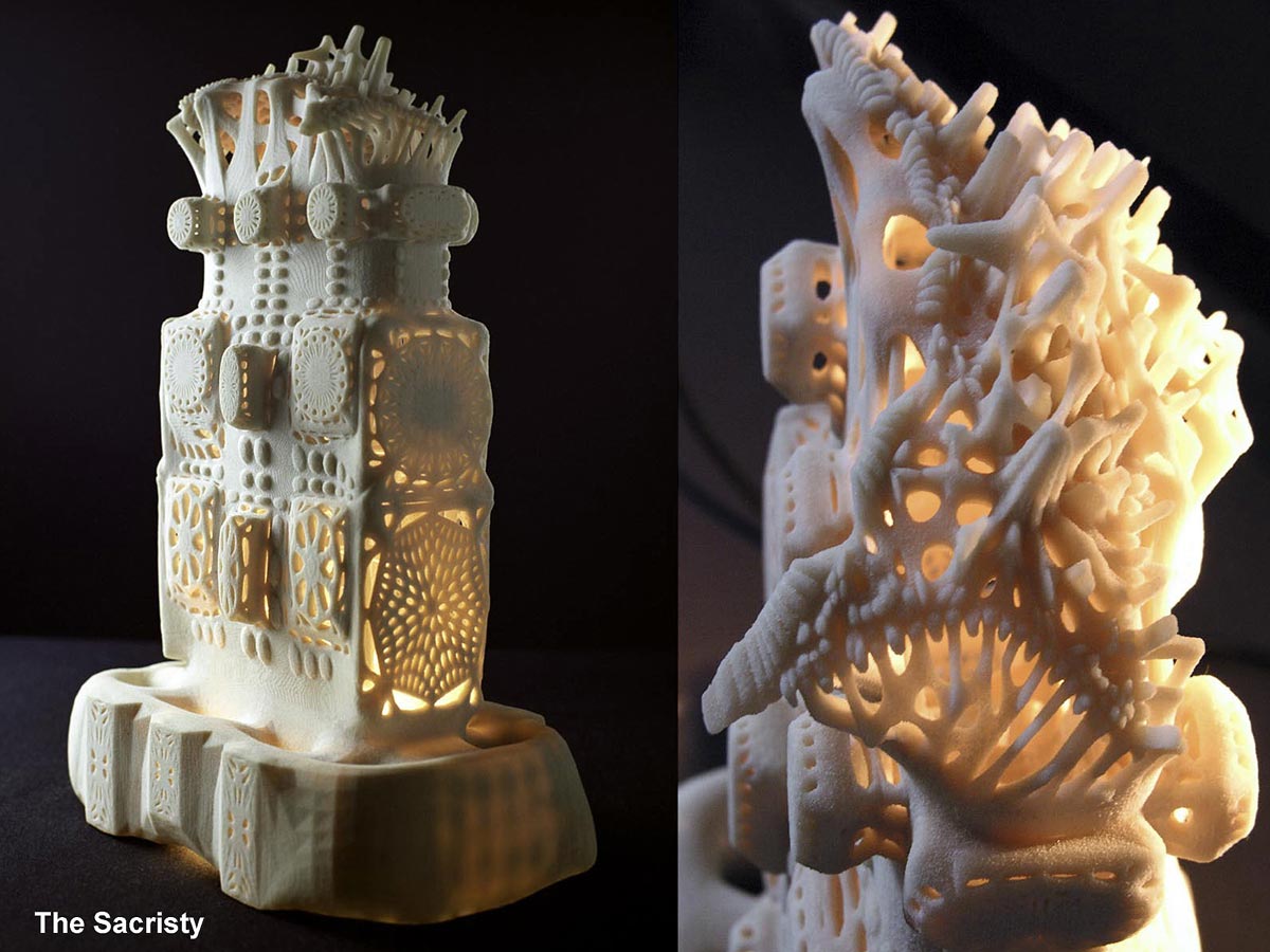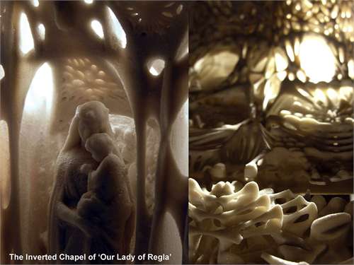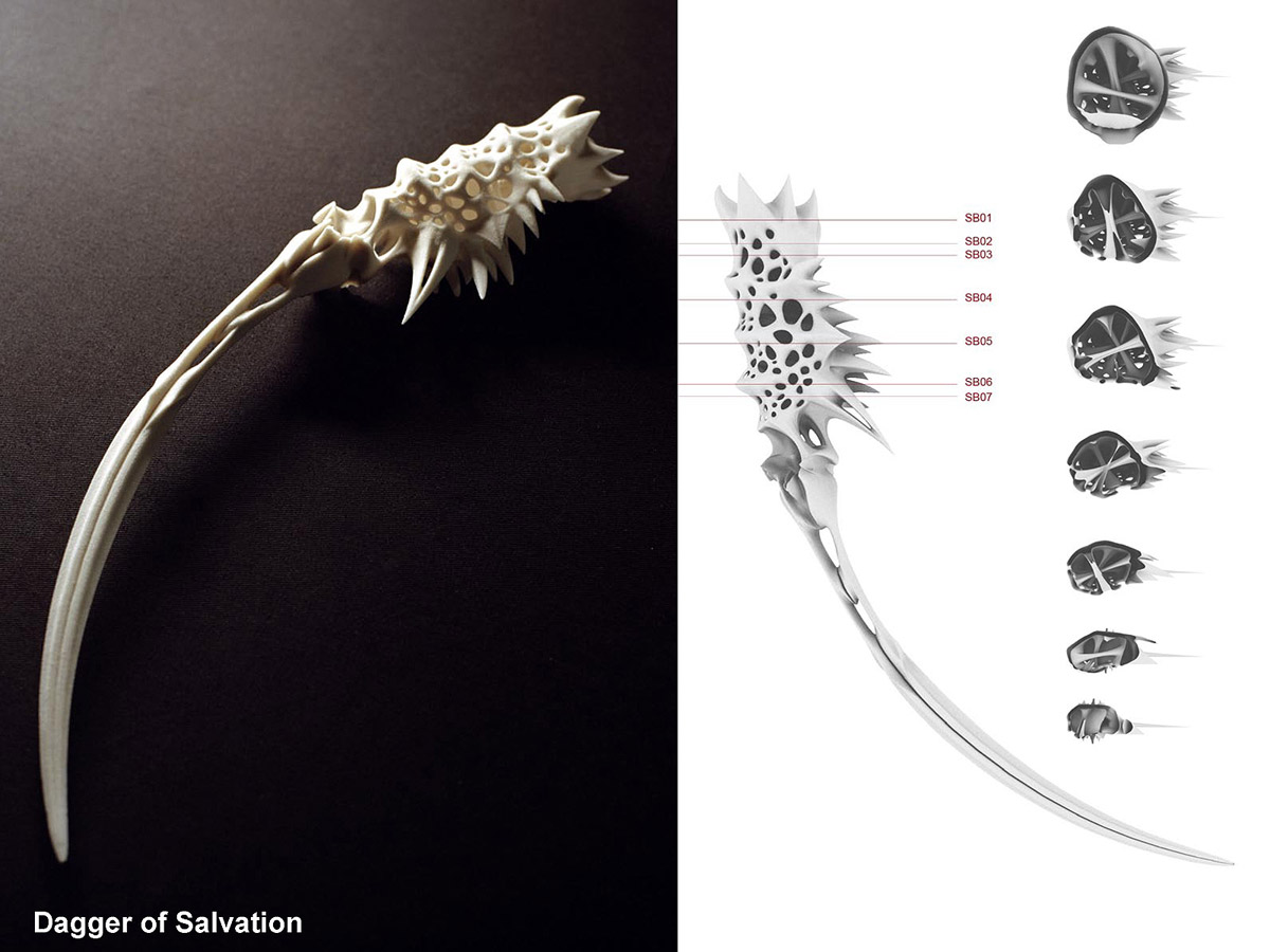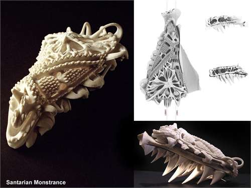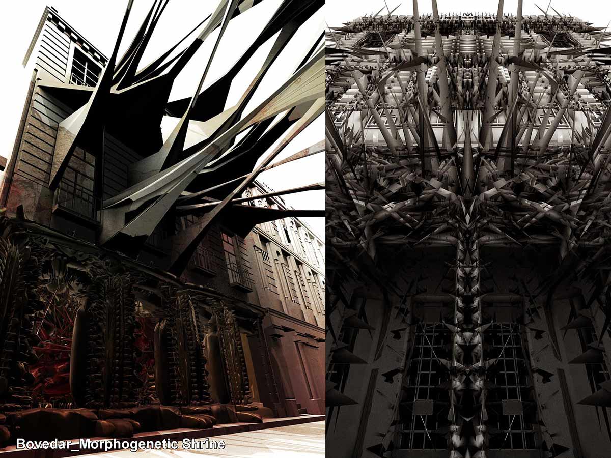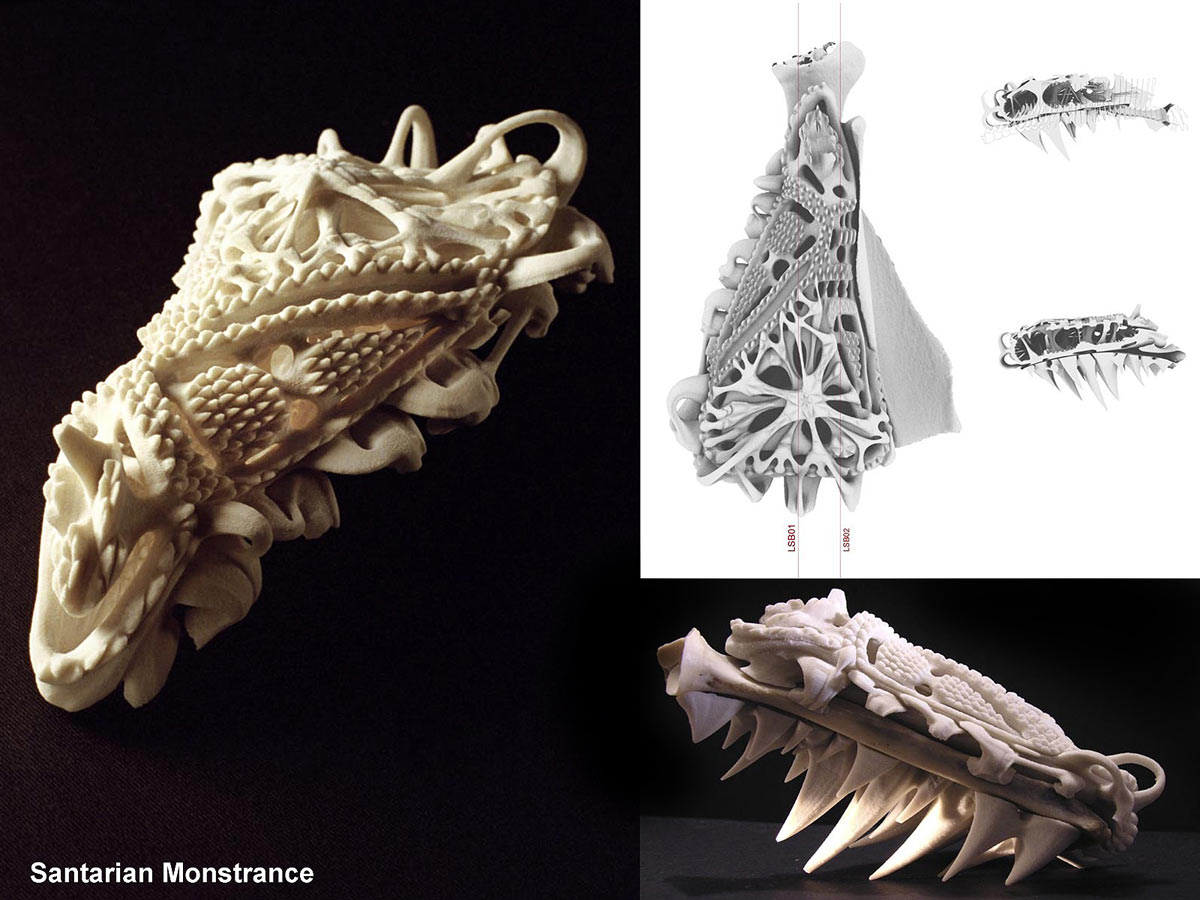 Synthetic Syncretism Part 2 Project 2006 Tobias Klein The Bartlett School of Architecture, UCL | UK ‘Synthetic Syncretism’The portfolio’s narrative background is based upon the hybrid Cuban Santeria religion—a mixture between Catholicism, African Yoruba tribe beliefs and Sakralraum with animal sacrifices.Due to lack of burial space on the necropolis in Havana, I propose a ceremonial processional funerary route through the city. Slotted inside an existing cross-shaped courtyard, the inverted ‘Chapel of Our Lady de Regla’ acts as architectural, ritual and cultural highlight. Its formal and structural expression is provided by a series of designed Santerian relics held inside the Sacristy—skeleteral and visceral utensils, 3D-modeled and 3D-printed in order to perfectly fit 3D-scanned animal bones. With a plethora of means of representations not available to the analogue practice, Tobias provides an impeccable example of syncretism of contemporary CAD techniques and CAD/CAM technologies with historical architectural references, site-specific design narratives, and intuitive non-linear design processes. Although digitally driven, he does not succumb to the pervasiveness of parametric protocols. His portfolio is more than the display of extraordinary 3D modeling and rendering skills, it is a virtuoso performance of patience, precision and tremendous creativity that re-enacts a challenging architectural conversation on ritualistic objects, pre-Modern typologies, and religious ornaments.Who wonders about his nickname ‘Gaudi on Acid’?