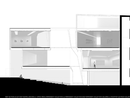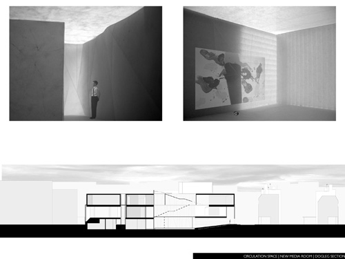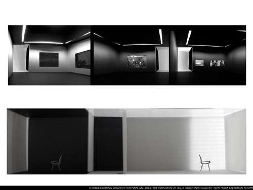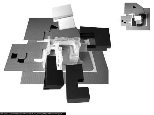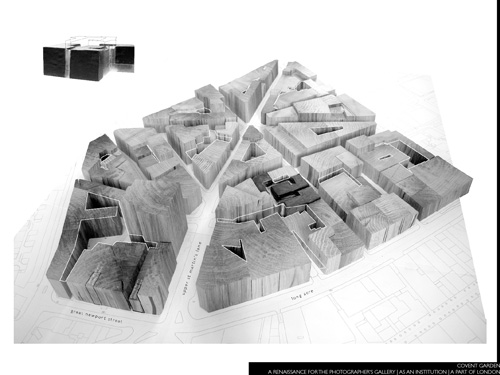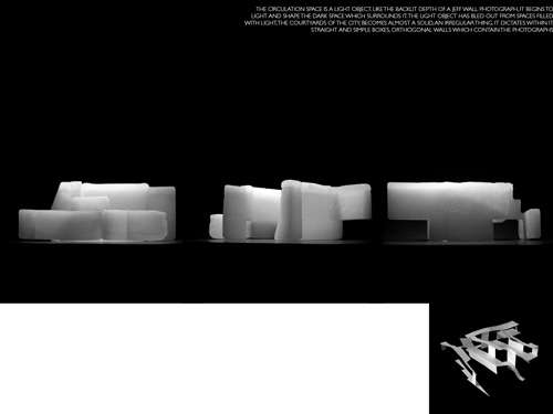 A project for the renaissance of The Photographer’s Gallery in Covent Garden. In an attempt to place architecture in space, as an object and as a place, a gallery circulation network is formed within a glowing light object. Like the backlit depth of a Jeff Wall photograph, it begins to light and shape the dark mass which surrounds it, it has bled out from spaces filled with light, the courtyards of the city, becomes almost a solid, an irregular thing. It dictates within it straight and simple boxes, orthogonal walls which contain the photographs.