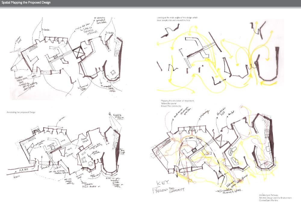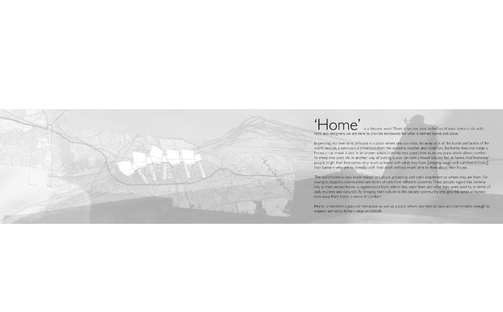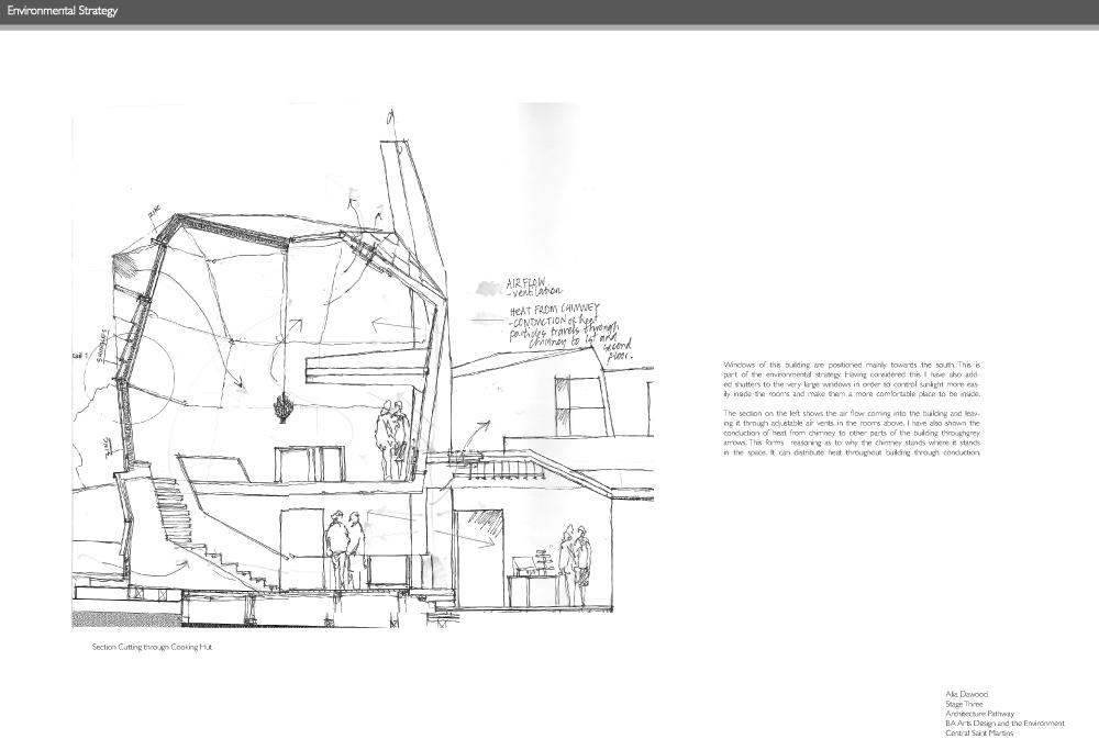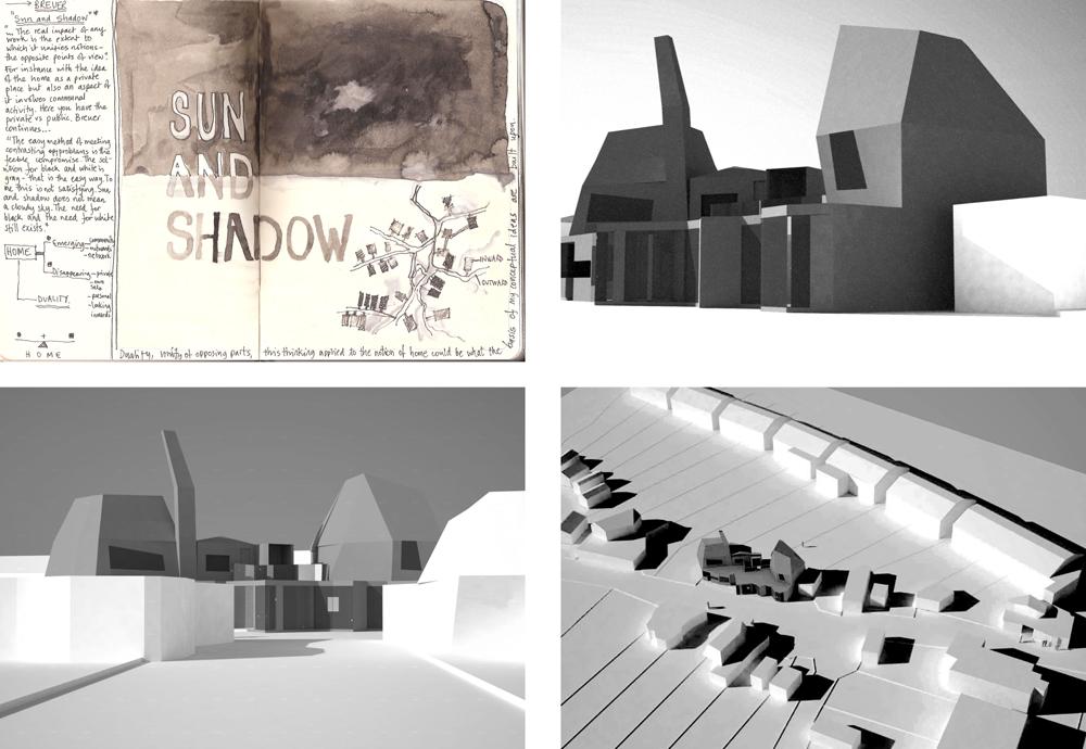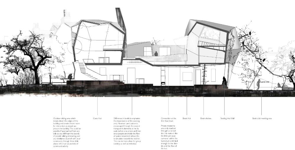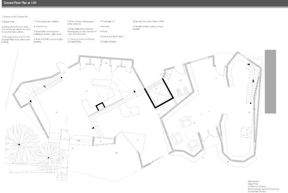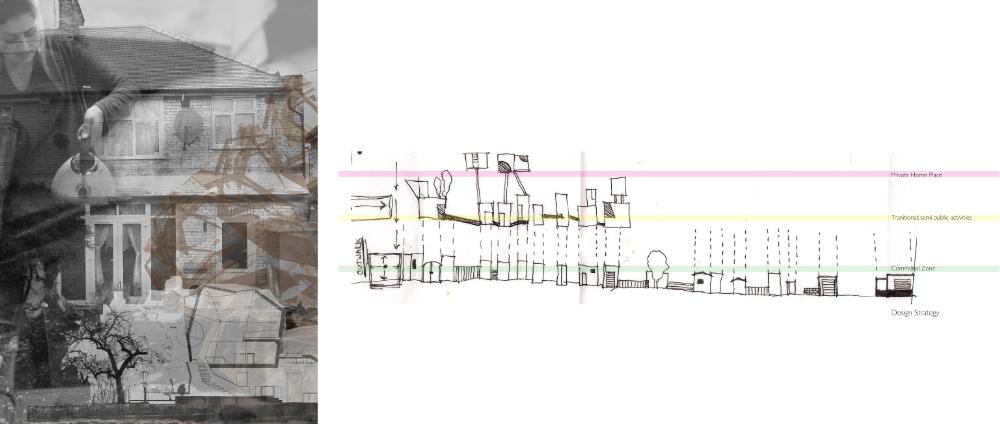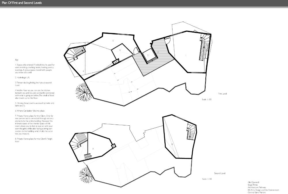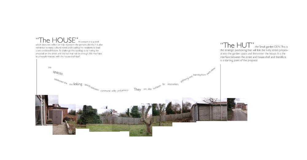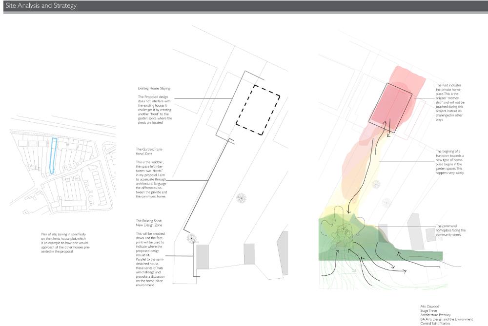 At the Bottom of the Garden Part 1 Project 2010 Alia Dawood Central Saint Martins, UAL | UK "Home" is described in literature as being related to the house, family, haven, self, gender and journeying. My own definition of the word 'home' is a place where one can dwell. It does not assume that the physical housing unit defines the experience of home. It connotates a more active and mobile relationship of individual to physical, social and psychological spaces around them. The proposed dwellings in "At the Bottom of the Garden" are investigating the idea of a new home within the city and identify the importance of the home as being place where one feels a strong sense of belonging to their surroundings."At the Bottom of the Garden" uses footprints of the traditional garden hut or shed as a trigger to re-defining and challenging the idea of the typical terraced house typology. Based in the suburbs of West London and on a community of terrraced houses, which surround my aunt's house, the project places equal emphasis on the communal funcations as well as the intimate functions of the home. These are two different points of view, which are unified through the project. They are contrasting problems, which are answered through these specific huts located at the back of the garden. Breuer writes:"...the easy method of meeting contrasting problems is the feeble compromise. The solution for black and white is grey - that is the easy way. To me that is not satisfying. Sun and Shadow does not mean a cloudy sky. The need for black and the need for white still exists.""At the Bottom of the Garden" looks towards a new kind of home-place where interactions can be private and communal - where activities can be performed alone and as a collective. These interactions take place in duality. This is a project both of personal exploration, through the student using their aunt as a 'client', and a profoundly careful study of typology and ontology. The project asks us not only what is a 'home' but also explores the relationship between the individual and the community.Based on close examination of the occupations and activities of the 'residents' of a single row of terraced houses, the project seeks to extract some of the personal activities (baking, joinery, etc.) in order to redefine the way that a community works with each other and individually. The new spaces of interaction, the 'huts' at the bottom of the garden, become both a new 'street' (by offering up a new frontage) and individual spaces of action and privacy.The project is presented through a combination of characterful hand drawings, bringing an idiosyncratic character to the views, and through well defined and articulated technical drawings.Overall, this is a project which asks questions through a set of highly specific propositions and presentations. Tutor(s)Mr Nasser GolzariMr Geoffrey Makstutis