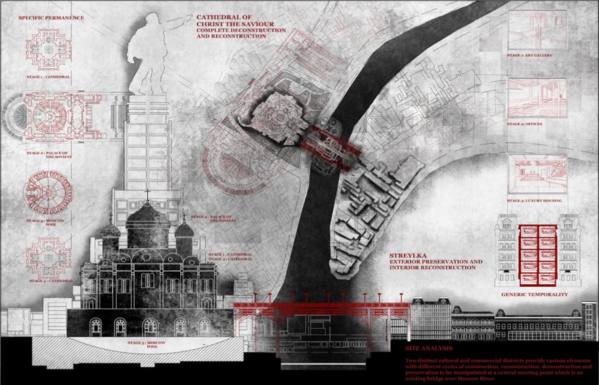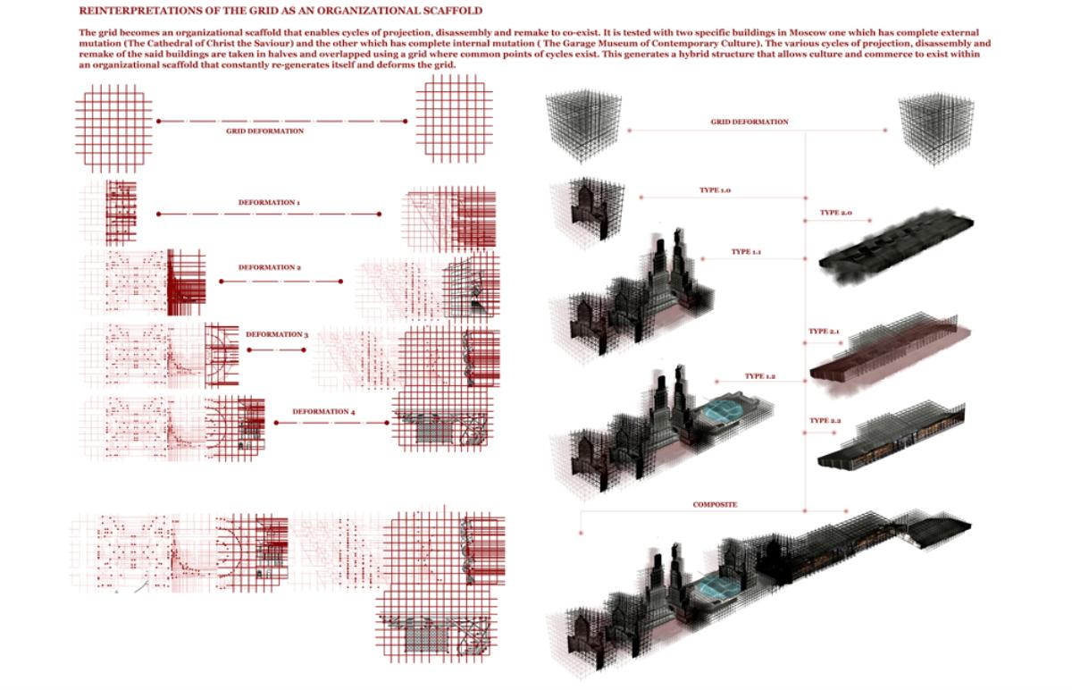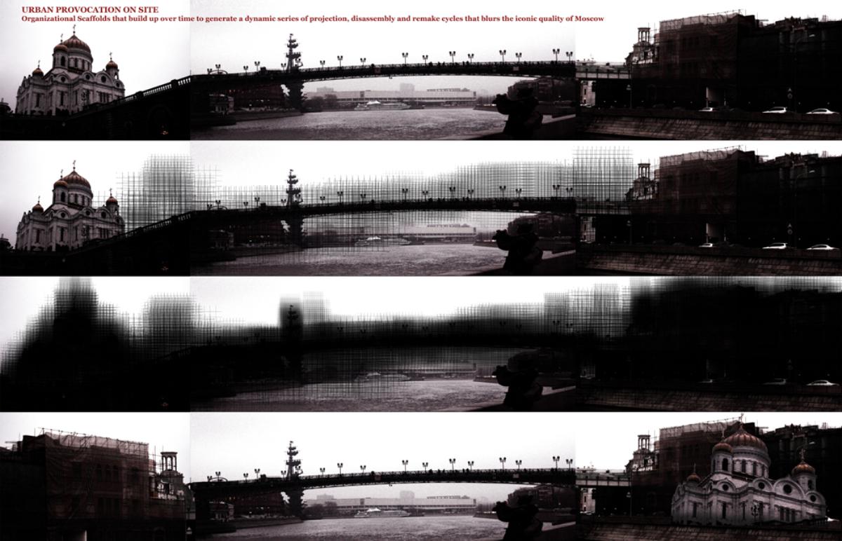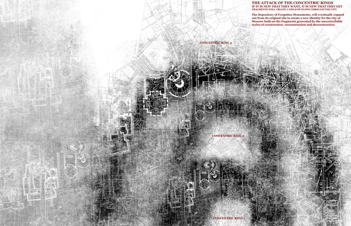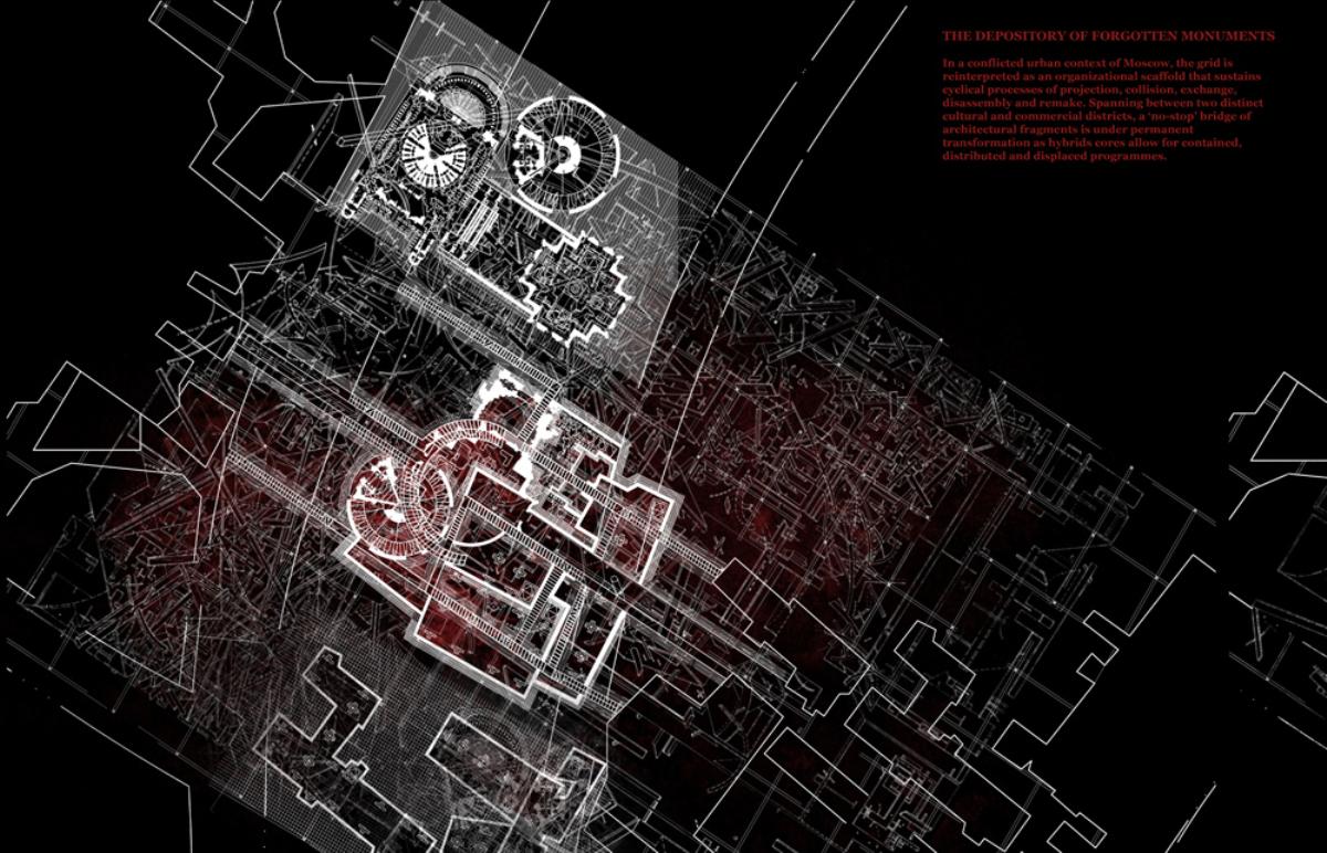 The Depository of Forgotten Monuments Part 1 Project 2012 Vidhya Pushpanathan Architectural Association London | UK In the effort to balance local identity with global influences, Moscow has been subject to simultaneous spurts of renewal and reversal. Paradoxically, continuous deconstruction and reconstruction define the city’s state as in-between preserved historical monuments and remakes vs. contemporary transplants and additions, blurring oppositions between original and fake, old and new, generic and specific. Such contradictory forces and processes are legible in layers of fragments and clusters of displaced programs and events. As part of the tension between cultural and commercial venues, both static landmark museums and dynamic commercial gallery enterprises call for new mediating design positions. Addressing Moscow’s paradox of deconstruction and reconstruction, the “Depository of Forgotten Monuments” puts forward a flexible architectural framework that takes into account conflicted urban processes, structures and programs. As both a curatorial strategy and an urban prototype, it defines a hybrid between cultural and commercial art sites and allows for the co-existence of past and future as part of the transient collection of architectural replicas, quotations, and mediations. The Depository expands the logic of the three-dimensional grid as an organizational scaffold that can support cyclical and incomplete processes of construction, collision, deconstruction, exchange, reconstruction, and so forth. The scaffolding system nurtures new symbiotic relationships between fragmented structures, spaces and programs, supporting provisional orders within a seemingly chaotic accumulation. Poised as a ‘no-stop’ bridge and time-link between two symptomatic palimpsest districts on either side of Moskva River – the resurrected complex of the Cathedral of Christ the Savior and the re-appropriated post-industrial Streylka Island – the Depository helps concentrate fragments sourced from dissimilar city periods and sites. The bridge matrix includes key ‘condenser’ cores that attract dissimilar formal sectors while supporting contained, distributed and displaced programmes. With both form and program in flux, the external blurred image of incomplete silhouettes and overlapping spatial grids is deliberately at odds with the internal daily events, seasonal festivals, visiting gallery installation and resident cultural institutions. The depository will slowly expand to eventually consume the city of Moscow in order to generate the process of urban renewal that Tutor(s) Maria Fedorchenko Tatiana von Preussen