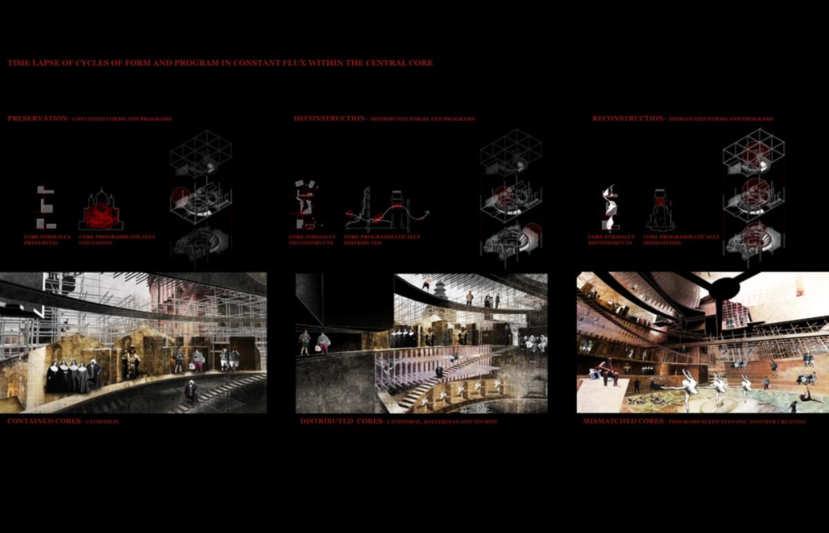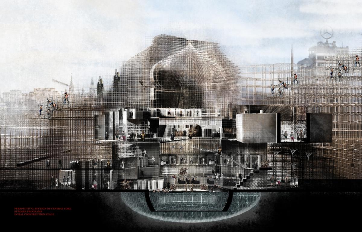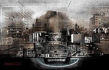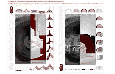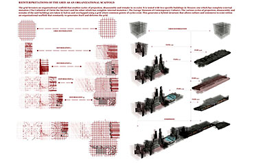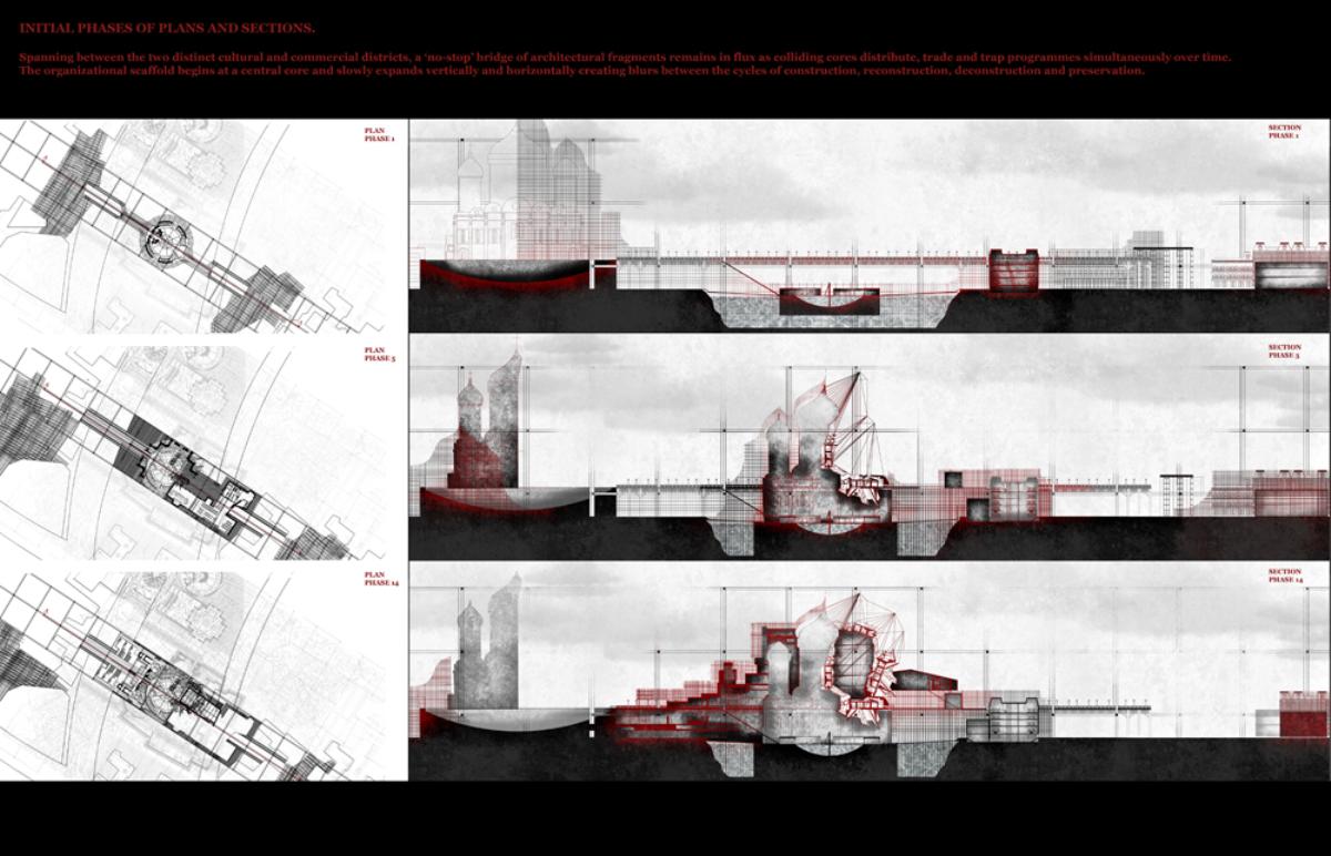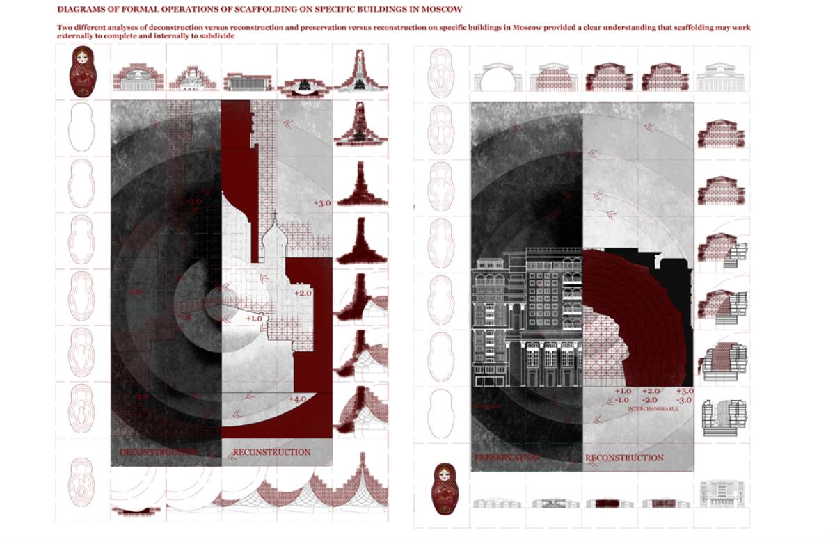 The Depository of Forgotten Monuments Part 1 Project 2012 Vidhya Pushpanathan Architectural Association London | UK In the effort to balance local identity with global influences, Moscow has been subject to simultaneous spurts of renewal and reversal. Paradoxically, continuous deconstruction and reconstruction define the city’s state as in-between preserved historical monuments and remakes vs. contemporary transplants and additions, blurring oppositions between original and fake, old and new, generic and specific. Such contradictory forces and processes are legible in layers of fragments and clusters of displaced programs and events. As part of the tension between cultural and commercial venues, both static landmark museums and dynamic commercial gallery enterprises call for new mediating design positions. Addressing Moscow’s paradox of deconstruction and reconstruction, the “Depository of Forgotten Monuments” puts forward a flexible architectural framework that takes into account conflicted urban processes, structures and programs. As both a curatorial strategy and an urban prototype, it defines a hybrid between cultural and commercial art sites and allows for the co-existence of past and future as part of the transient collection of architectural replicas, quotations, and mediations. The Depository expands the logic of the three-dimensional grid as an organizational scaffold that can support cyclical and incomplete processes of construction, collision, deconstruction, exchange, reconstruction, and so forth. The scaffolding system nurtures new symbiotic relationships between fragmented structures, spaces and programs, supporting provisional orders within a seemingly chaotic accumulation. Poised as a ‘no-stop’ bridge and time-link between two symptomatic palimpsest districts on either side of Moskva River – the resurrected complex of the Cathedral of Christ the Savior and the re-appropriated post-industrial Streylka Island – the Depository helps concentrate fragments sourced from dissimilar city periods and sites. The bridge matrix includes key ‘condenser’ cores that attract dissimilar formal sectors while supporting contained, distributed and displaced programmes. With both form and program in flux, the external blurred image of incomplete silhouettes and overlapping spatial grids is deliberately at odds with the internal daily events, seasonal festivals, visiting gallery installation and resident cultural institutions. The depository will slowly expand to eventually consume the city of Moscow in order to generate the process of urban renewal that Tutor(s) Maria Fedorchenko Tatiana von Preussen