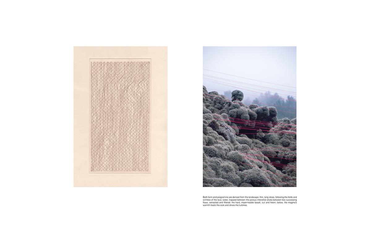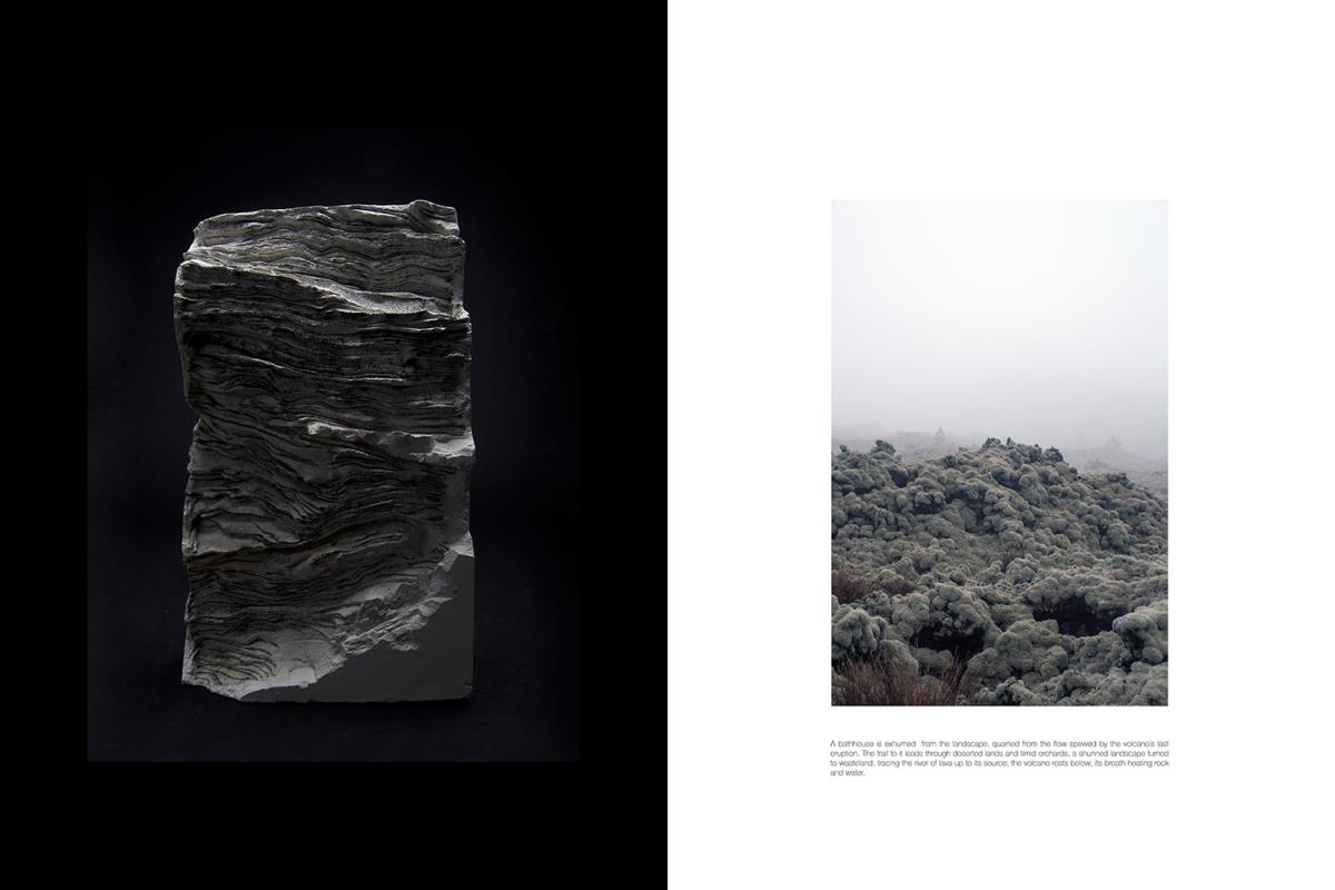 A bathhouse emerges from a quarry, carved from the flow spewed by the volcano’s last eruption. A trail through deserted lands and timid orchards, a shunned landscape turned to wasteland, tracing the river of lava up to its source; the volcano rests below, its breath heating rock and water.