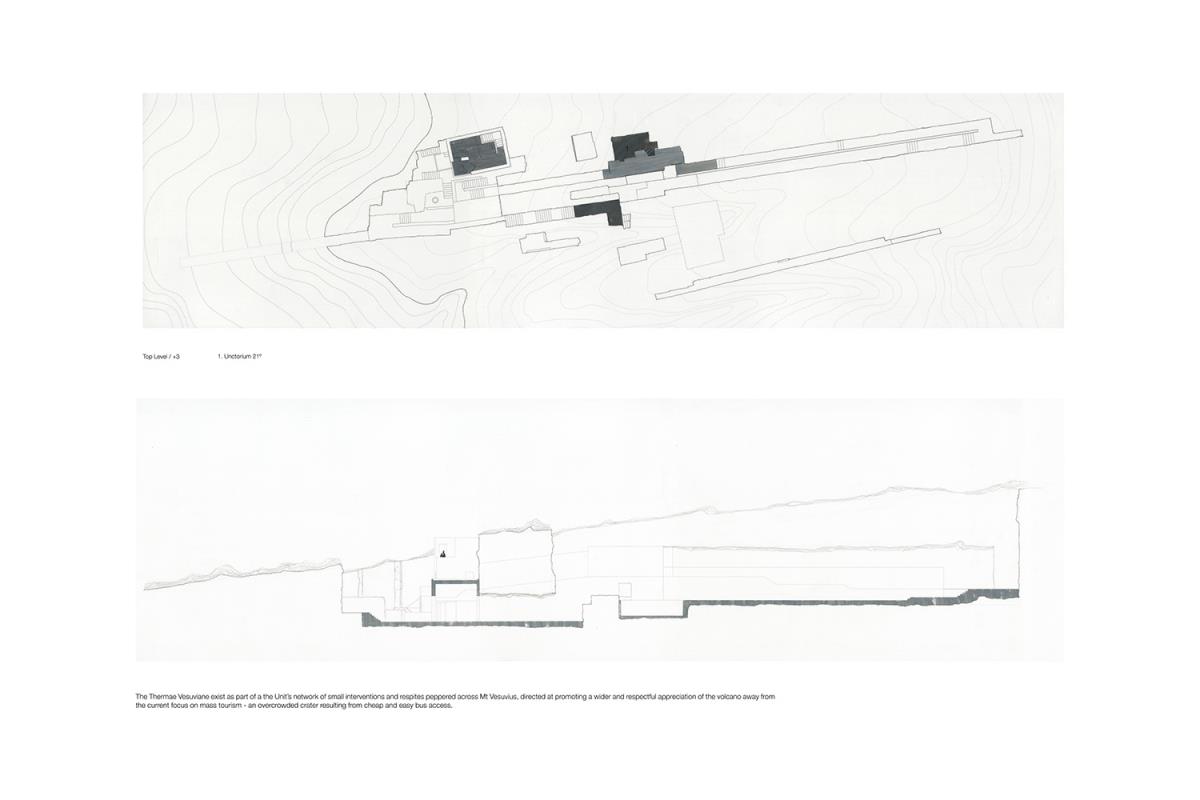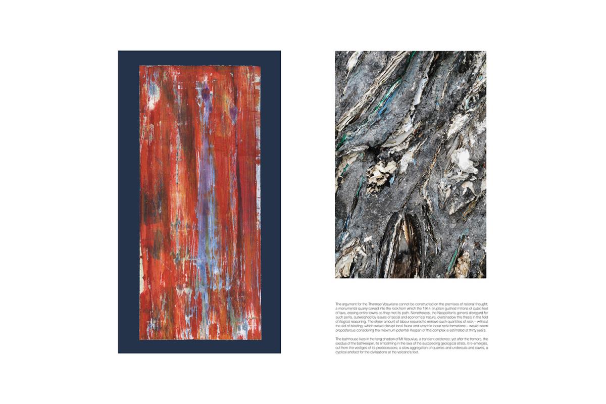 The bathhouse lives in the long shadow of Mt Vesuvius, a transient existence; yet after the tremors, the exodus of the bathkeeper, its embalming in the lava of the succeeding geological strata, it re-emerges, cut from the vestiges of its predecessors; a slow aggregation of quarries and undercuts and caves, a cyclical artefact for the civilisations at the volcano’s feet.