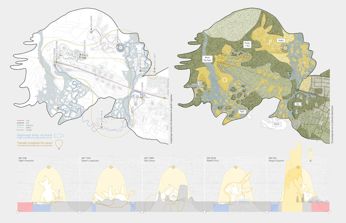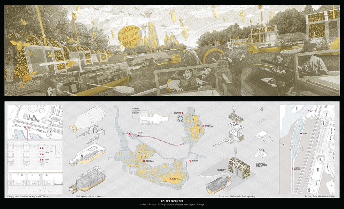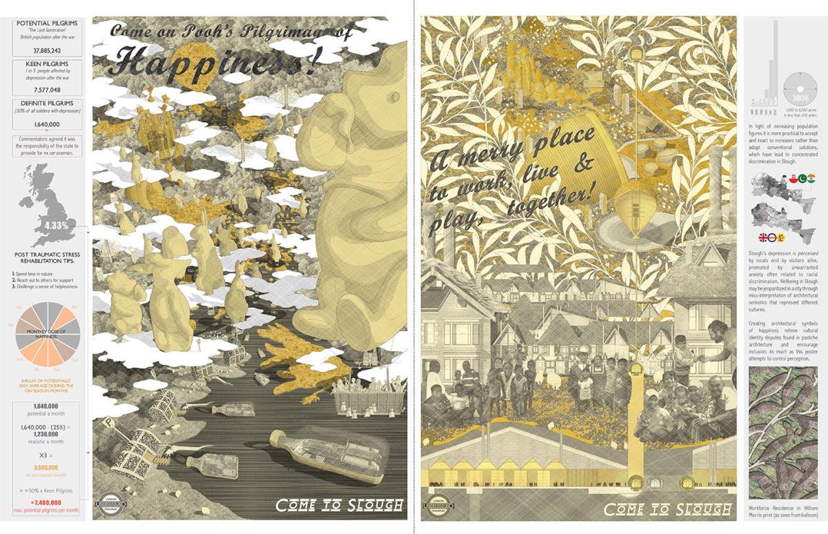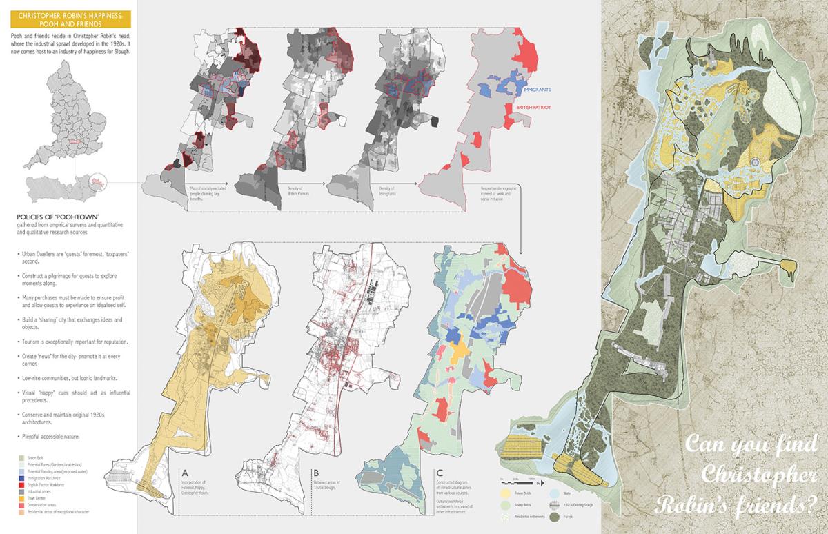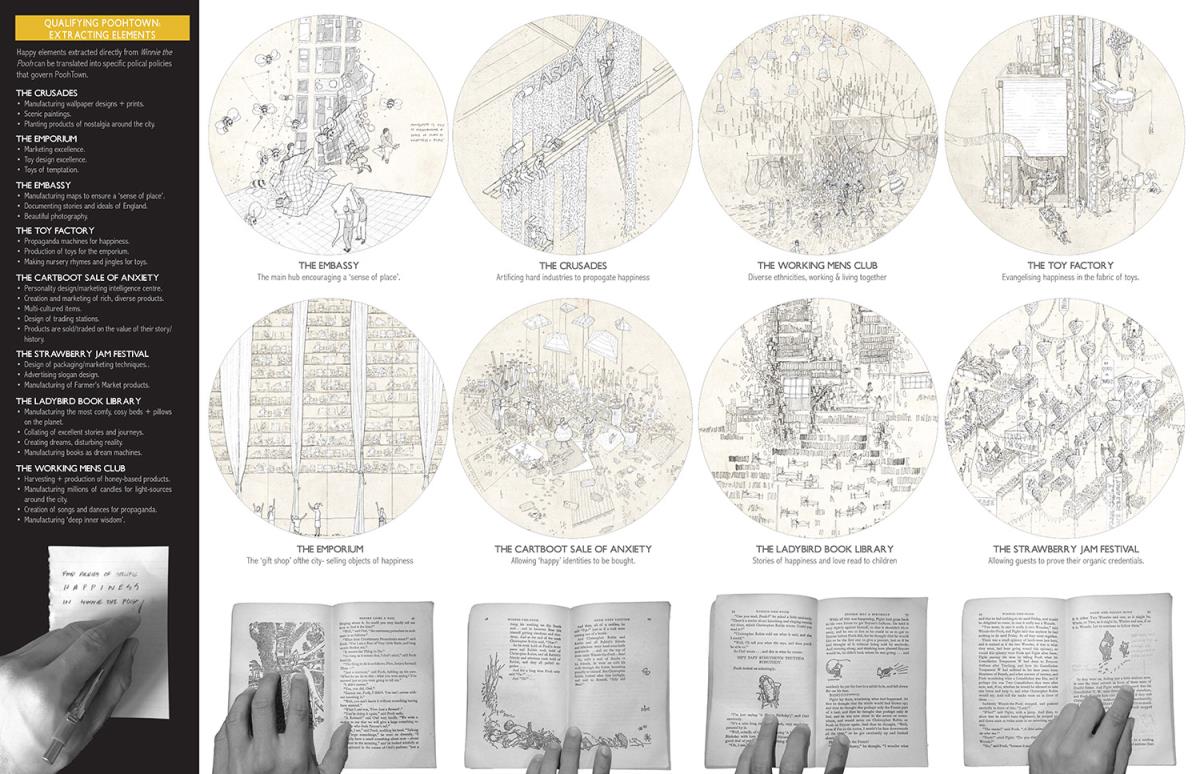 PoohTown Part 2 Project 2014 Nick Elias The Bartlett School of Architecture, UCL | UK In A.A.Milne’s ‘Winnie the Pooh’ a happy world is constructed fictitiously from an unhappy, real, Christopher Robin. During its publishing date in the 1920s, industry took off in Slough after the war and the town quickly became a place of unhappiness and social exclusion. For the project, 1920s Slough is revisited to capitalise from the economy of ‘happiness’ as an alternative industry using Winnie the Pooh as a metaphorical protagonist for happiness.Slough and many cities like it ache to be peaceful, happy and socially inclusive. Slough has long since been perceived as being home to much deprivation since the industrial sprawl in the 1920s. PoohTown, aims to re-evaluate covert responses to socio-political exclusion by proposing ‘happy’ architectures where residents can live, work and play together in a sustainable economic network. PoohTown also philosophises over today’s cities potential to prescribe policies of happiness alongside familiar amenities; a concept worryingly absent in today's city planning. Through empirical research it was clear that most people are happiest when playing an idealised, fictional, representation of themselves – from putting make-up on to proving their organic credentials at the farmers' market. Guests to PoohTown indulge in this tendency and become the fictional, happy, Christopher Robin by visiting Pooh and friends (each representatives of a specific ‘happiness’) on a proposed pilgrimage.This speculative proposal is a device, a thought experiment, enabling the potential of a happily-ever-after to be explored beyond the limitations of Slough’s industrial sprawl ambitions in the 1920s.PoohTown has taught me to explore methods of applying knowledge rather than relying on transient technical knowledge to facilitate design. I believe such a project exposed transferable methods and reasoning, allowing me to tackle design from a more personal, anthropological & emotional scale. PoohTown questions the raw matter of what humans want: In designing for emotion, happiness, it has been possible to test the purpose of architecture in a changing world. PoohTown therefore proposes it is more sustainable to design infrastructure for an emotional state; for if we are content through it, we may ask less from the Earth to satisfy our physical state. Tutor(s) Mr Bernd FelsingerMr C J Lim